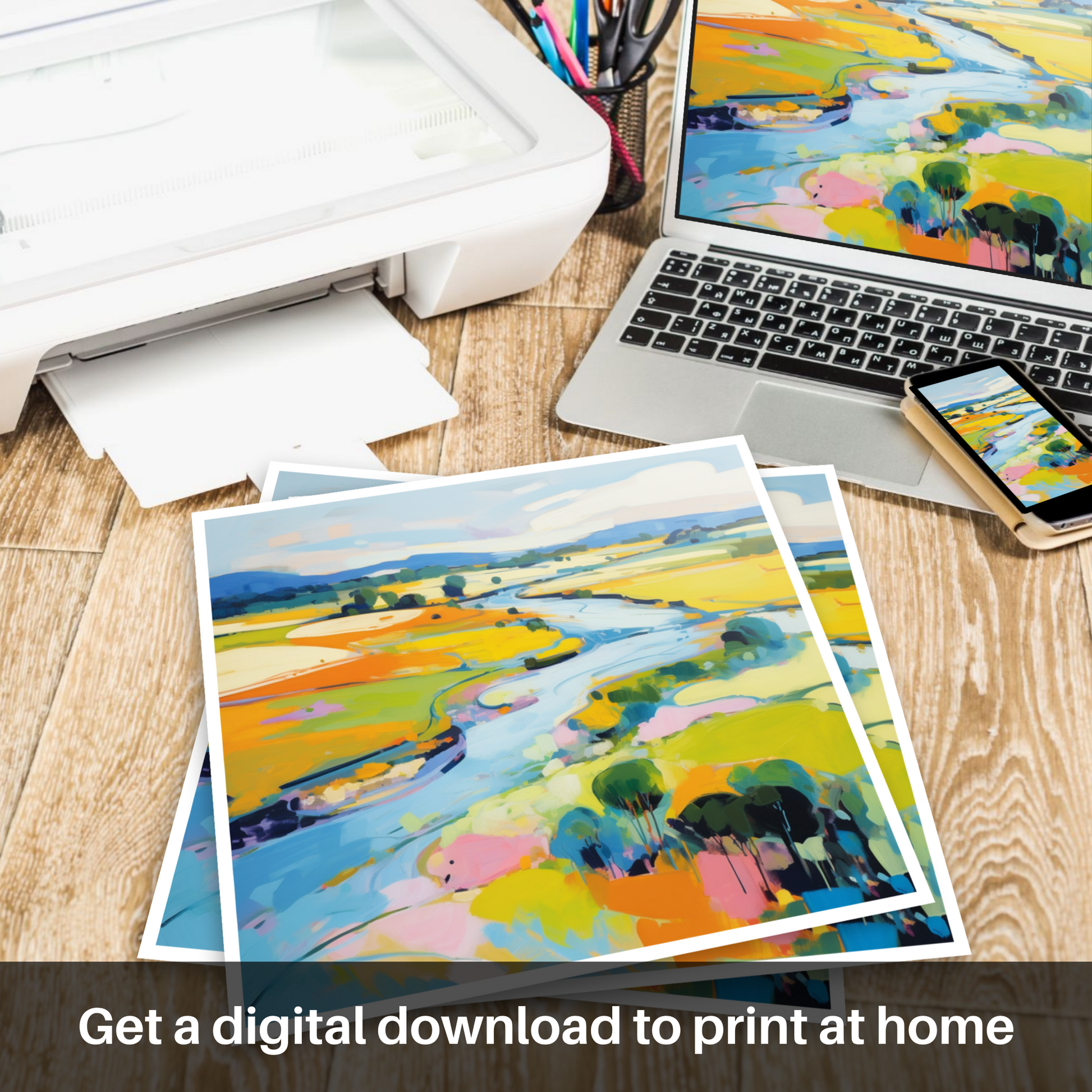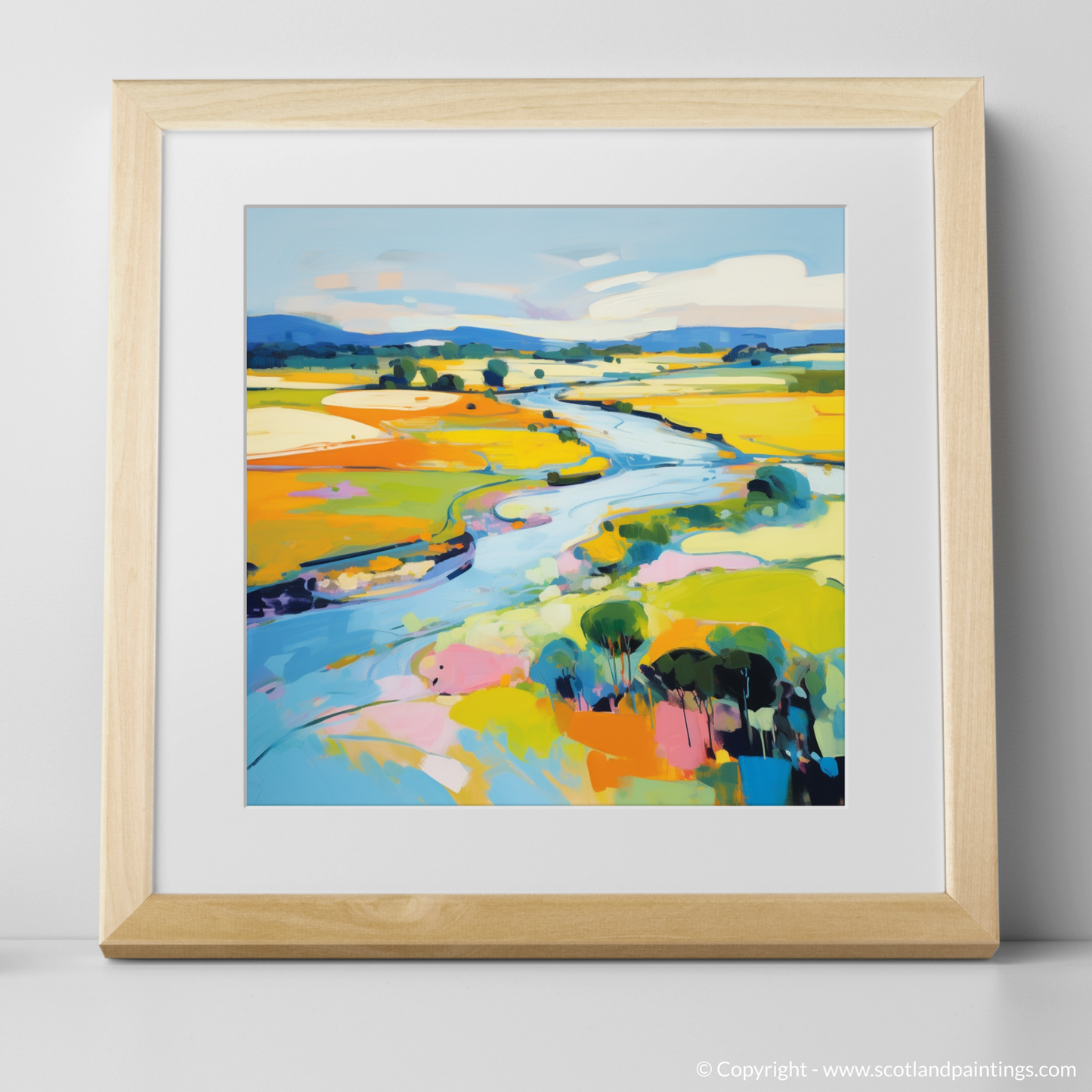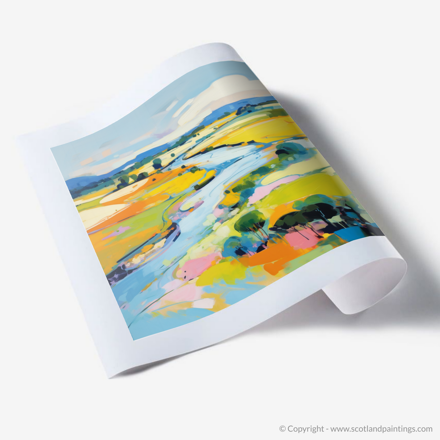 Captivating the vibrant heart of Moray in the summertime, this evocative print invites the viewer on a visual journey through abstract impressions of the River Lossie. Bold, fluid strokes of cerulean and sapphire flow through the composition, reminiscent of the river's meandering passage through the landscape. Amidst this cool tonal river path, patches of vivid tangerine, sun-kissed gold, and chartreuse dance across the canvas, suggesting the glowing warmth of the Scottish summer sun as it illuminates verdant fields and gentle hills.