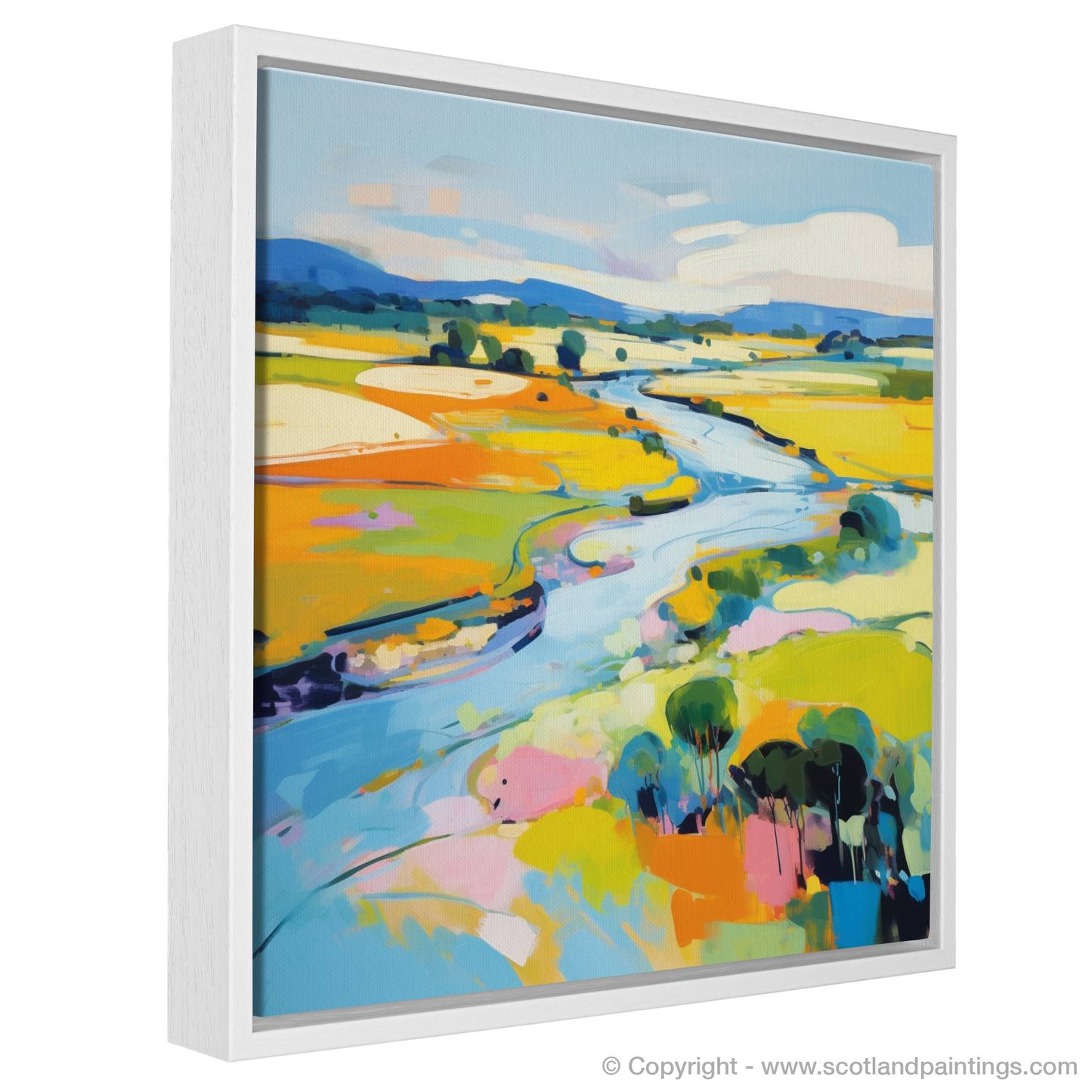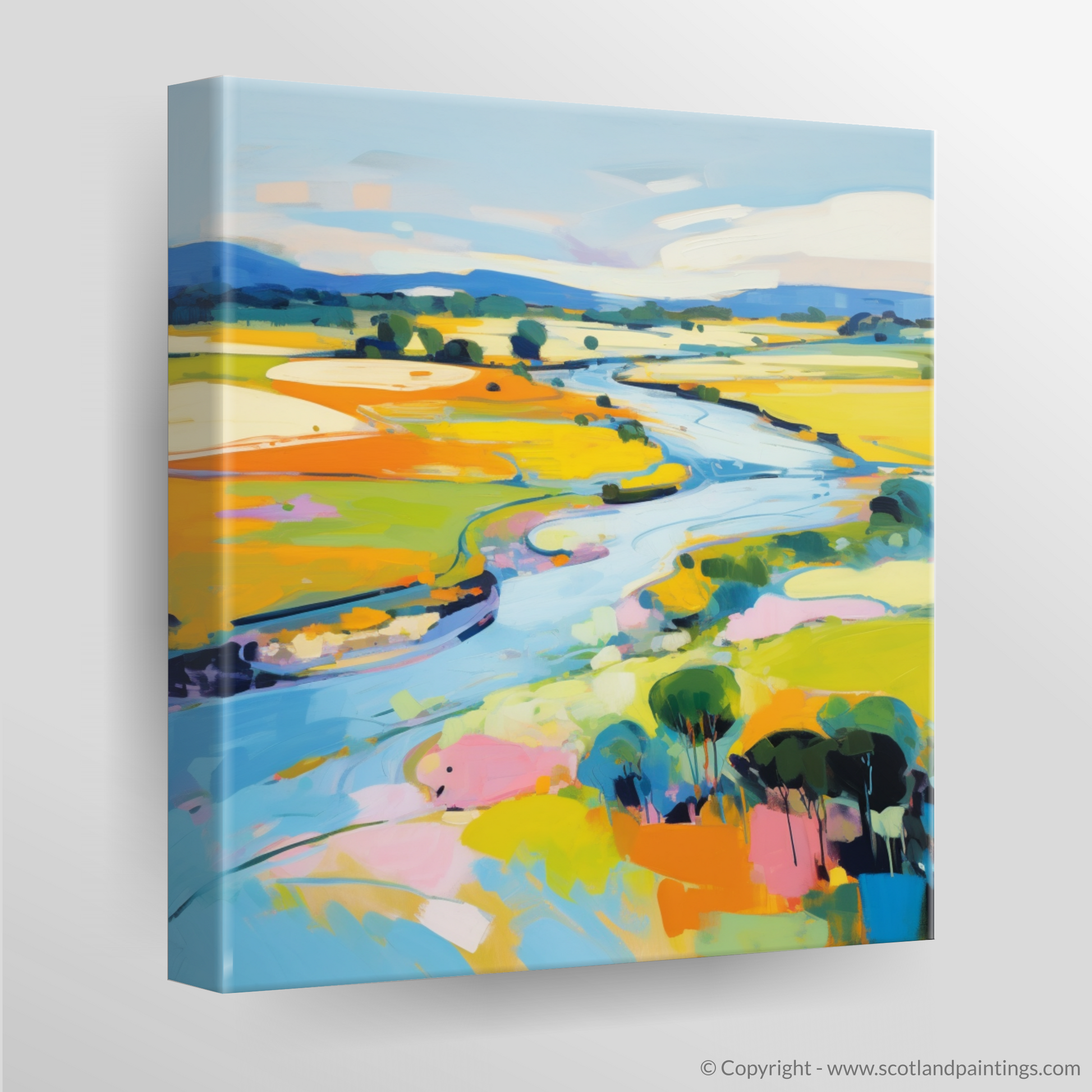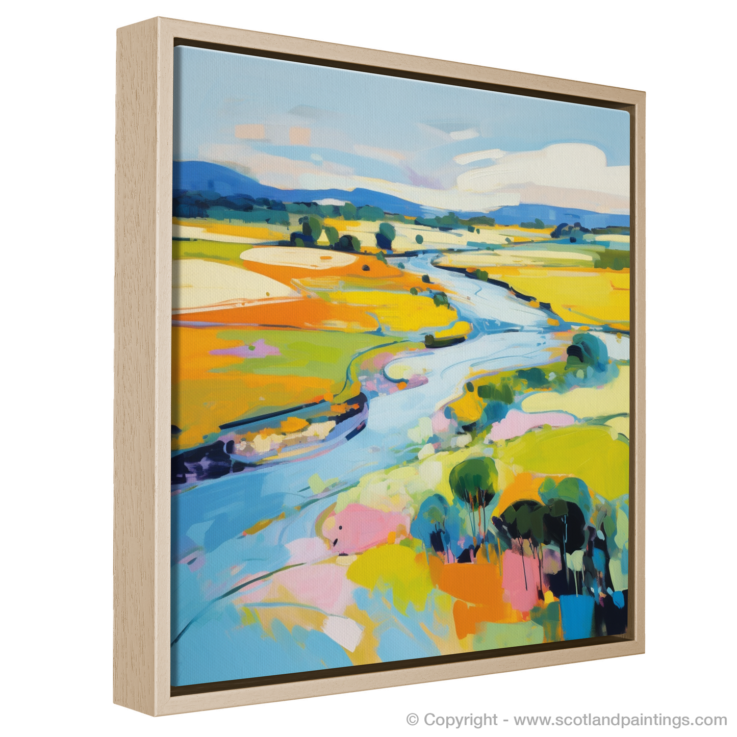 Captivating the vibrant heart of Moray in the summertime, this evocative print invites the viewer on a visual journey through abstract impressions of the River Lossie. Bold, fluid strokes of cerulean and sapphire flow through the composition, reminiscent of the river's meandering passage through the landscape. Amidst this cool tonal river path, patches of vivid tangerine, sun-kissed gold, and chartreuse dance across the canvas, suggesting the glowing warmth of the Scottish summer sun as it illuminates verdant fields and gentle hills.