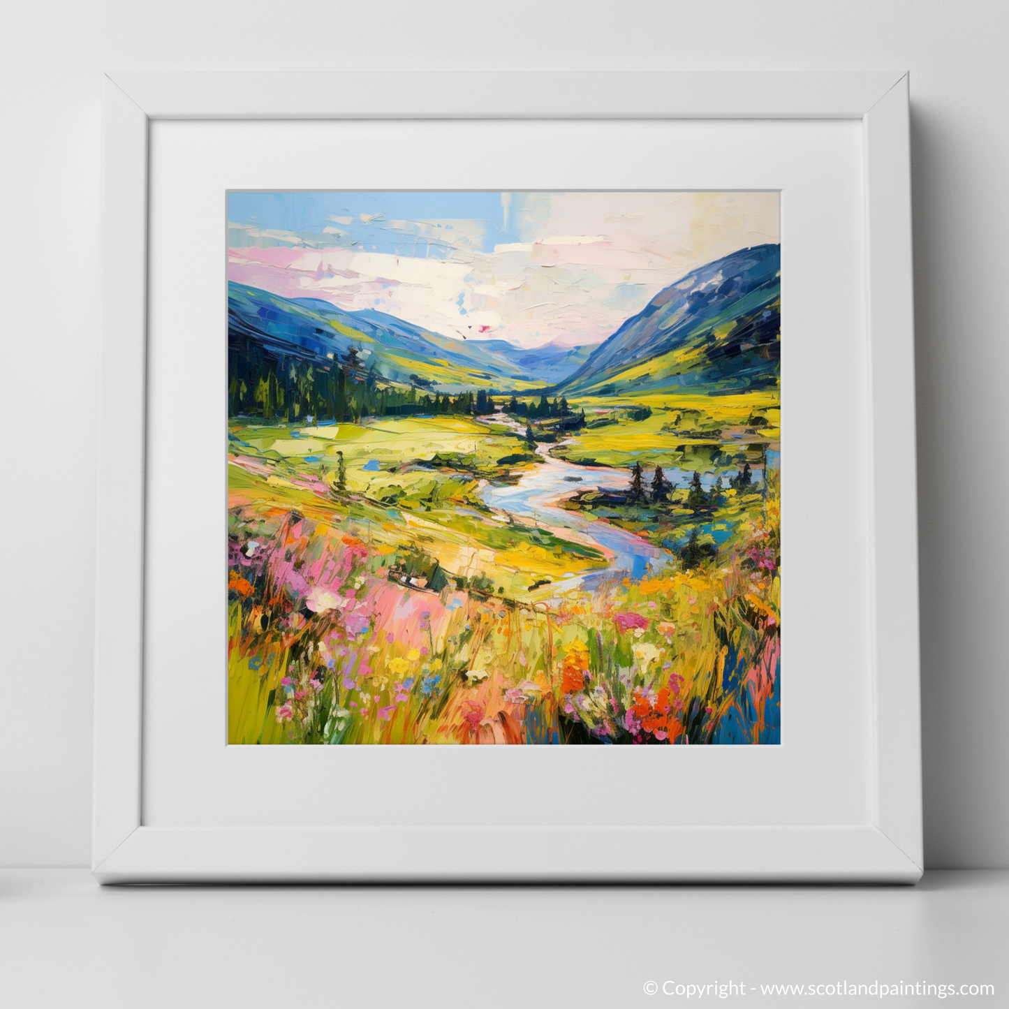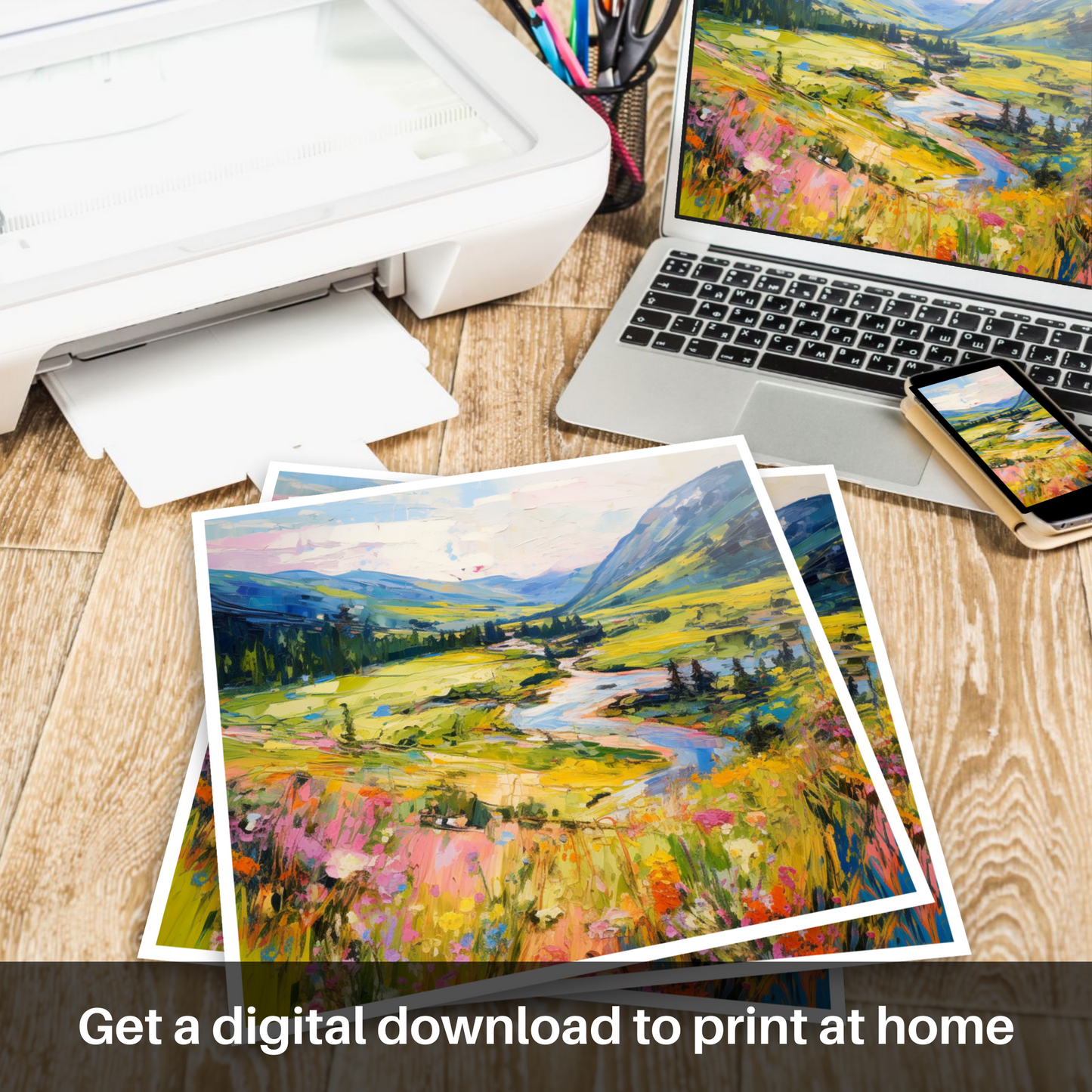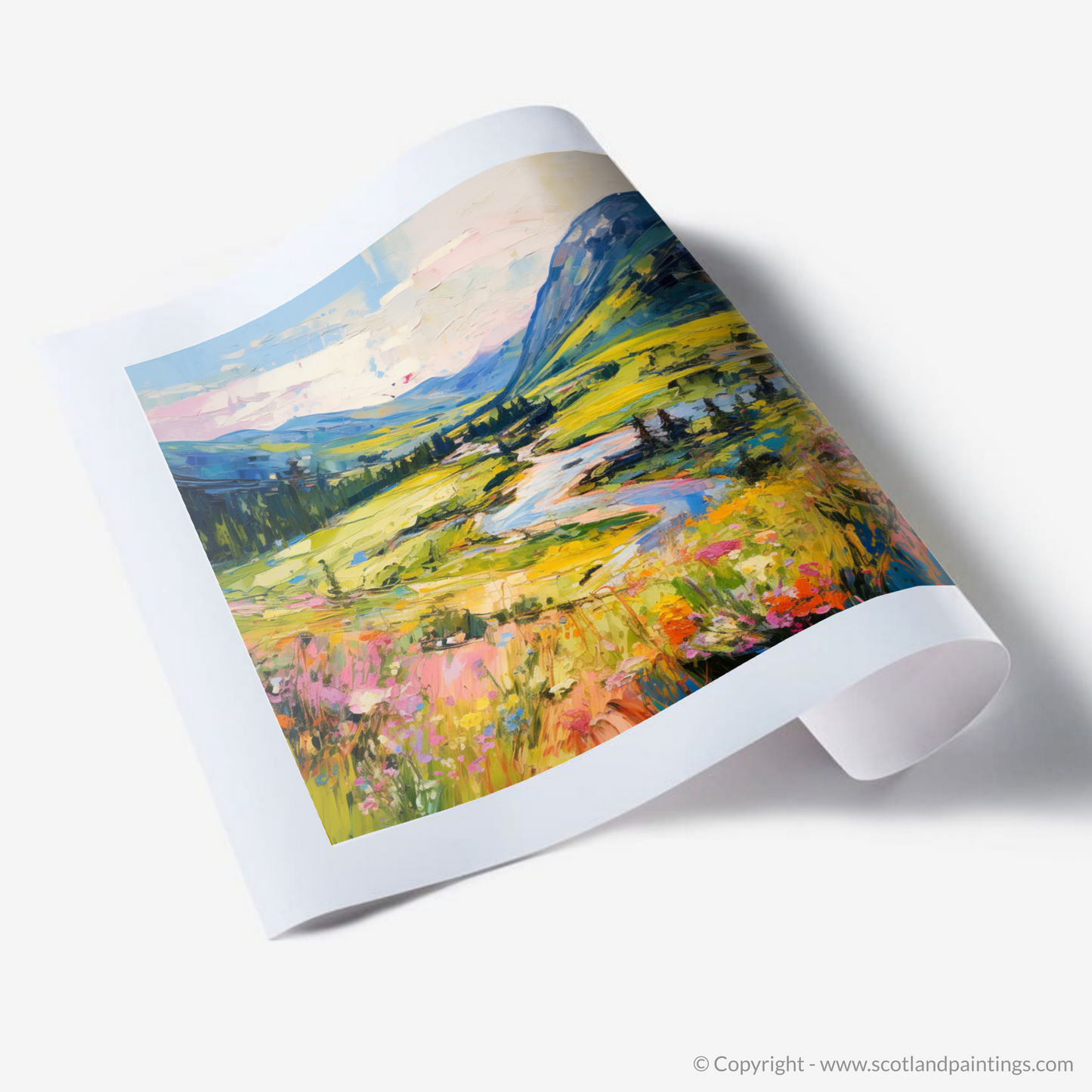 Capture the essence of a Scottish summer with this vibrant impressionist print, which offers a delightful visual escape to the serene Glen Strathfarrar in the Highlands, during the season's peak. This renders a sweeping panorama laced with the natural beauty of rolling hills, lush valleys, and the tranquil flow of a winding river reflecting the azure skies above.