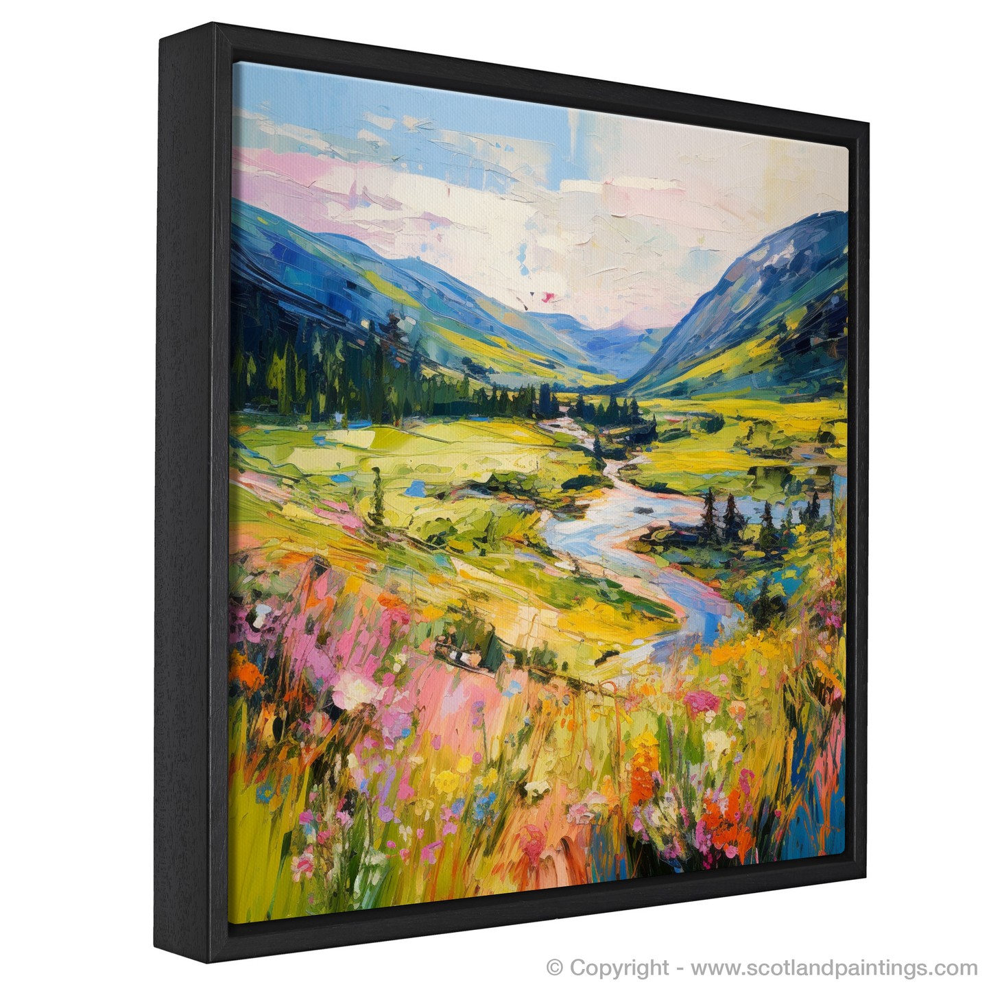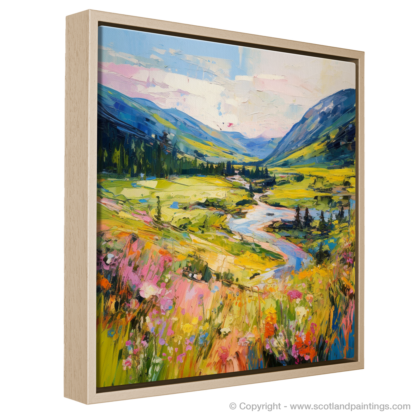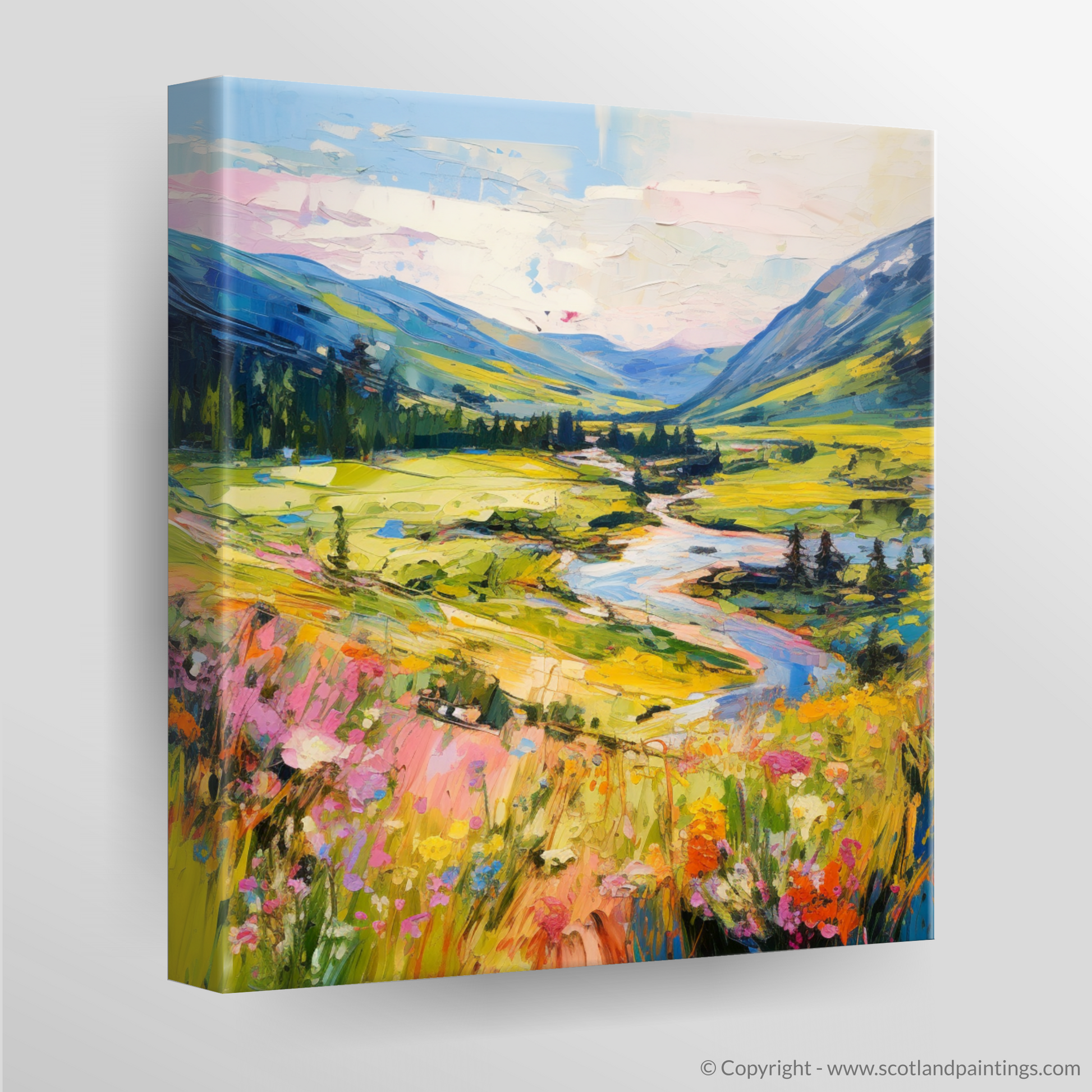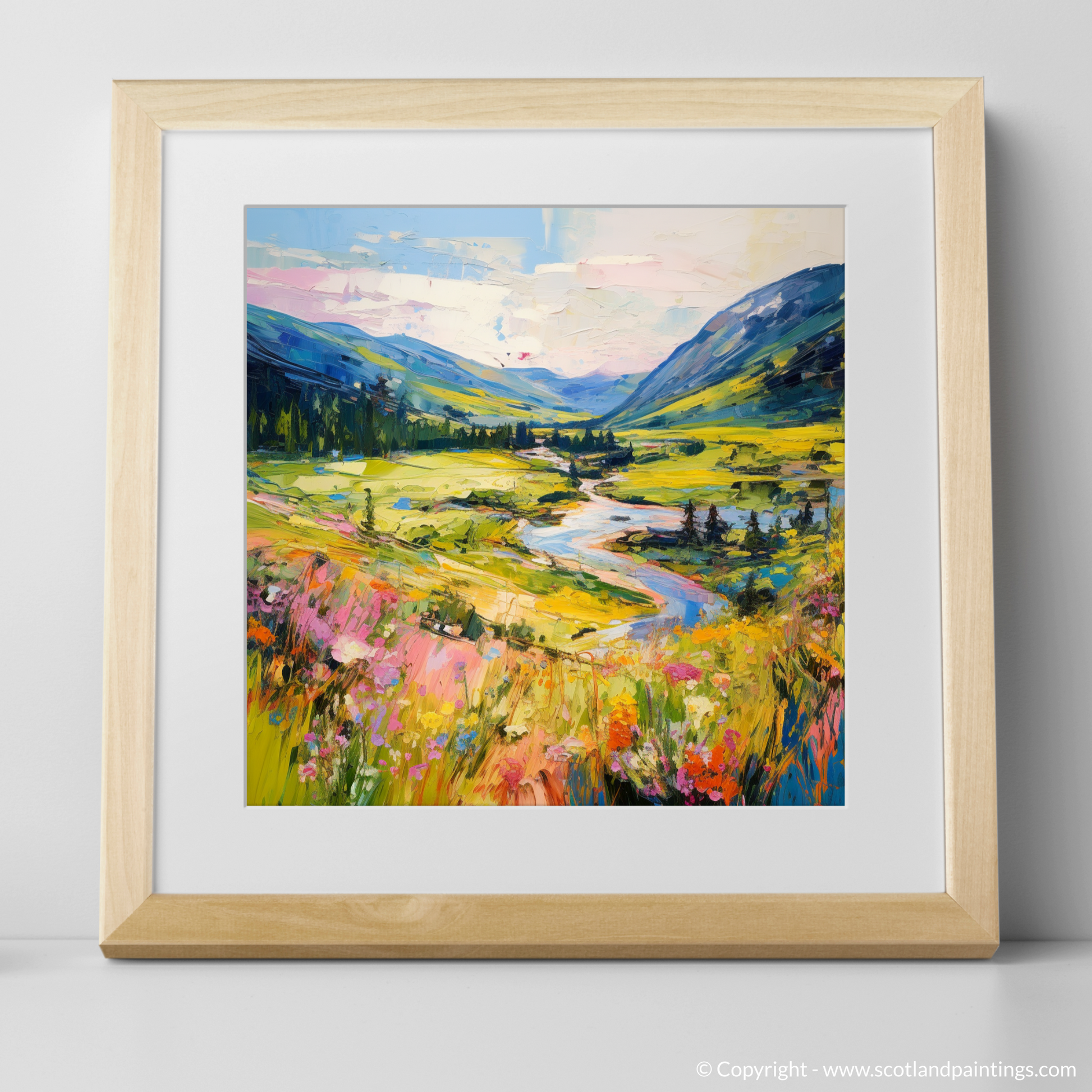 Capture the essence of a Scottish summer with this vibrant impressionist print, which offers a delightful visual escape to the serene Glen Strathfarrar in the Highlands, during the season's peak. This renders a sweeping panorama laced with the natural beauty of rolling hills, lush valleys, and the tranquil flow of a winding river reflecting the azure skies above.