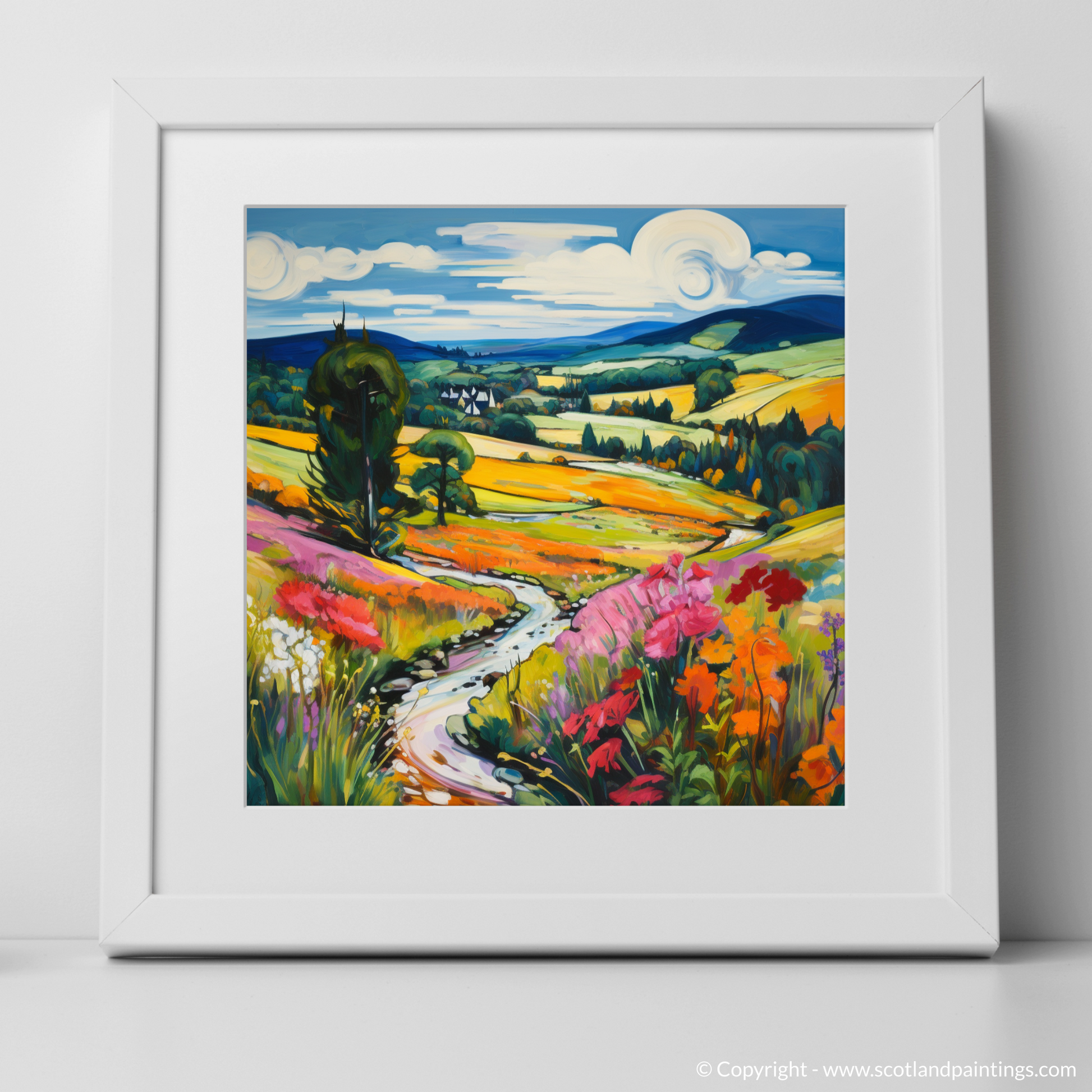 Immerse yourself in the radiant landscape of Aberdeenshire with this vibrant print inspired by the blooming beauty of Glen Tanar in summer. A symphony of bold hues and expressive brushwork captures the shimmering vitality of the season, embodying the essence of Fauvist artistry.