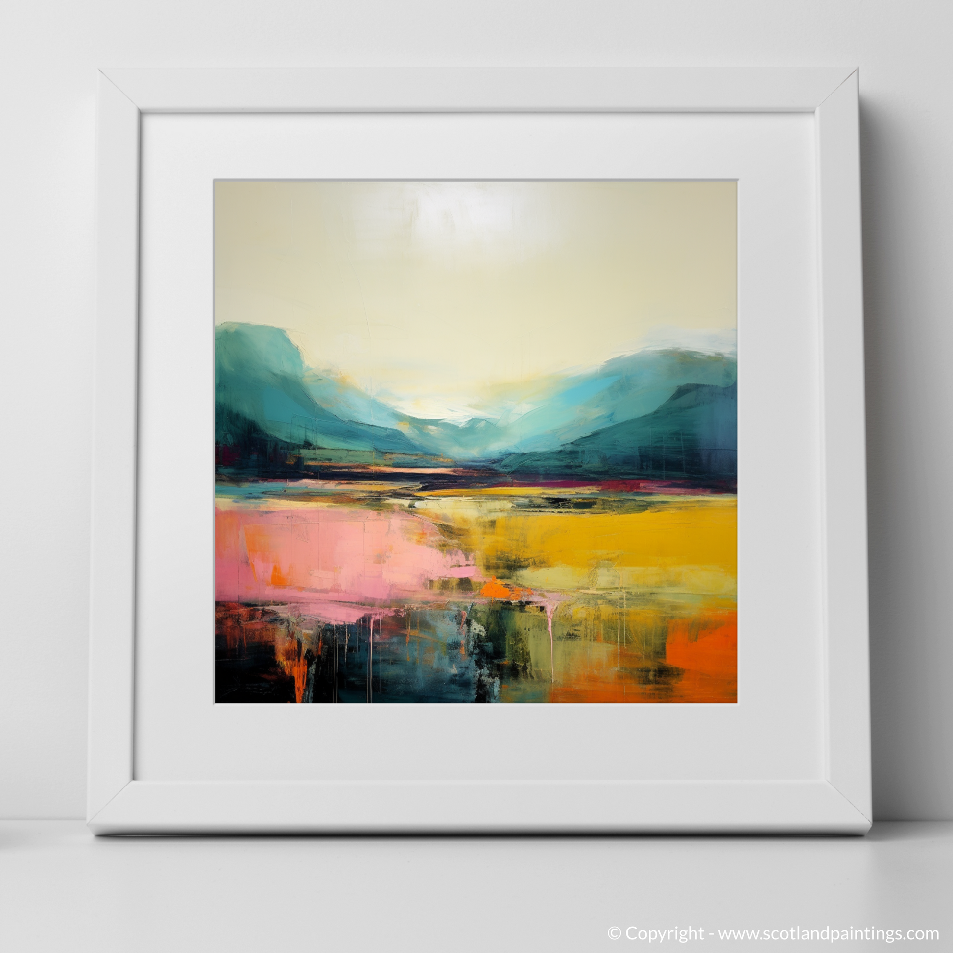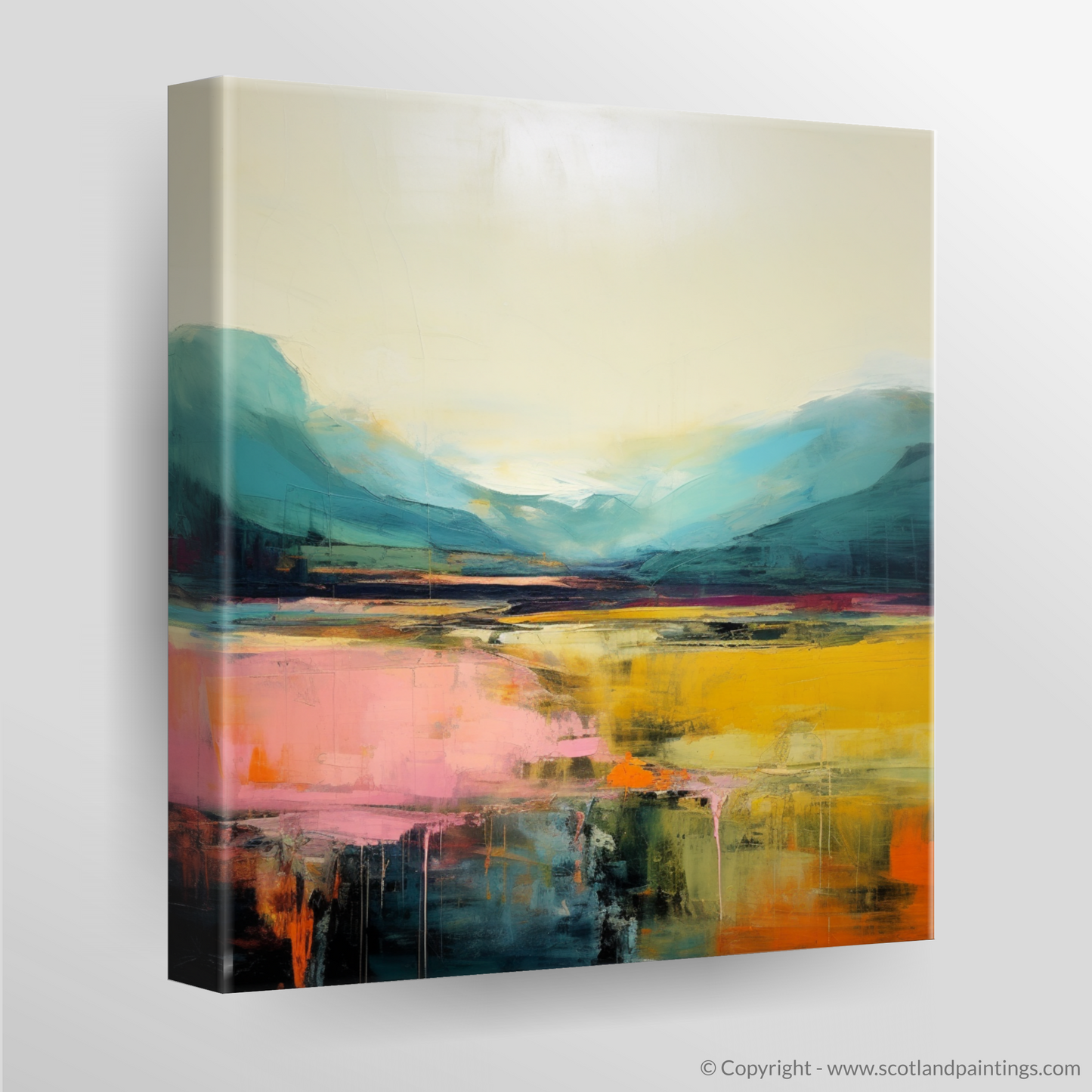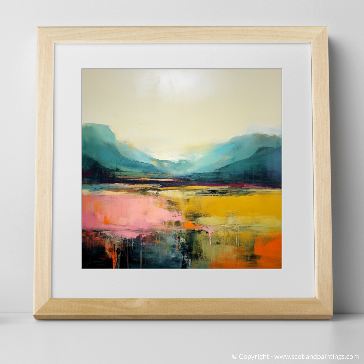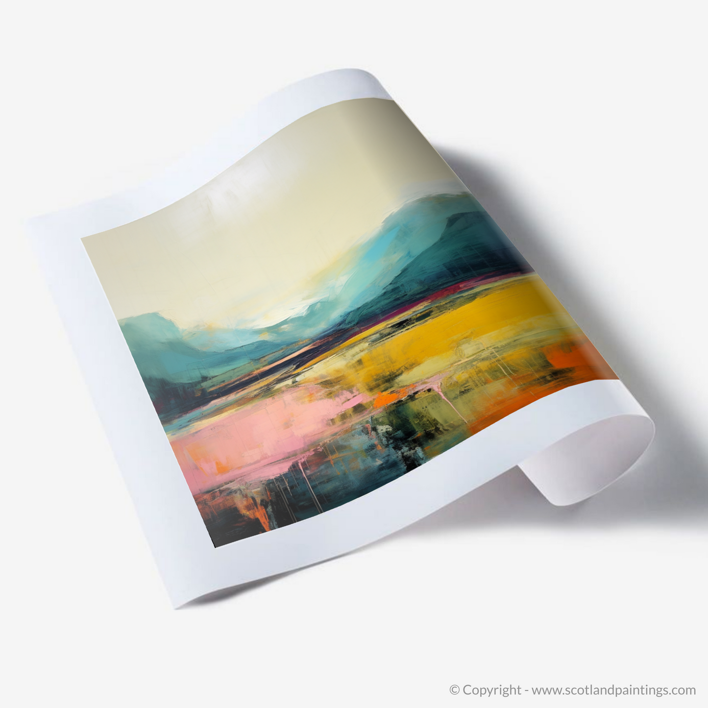 Immerse yourself in the vibrant, abstract landscape of the Glenmore Highlands, captured in the height of summer with an exuberance of color that sings of the season's warmth and vitality. Enigmatic blues and greens suggest distant hills and valleys, rendered in soothing, sweeping strokes that evoke the majestic tranquility of Scotland's natural scenery.