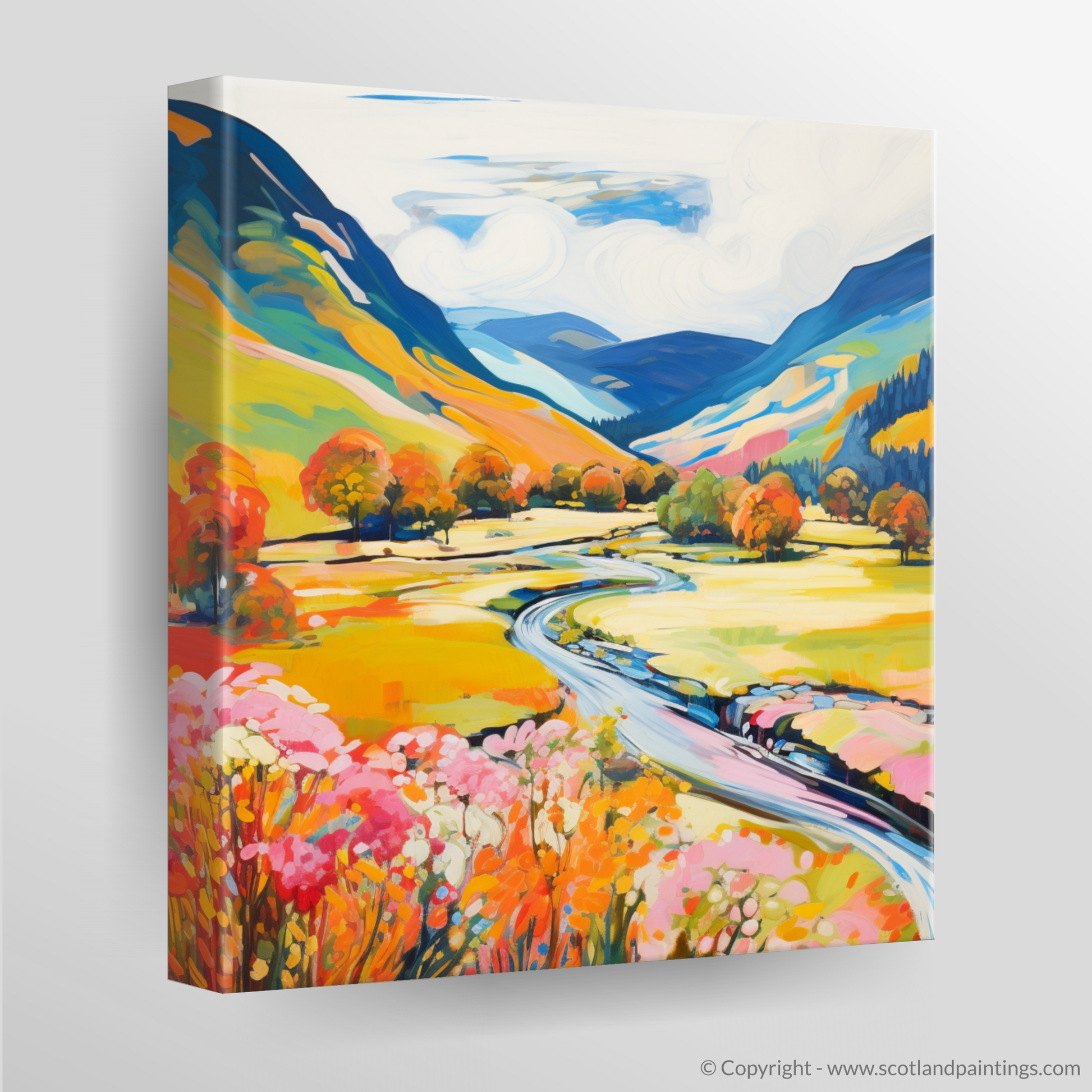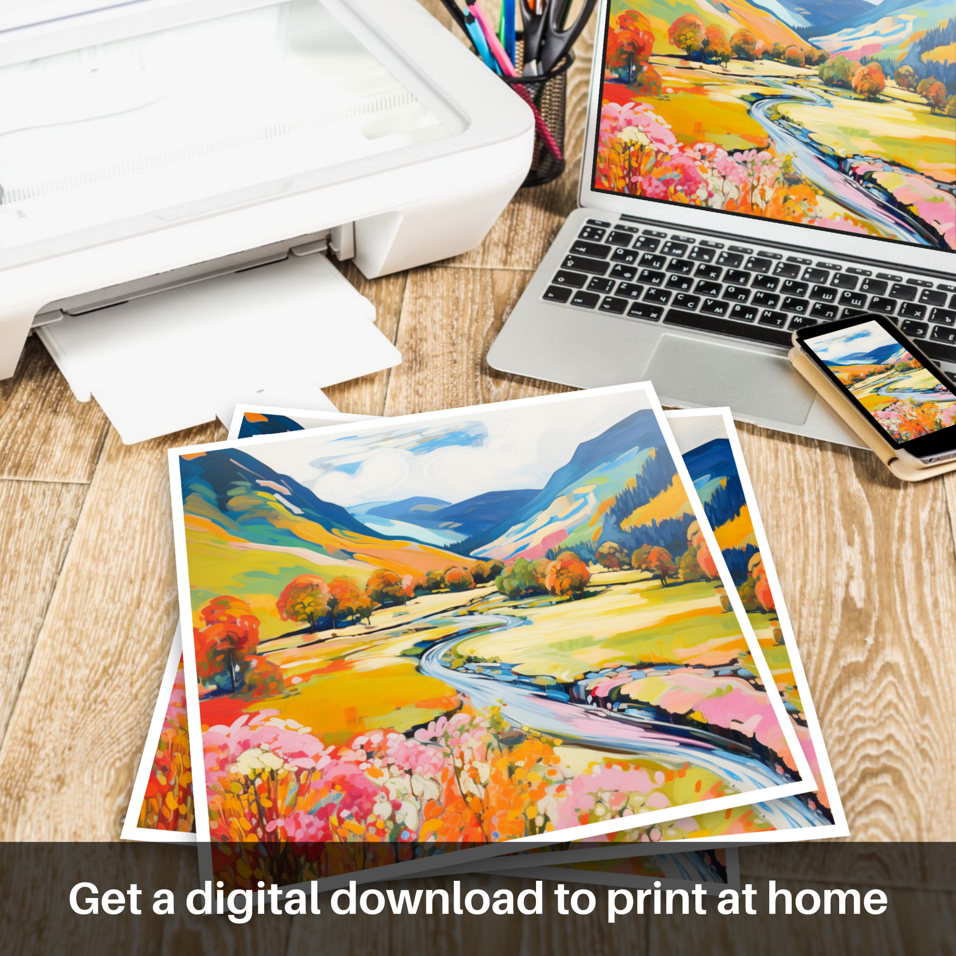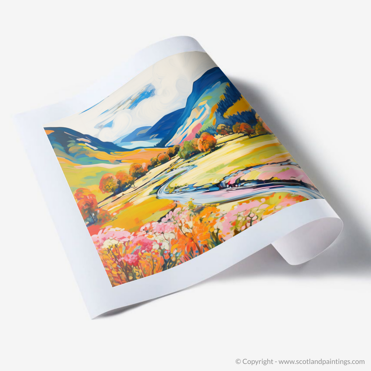 Capturing the vivid essence of Glen Lyon in Perthshire, this striking piece envelops the viewer in the warmth of a Scottish summer. The artwork is a symphony of colours that transport you to the heart of the Highlands, where vibrant hues and serene landscapes converge.