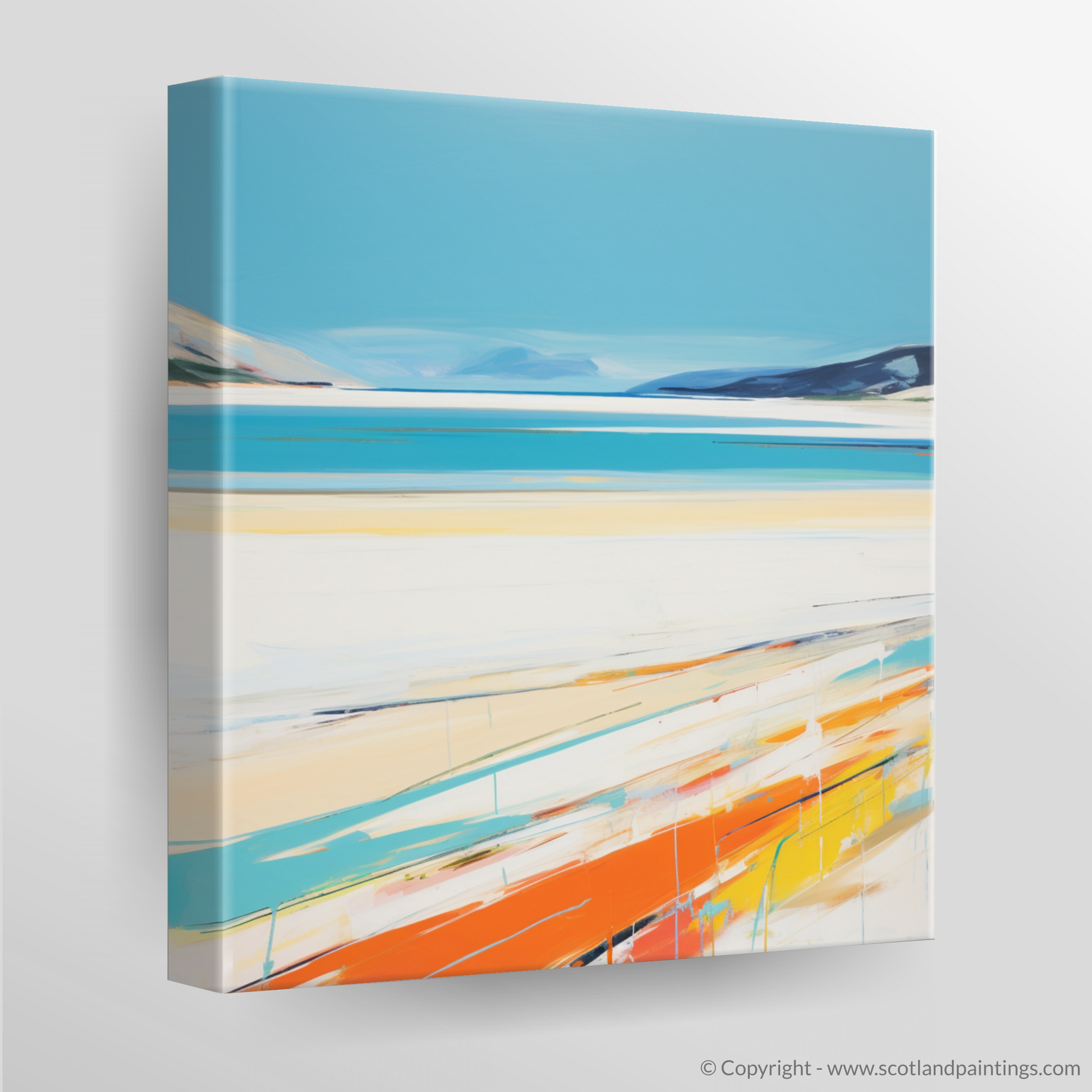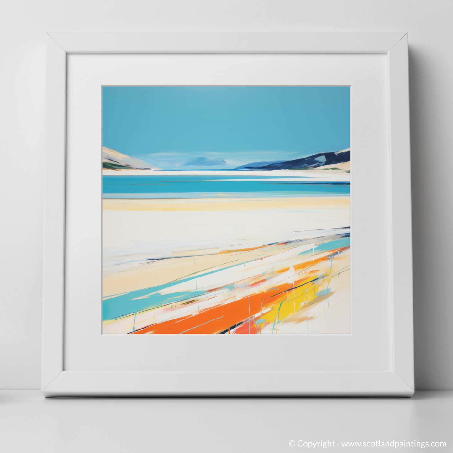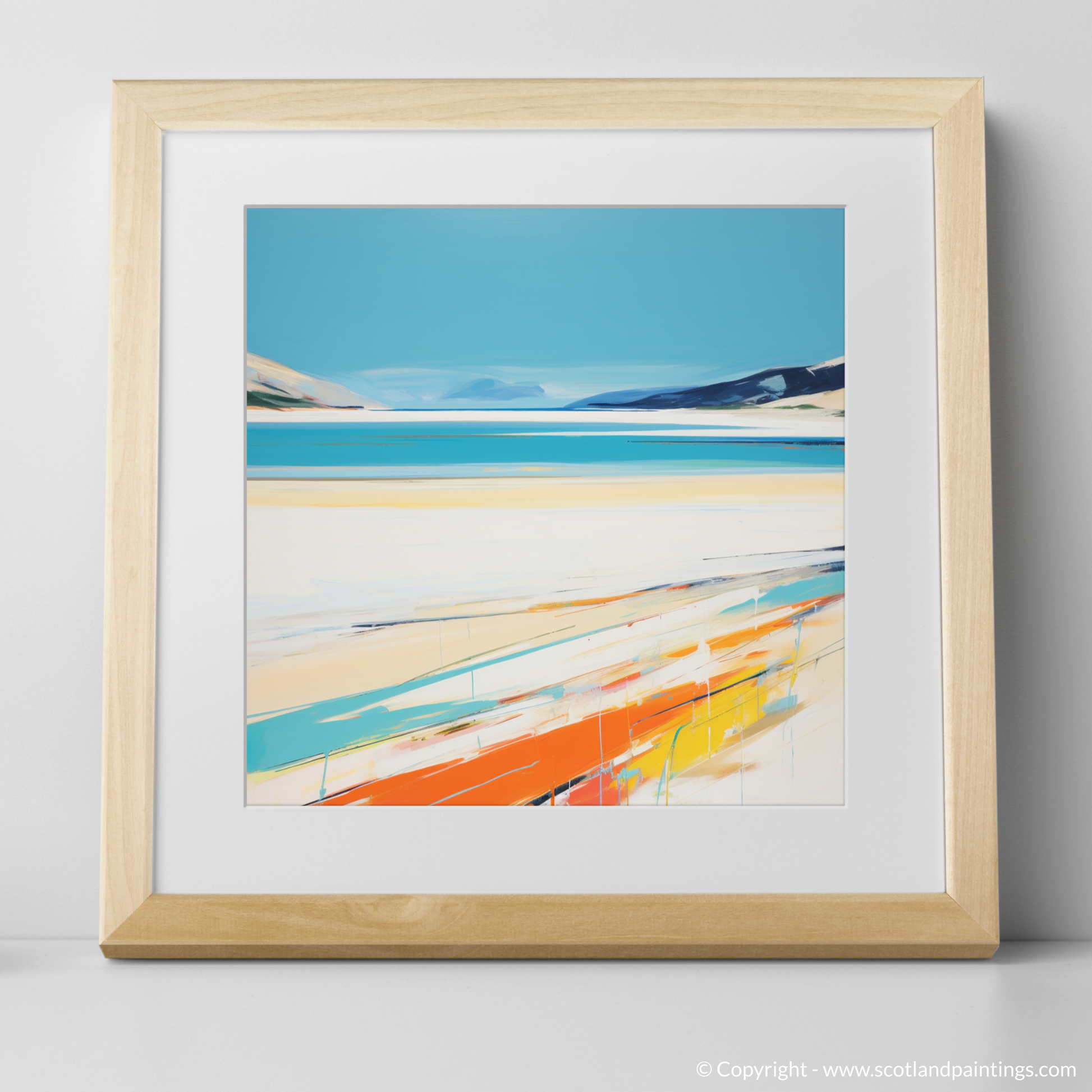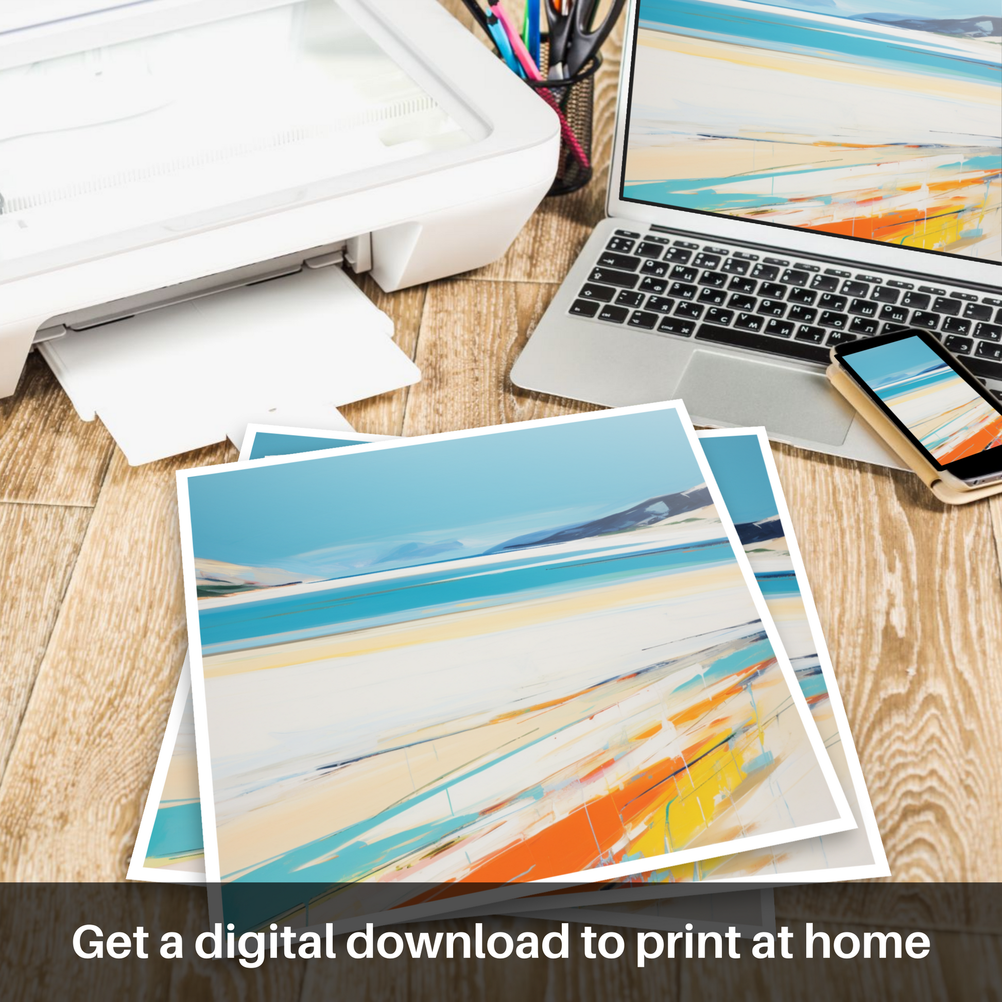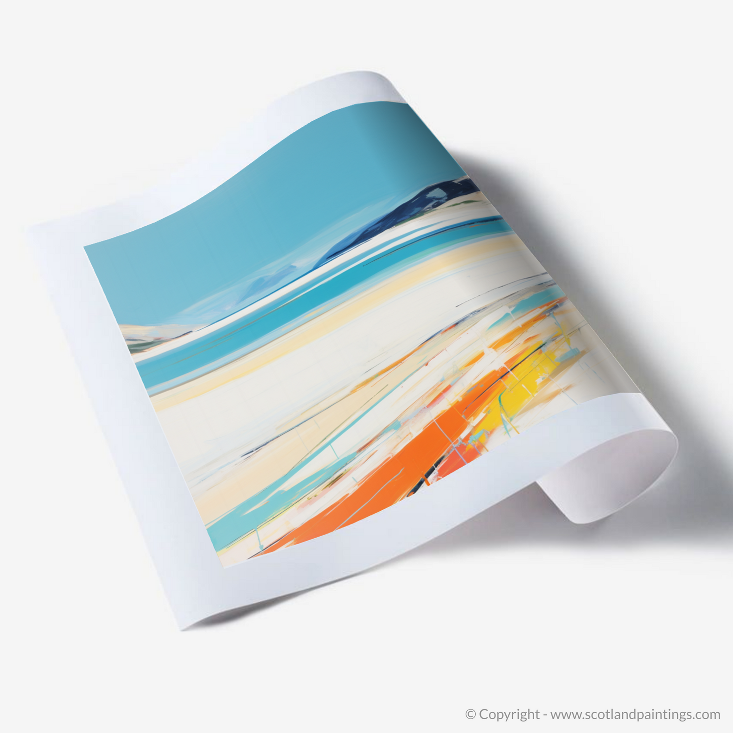 Immerse yourself in the serene beauty of the Scottish coastline with this exquisite print, celebrating the breathtaking vistas of Luskentyre Beach on the Isle of Harris. The piece encapsulates the essence of a vibrant summer on the Hebridean shores, where the azure sky meets the turquoise sea, interrupted only by the soft, powdery white sands that stretch into the yonder.