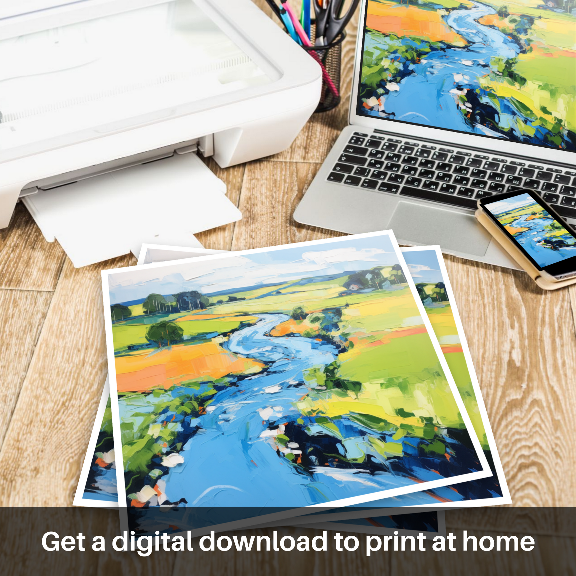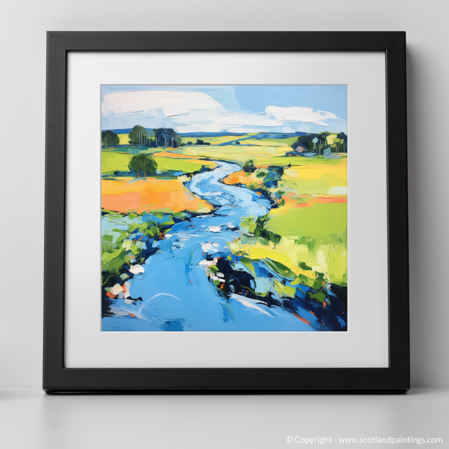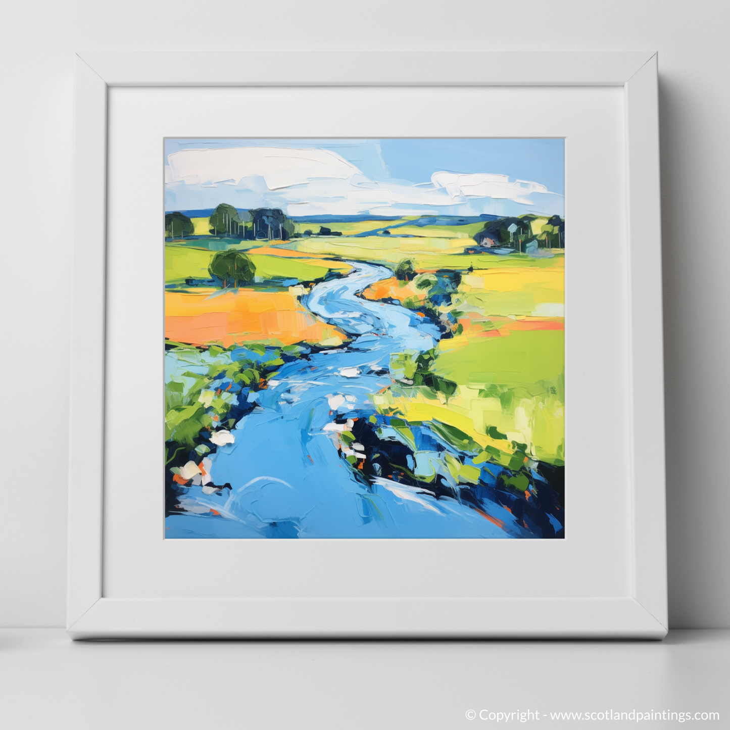 Immerse yourself in the vivid splendour of a Scottish summer with this striking abstract print, resonating with the dynamic energy of the River Lossie in Moray. Bold, impasto-like strokes of azure and cerulean depict the meandering river, a vibrant ribbon of colour that draws the eye through the rich tapestry of the countryside. The surrounding fields are a checkerboard of luminosity, where shades of amber, chartreuse, and goldenrod collide and dance against one another in a joyful expression of the season's peak.