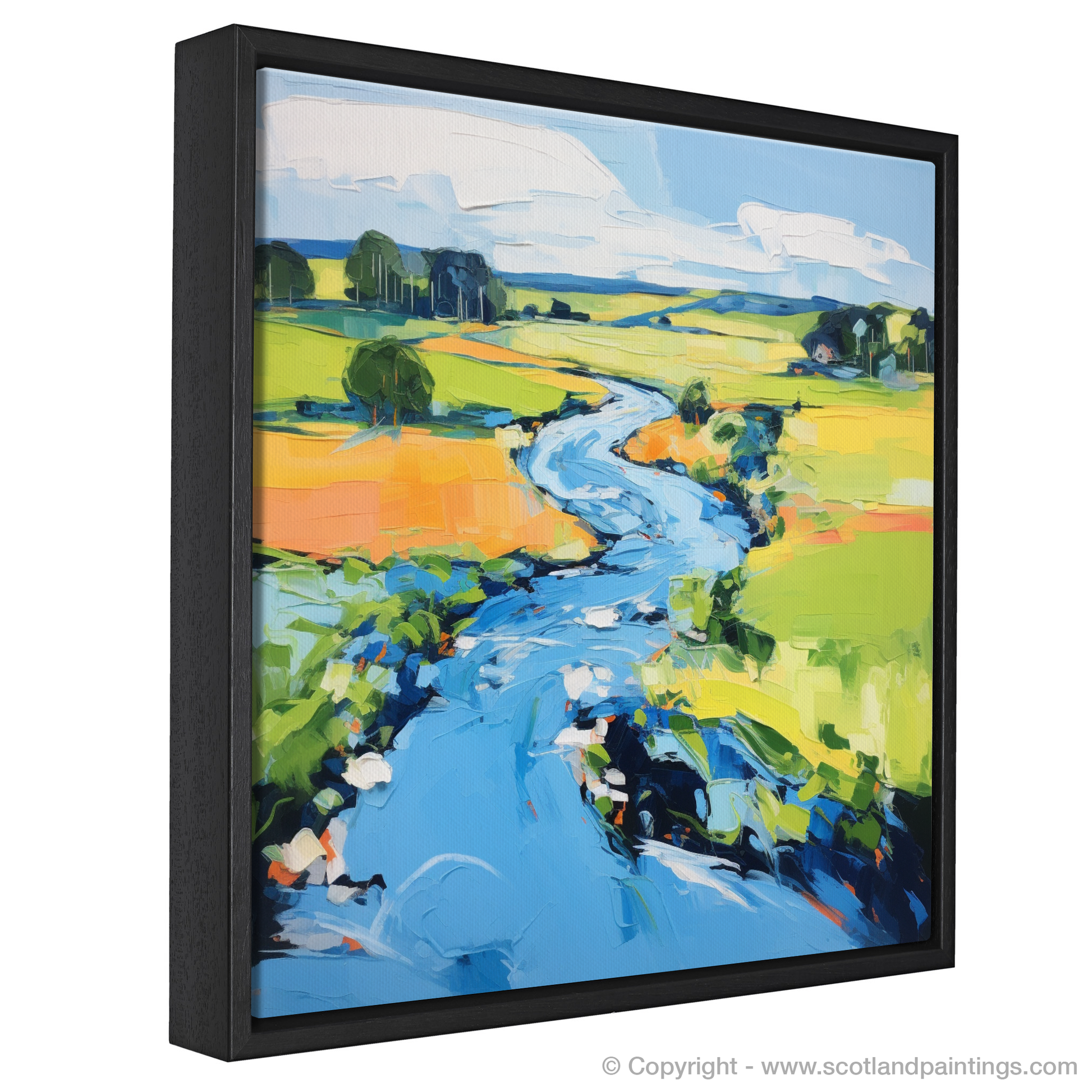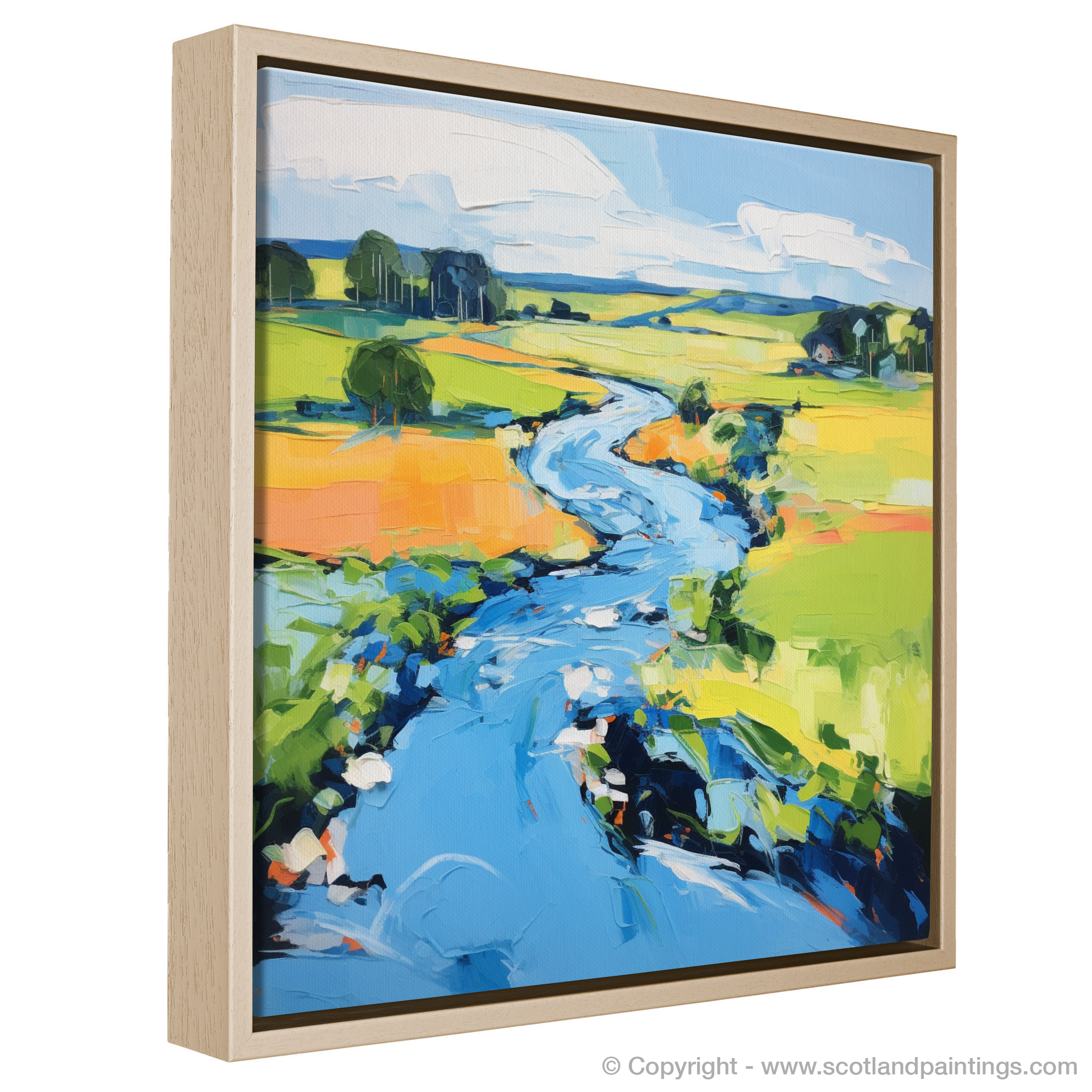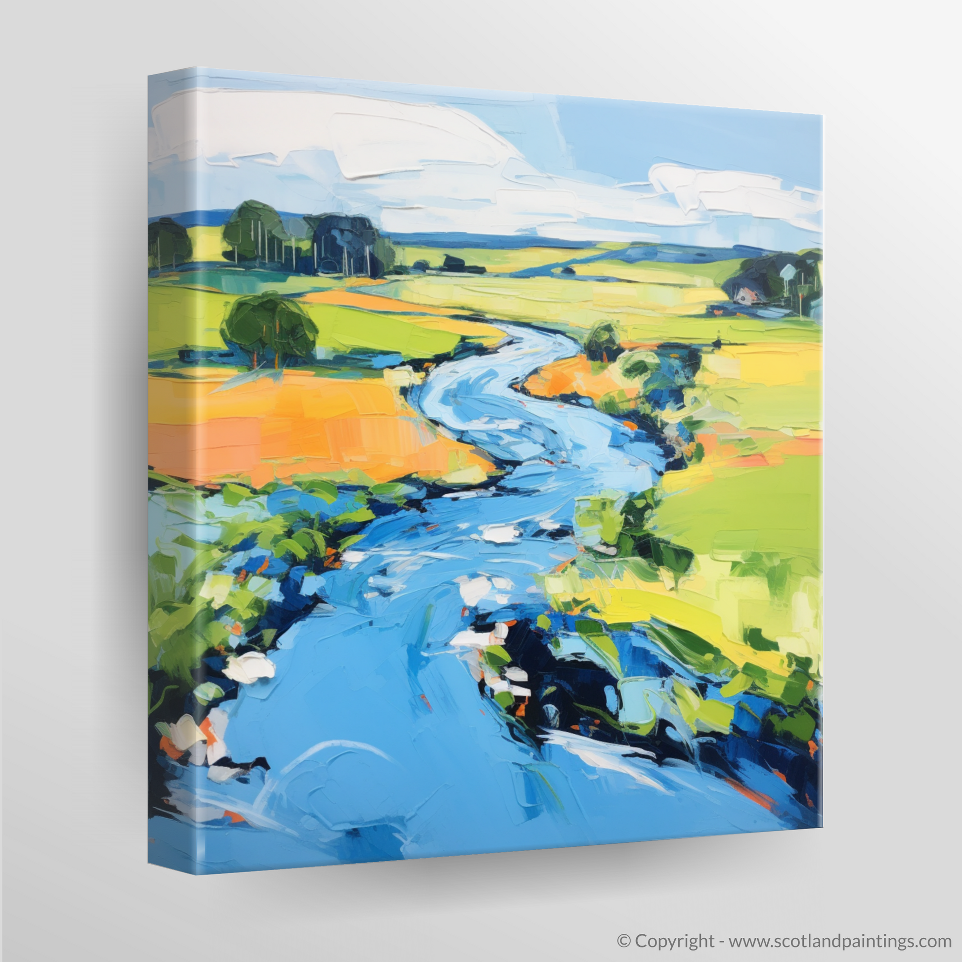Immerse yourself in the vivid splendour of a Scottish summer with this striking abstract print, resonating with the dynamic energy of the River Lossie in Moray. Bold, impasto-like strokes of azure and cerulean depict the meandering river, a vibrant ribbon of colour that draws the eye through the rich tapestry of the countryside. The surrounding fields are a checkerboard of luminosity, where shades of amber, chartreuse, and goldenrod collide and dance against one another in a joyful expression of the season's peak.