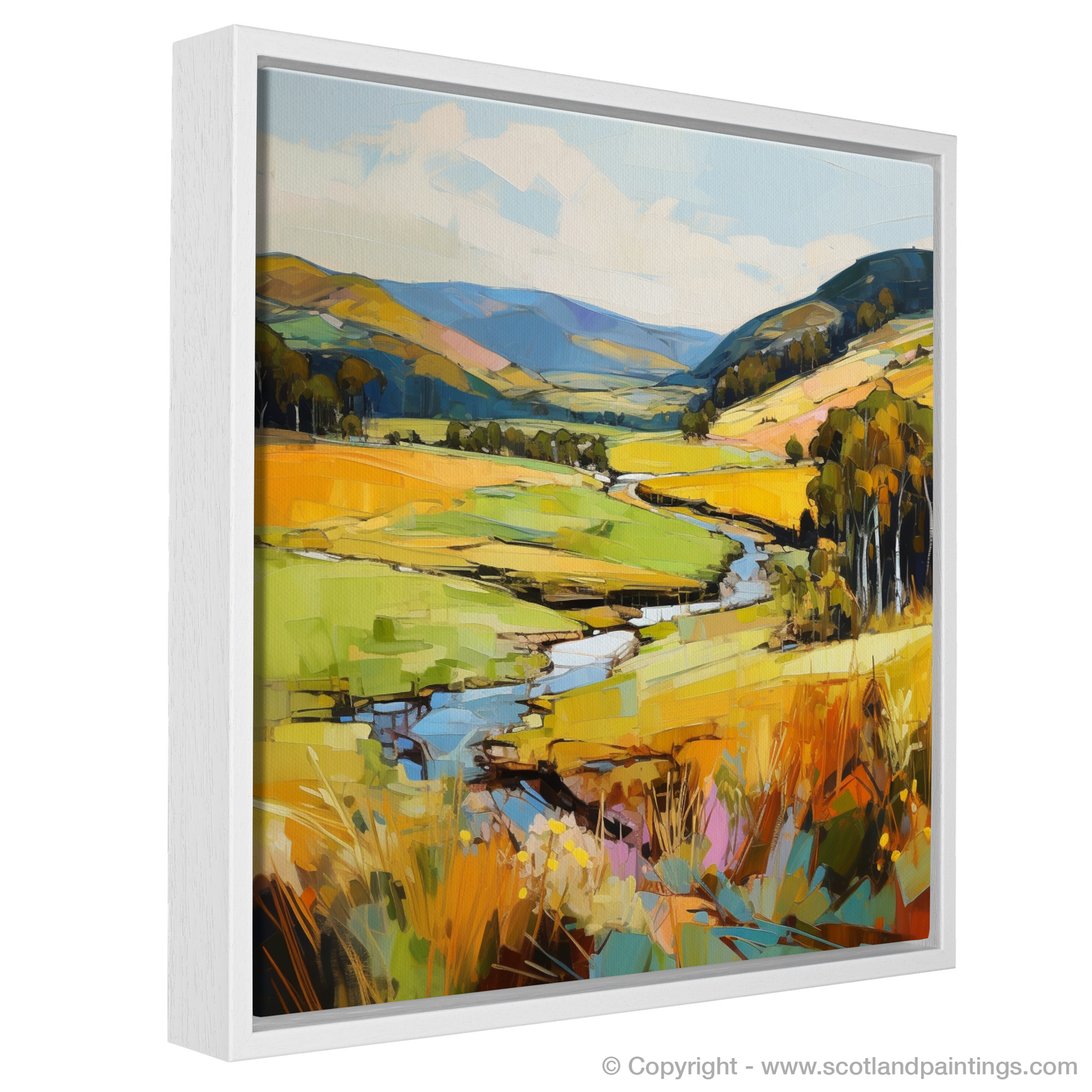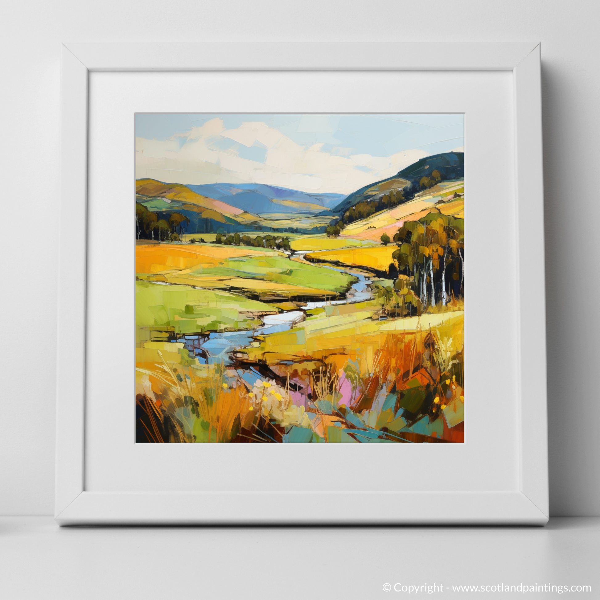 rippling blues and reflective whites are masterfully intertwined to represent the gentle journey of the river as it meanders through the valley. On its banks, strokes of deep green and earthy browns hint at quiet clusters of trees, their presence offering a grounding contrast to the open fields. The abstract nature of the piece allows for a personal journey of discovery, with each viewing revealing new interpretations of Scotland's timeless beauty.
