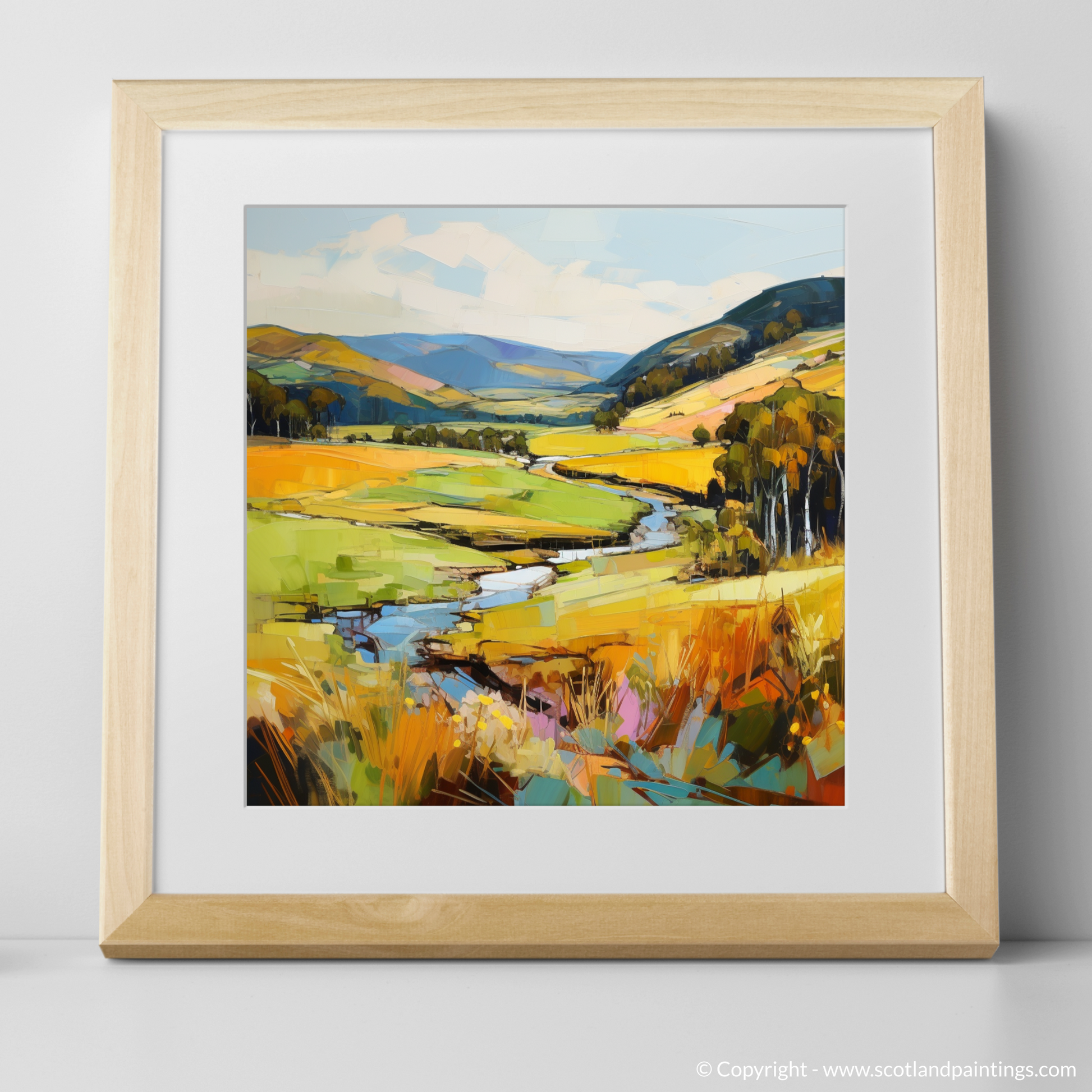 Immerse yourself in the vibrant splendour of a Scottish summer with this evocative abstract depiction of Glen Tilt, Perthshire. Bold strokes and a vivid palette bring to life the rolling hills and verdant fields, portraying a scene that is simultaneously wild and serene. The medley of warm yellows, fresh greens, and soothing blues captures the essence of Perthshire's lush landscapes under the summer sky, inviting the viewer's imagination to wander through its sweeping vistas.