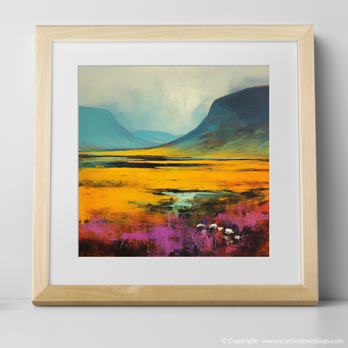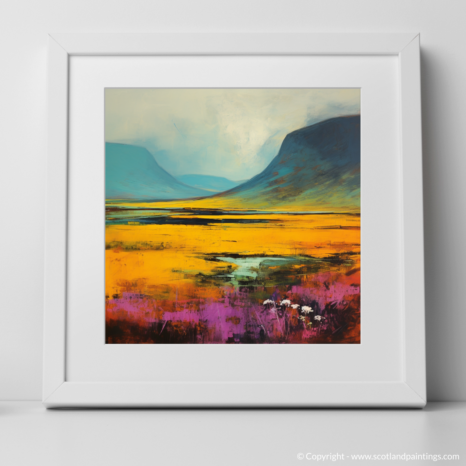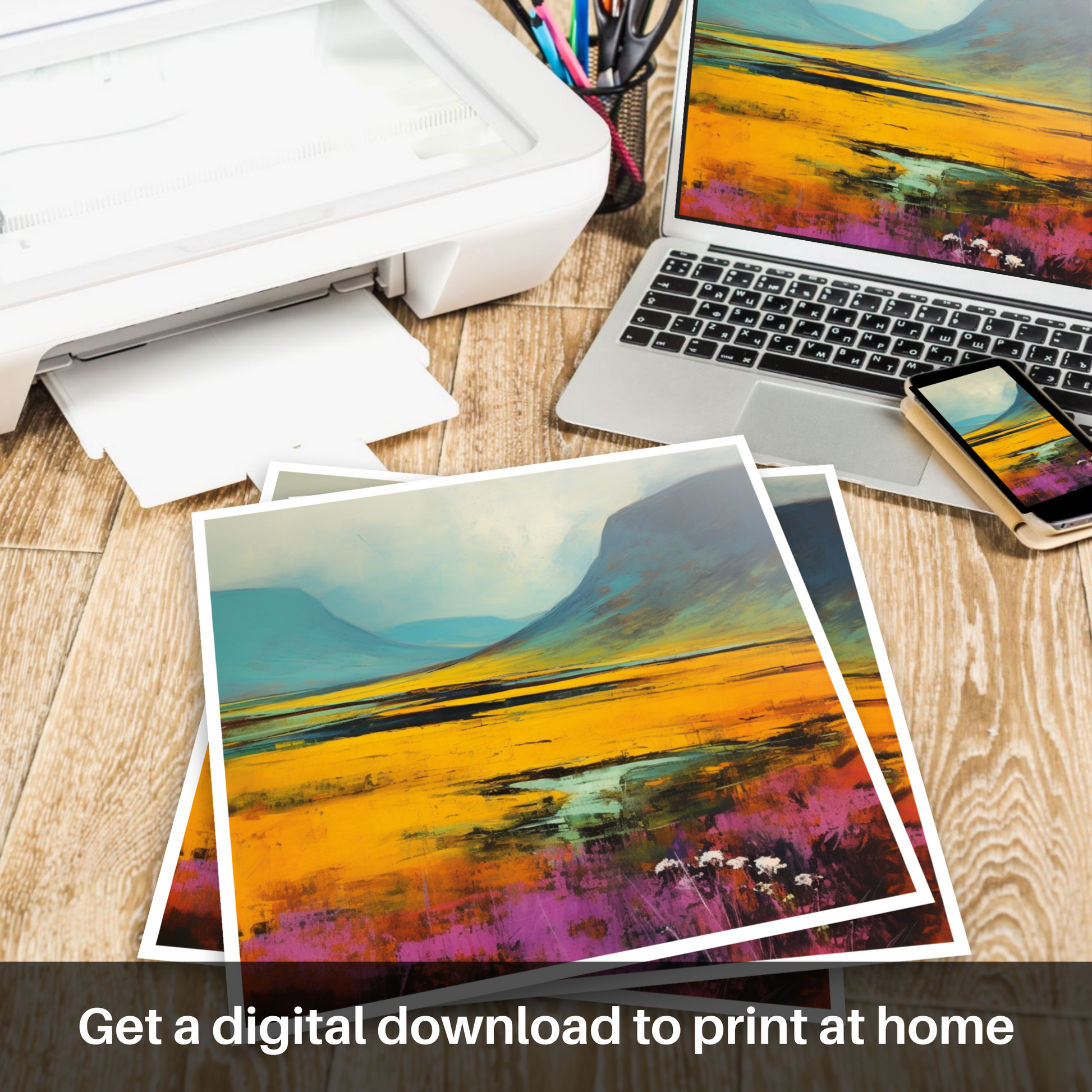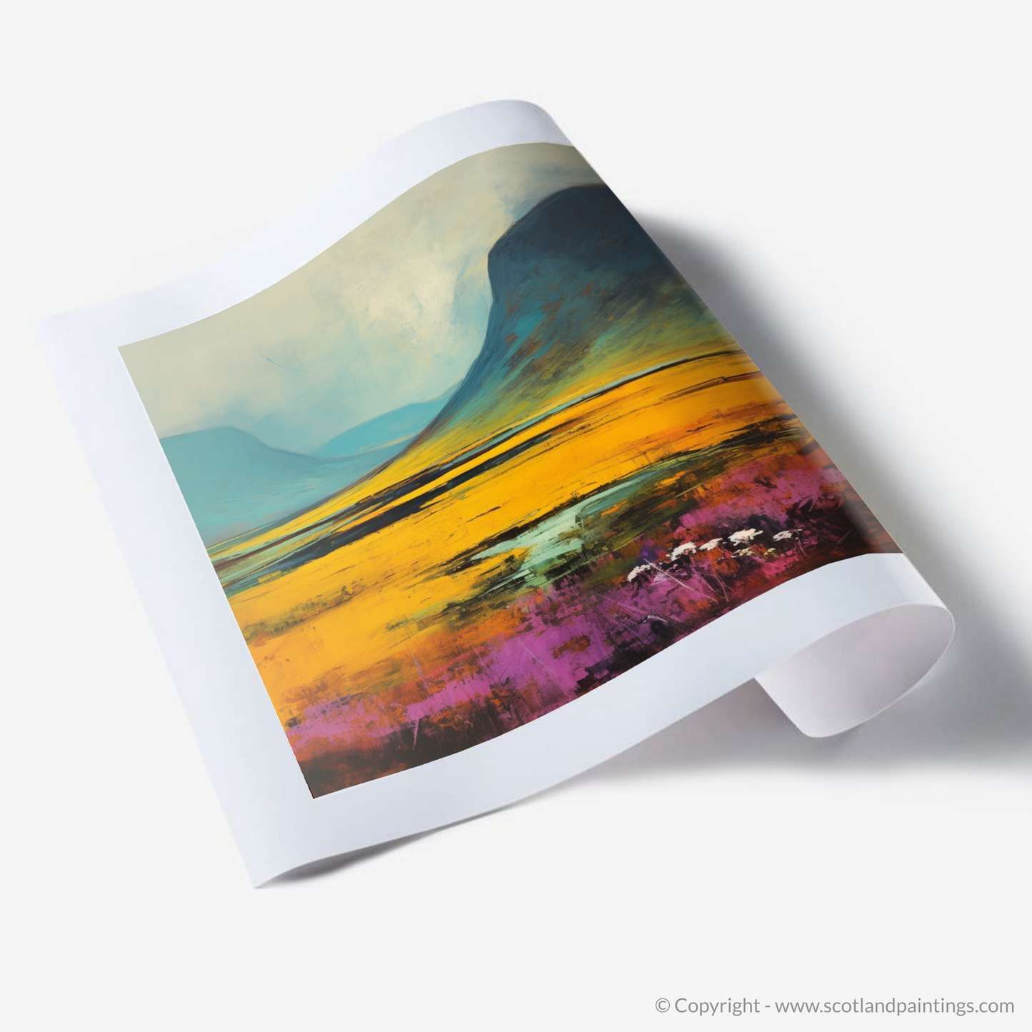 Each compositionally balanced segment of this print invites the observer to travel through the artwork, from the textured lowlands into the softened mountain slopes and up, towards the vast, open sky. The result is a piece that not only reflects the essence of a specific locale but also transcends it, offering a universal experience of summer's ephemeral beauty through its rich palette and dynamic abstraction. This print is a tribute to the untamed spirit of Scotland's landscapes and the myriad impressions they engrave upon the hearts of all who behold them.