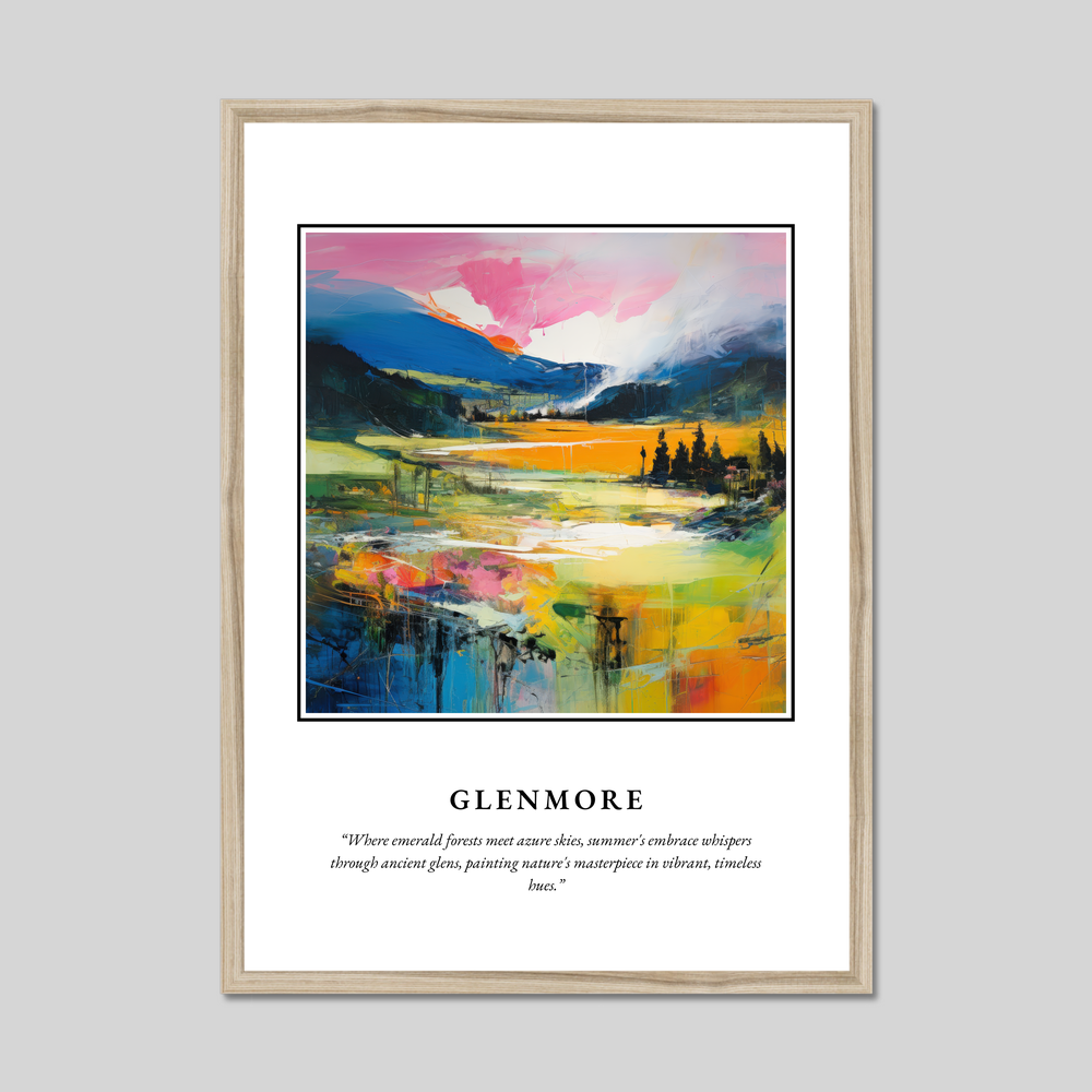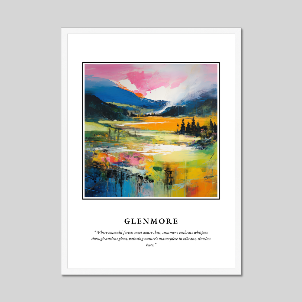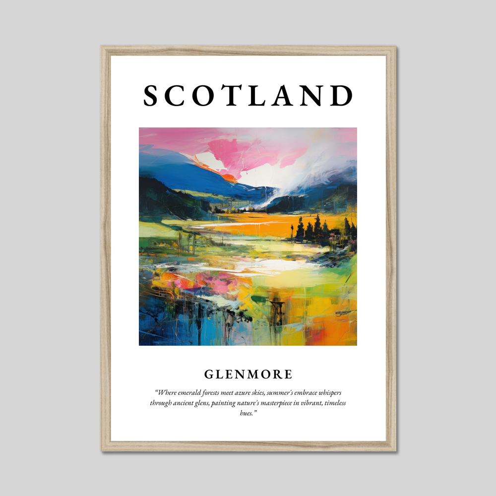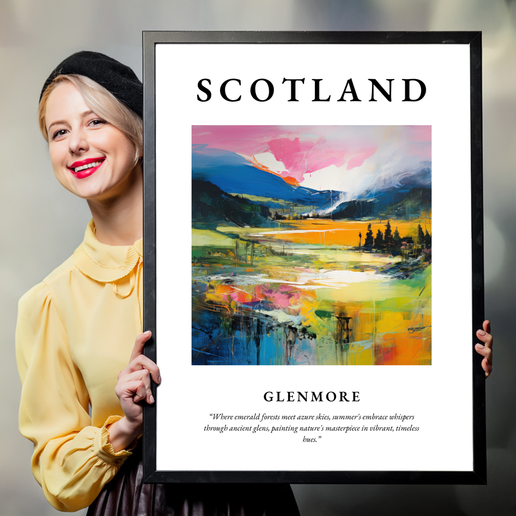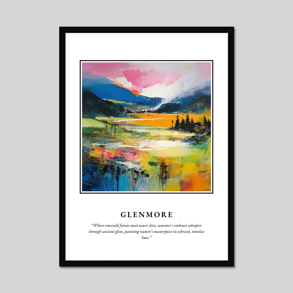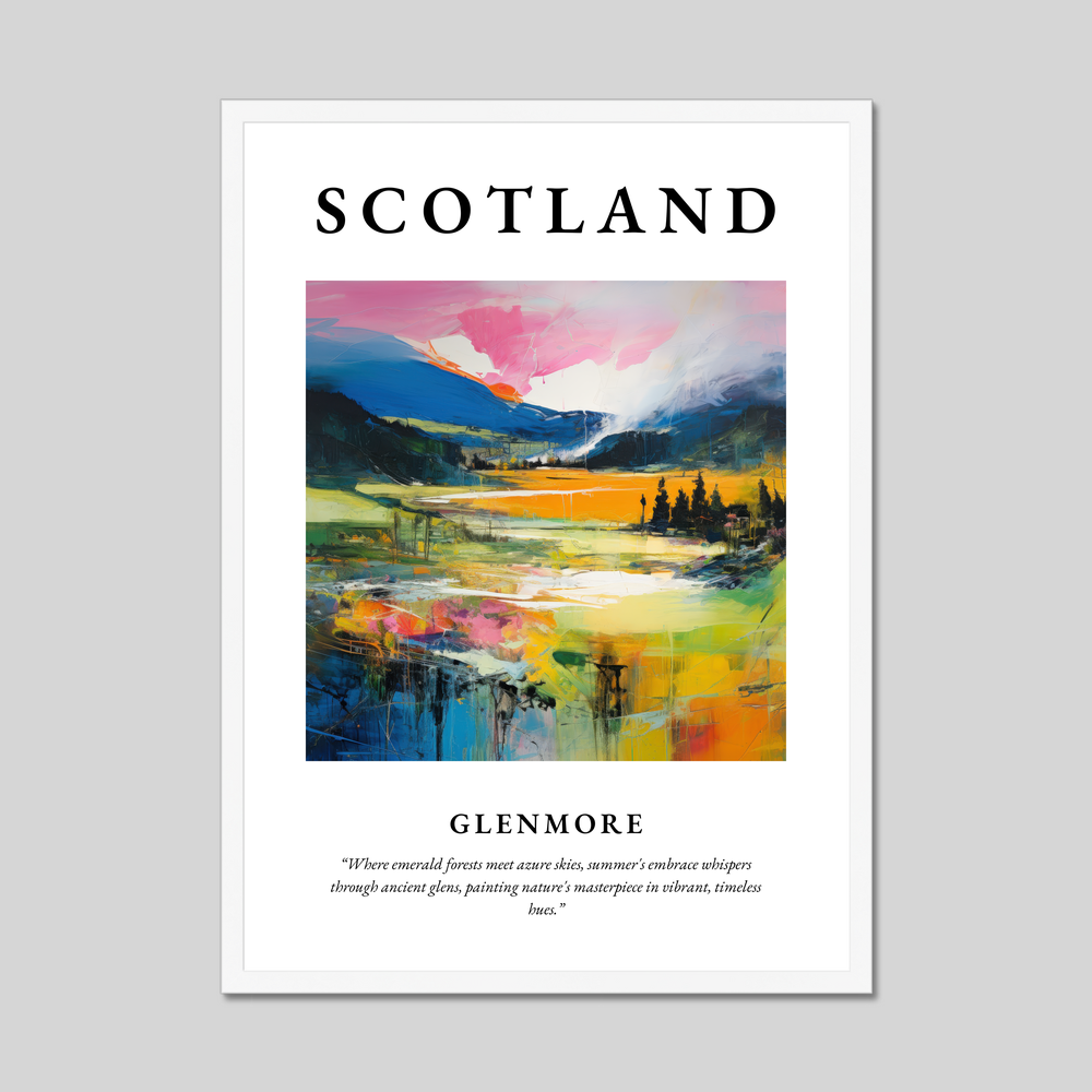 Boldly announced with "SCOTLAND" in striking lettering at the top, the artwork flows into a mesmerising painting depicting the vibrant landscape of Glenmore. The rich gradients of colour blend harmoniously, with lush emerald forests transitioning into expansive azure skies. The scenery is infused with dynamic strokes of vivid colour, invoking the warm whispers of summer throughout the timeless glens. Beneath this visual splendour, a poetic quote adds a touch of lyrical charm: "Where emerald forests meet azure skies, summer's embrace whispers through ancient glens, painting nature's masterpiece in vibrant, timeless hues."
