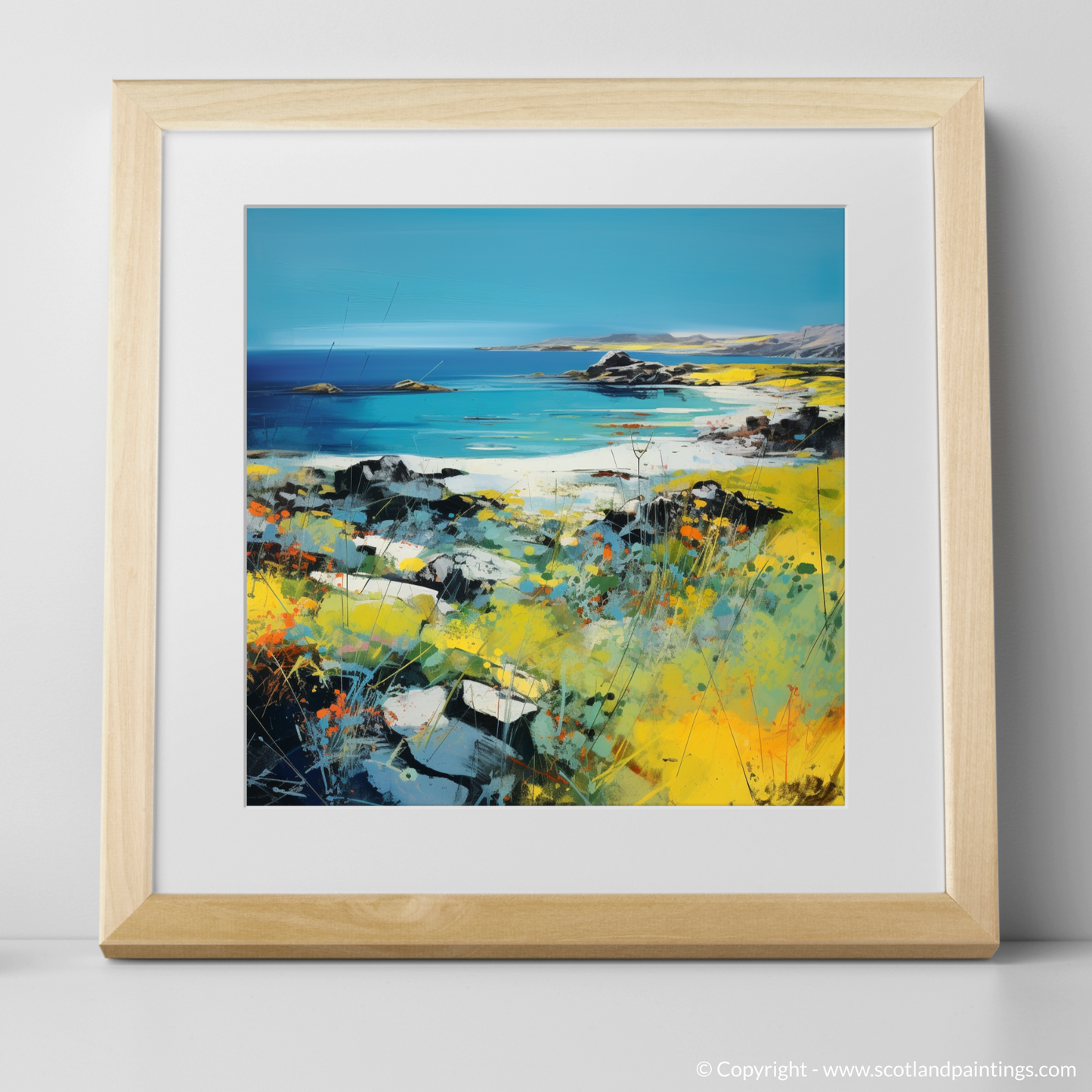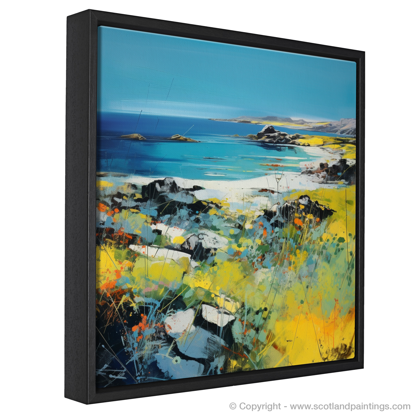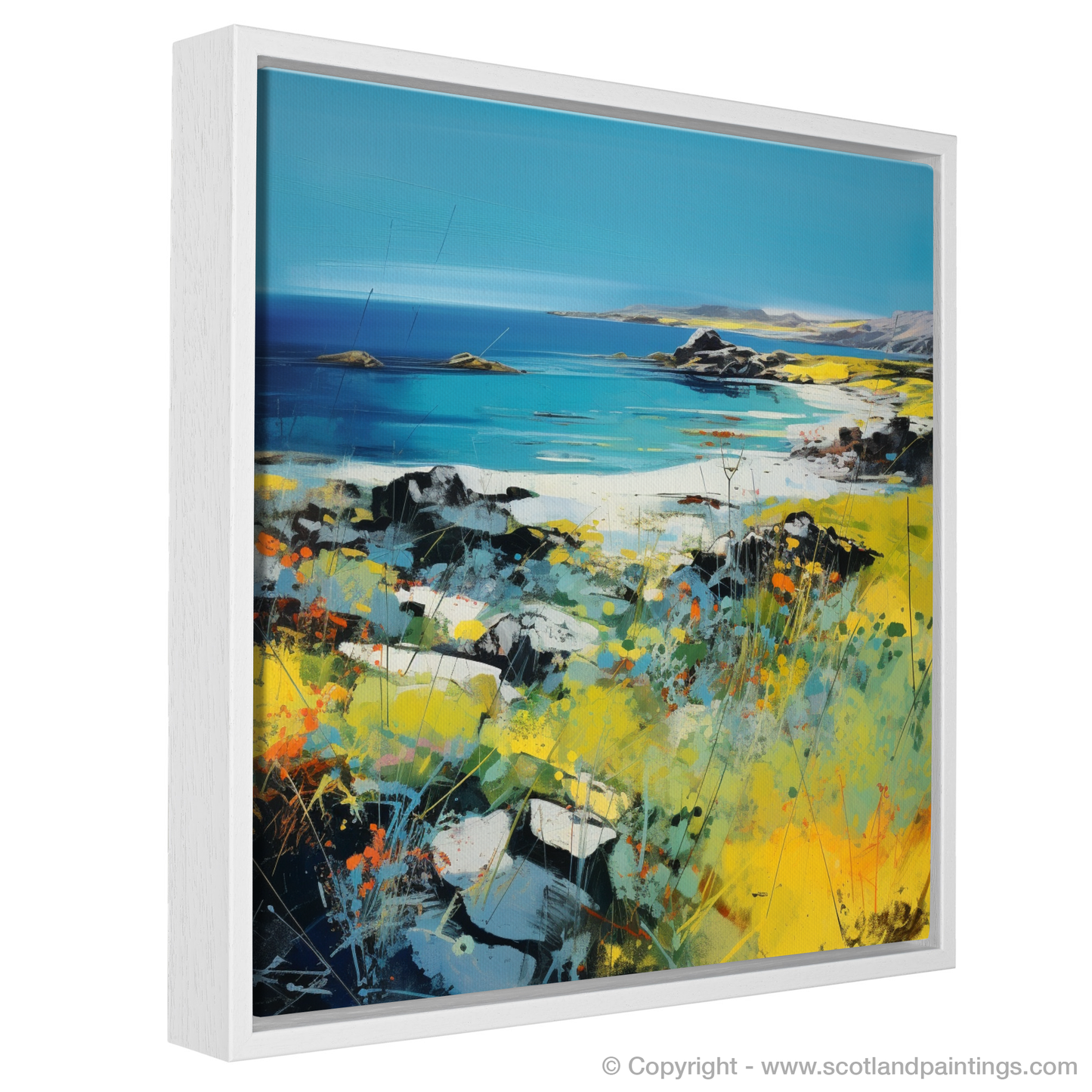 Embark on a visual journey to the serene Isle of Colonsay with this evocative abstract interpretation. Vivid azure blues merge with the horizon, mirroring the endless Scottish summer sky. Splashes of white conjure images of gentle waves lapping against secluded shores, while sun-kissed yellow fields blossom from the canvas, dotted with the fiery oranges and delicate reds of wildflowers swaying in the breeze.