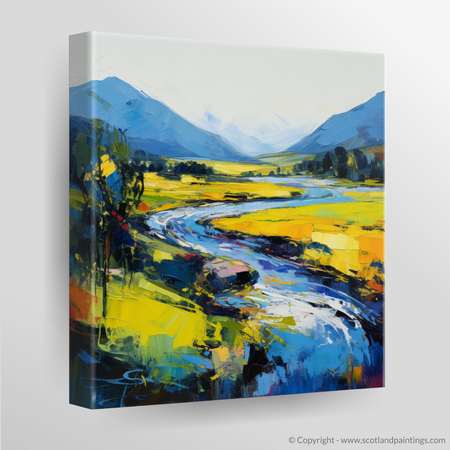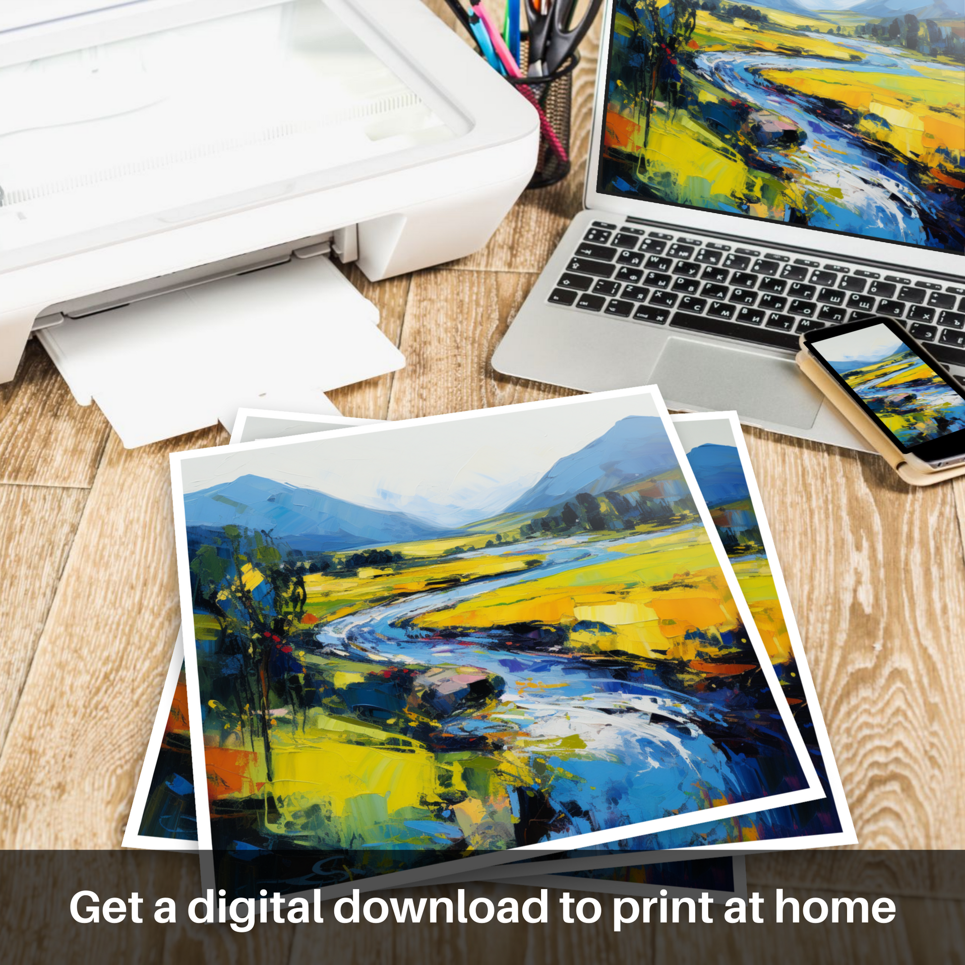 The artwork features a symphony of sunshine yellows and verdant greens, laid down in confident, wide brush strokes that suggest the lush, wild meadows and undulating hills characteristic of the region. Ribbons of azure and sapphire flow across the canvas, reflecting the meandering river that cuts through the valley, providing a striking juxtaposition against the warm hues of the land.