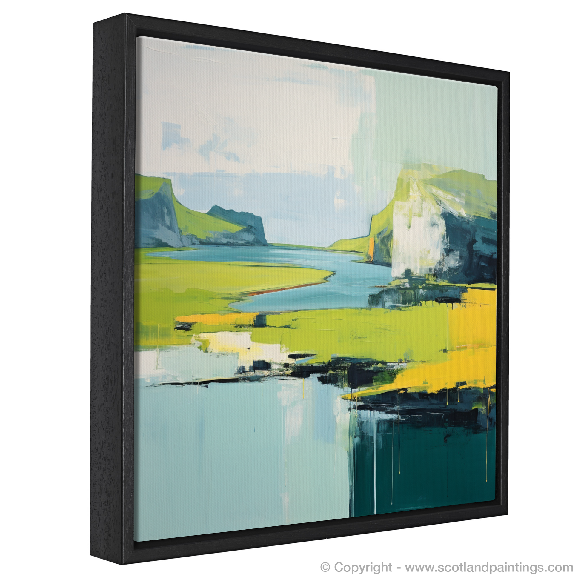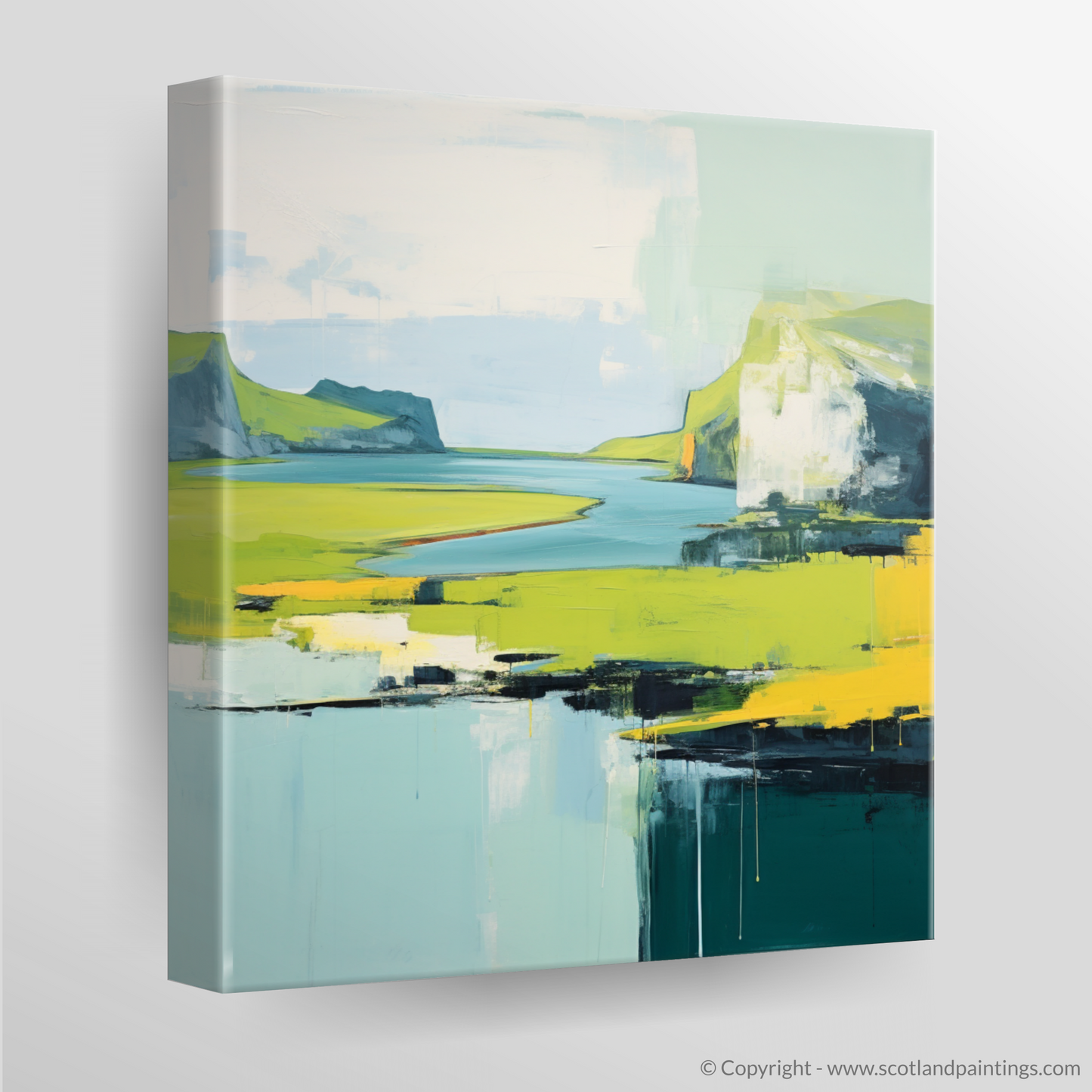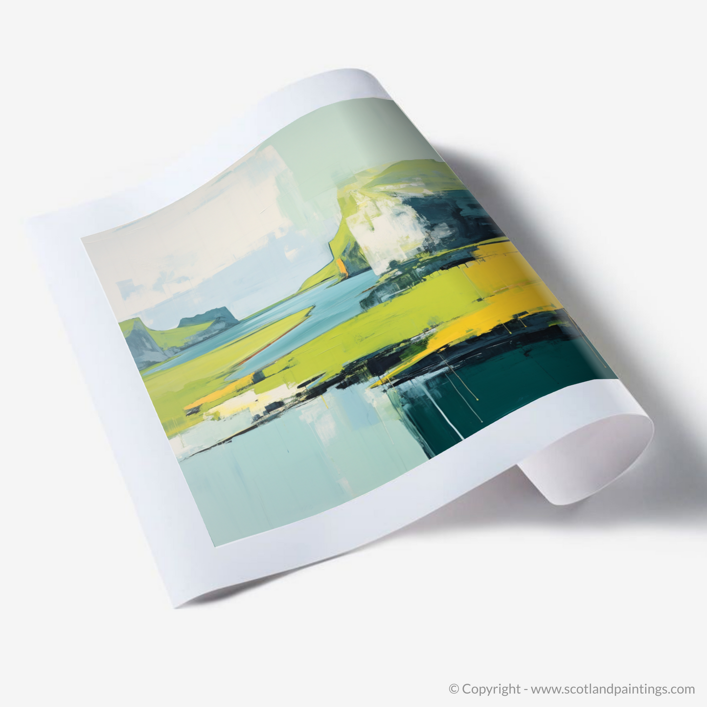 Immerse yourself in the tranquil beauty of the Isle of Skye as conveyed through this stunning minimalist interpretation of its summer landscape. The artwork captures the rugged charm of the Inner Hebrides with a harmonious blend of broad strokes and a distilled palette, evoking a sense of serene simplicity.
