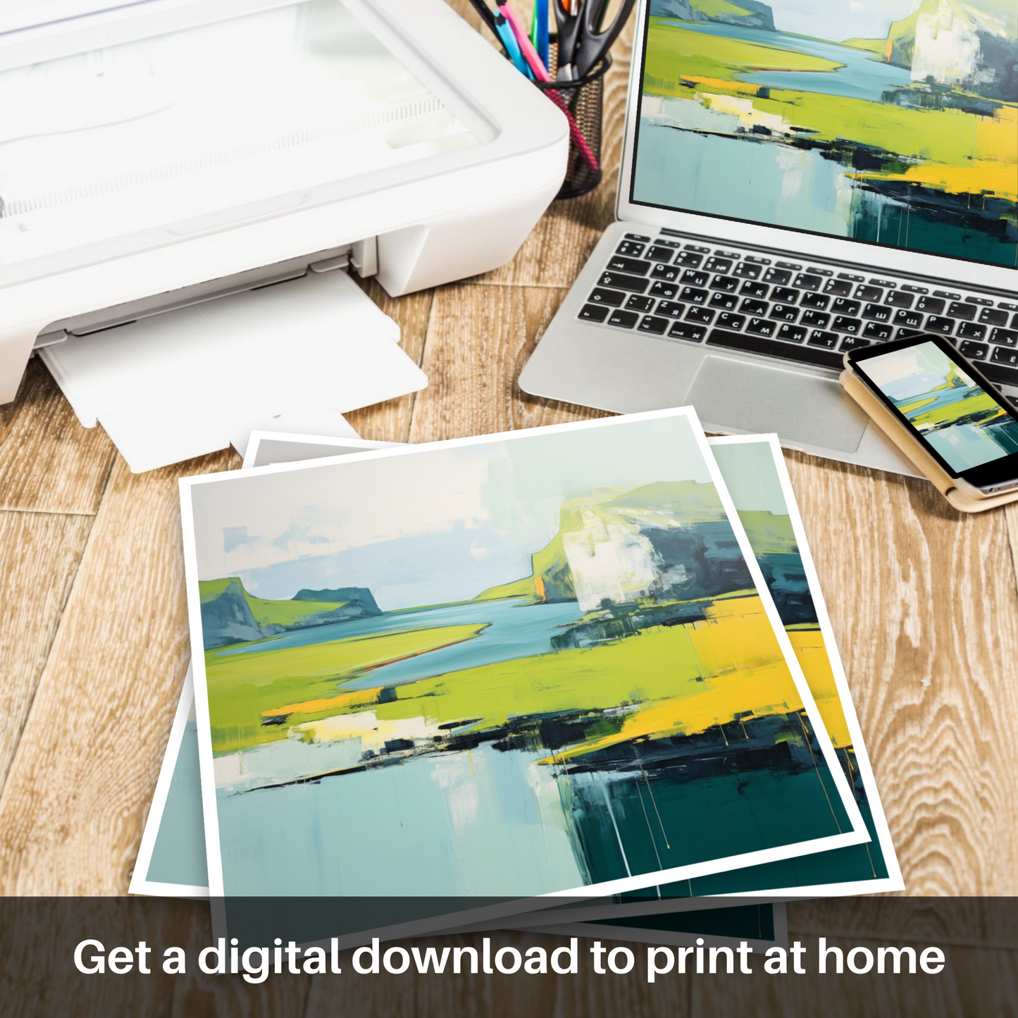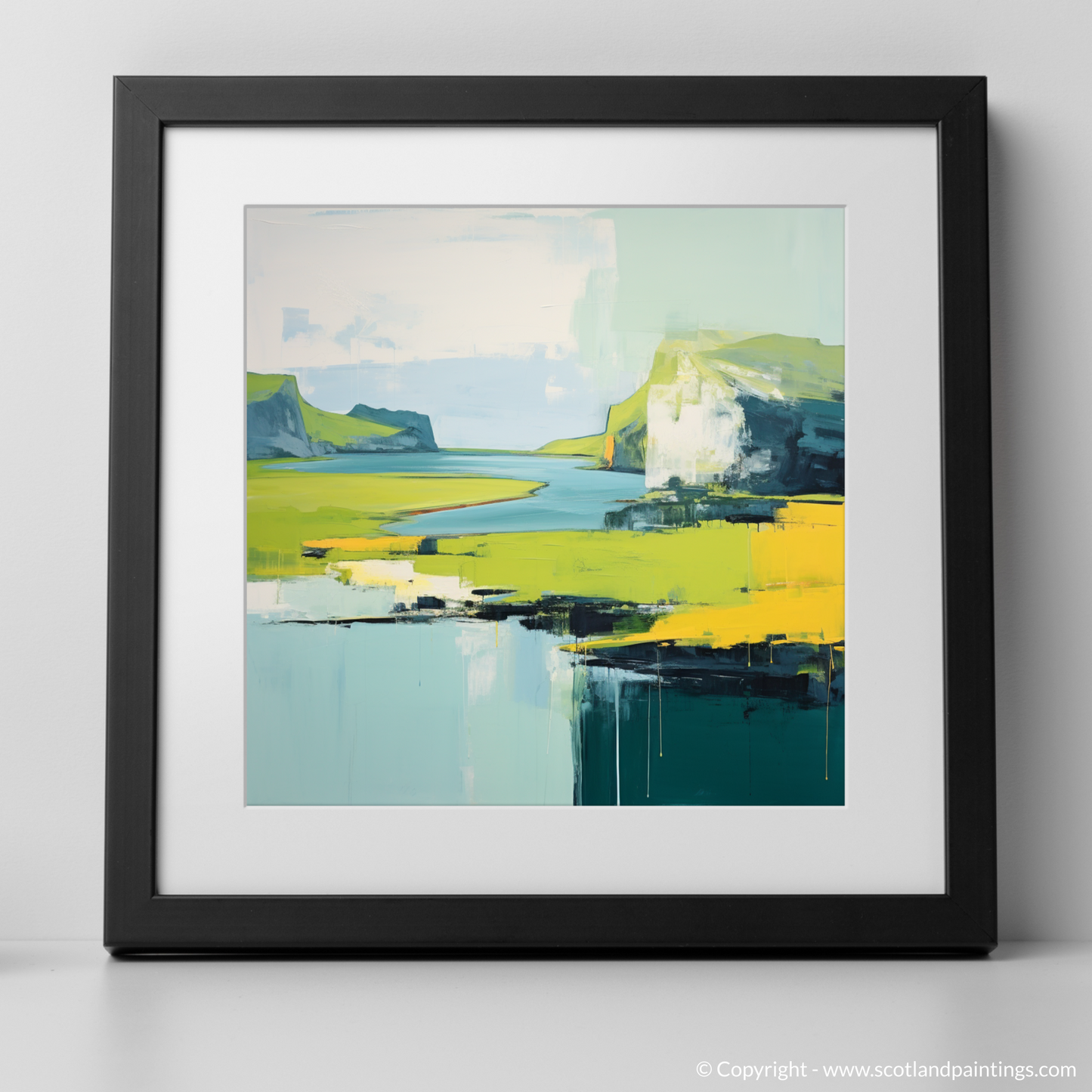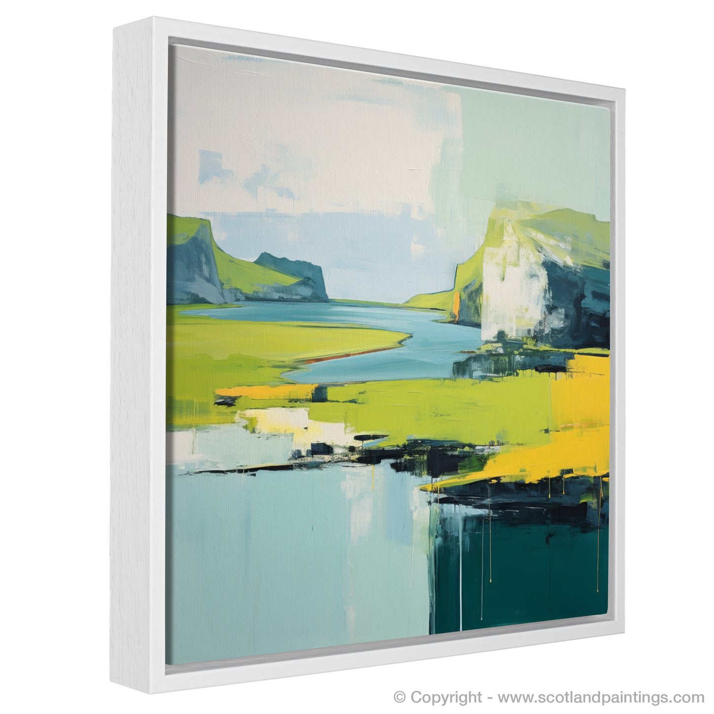 Immerse yourself in the tranquil beauty of the Isle of Skye as conveyed through this stunning minimalist interpretation of its summer landscape. The artwork captures the rugged charm of the Inner Hebrides with a harmonious blend of broad strokes and a distilled palette, evoking a sense of serene simplicity.