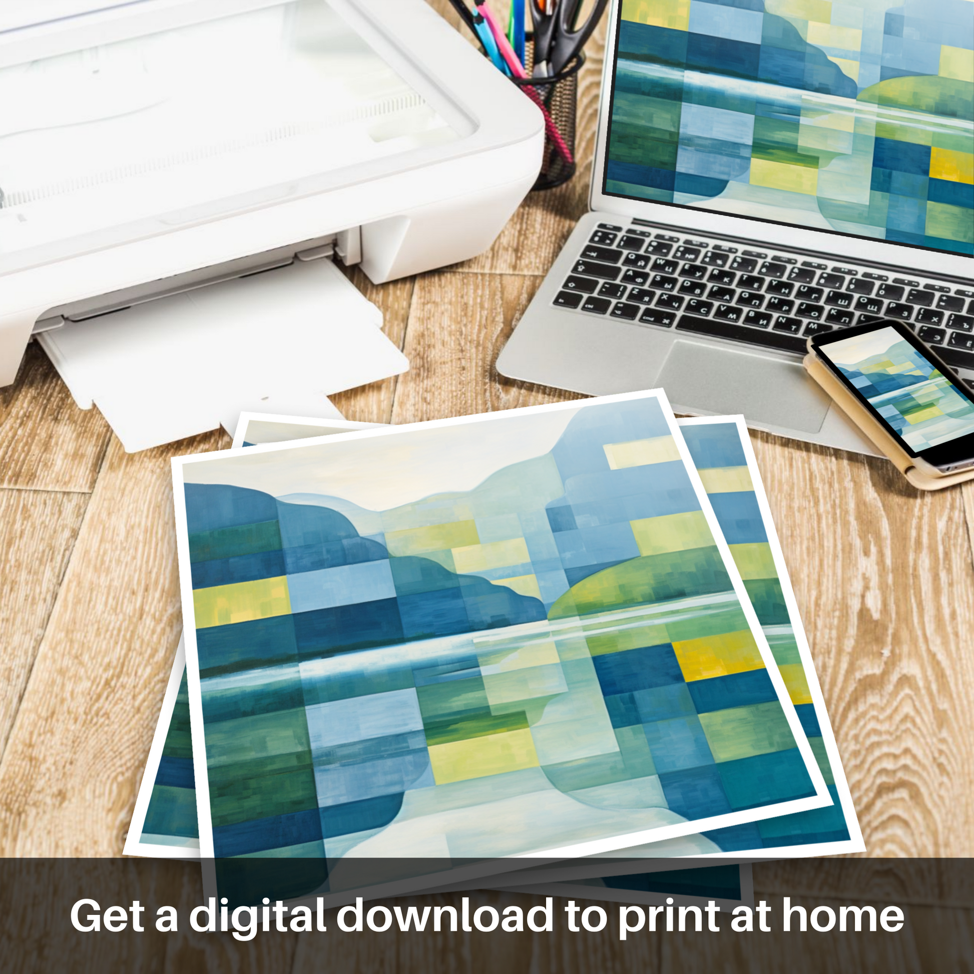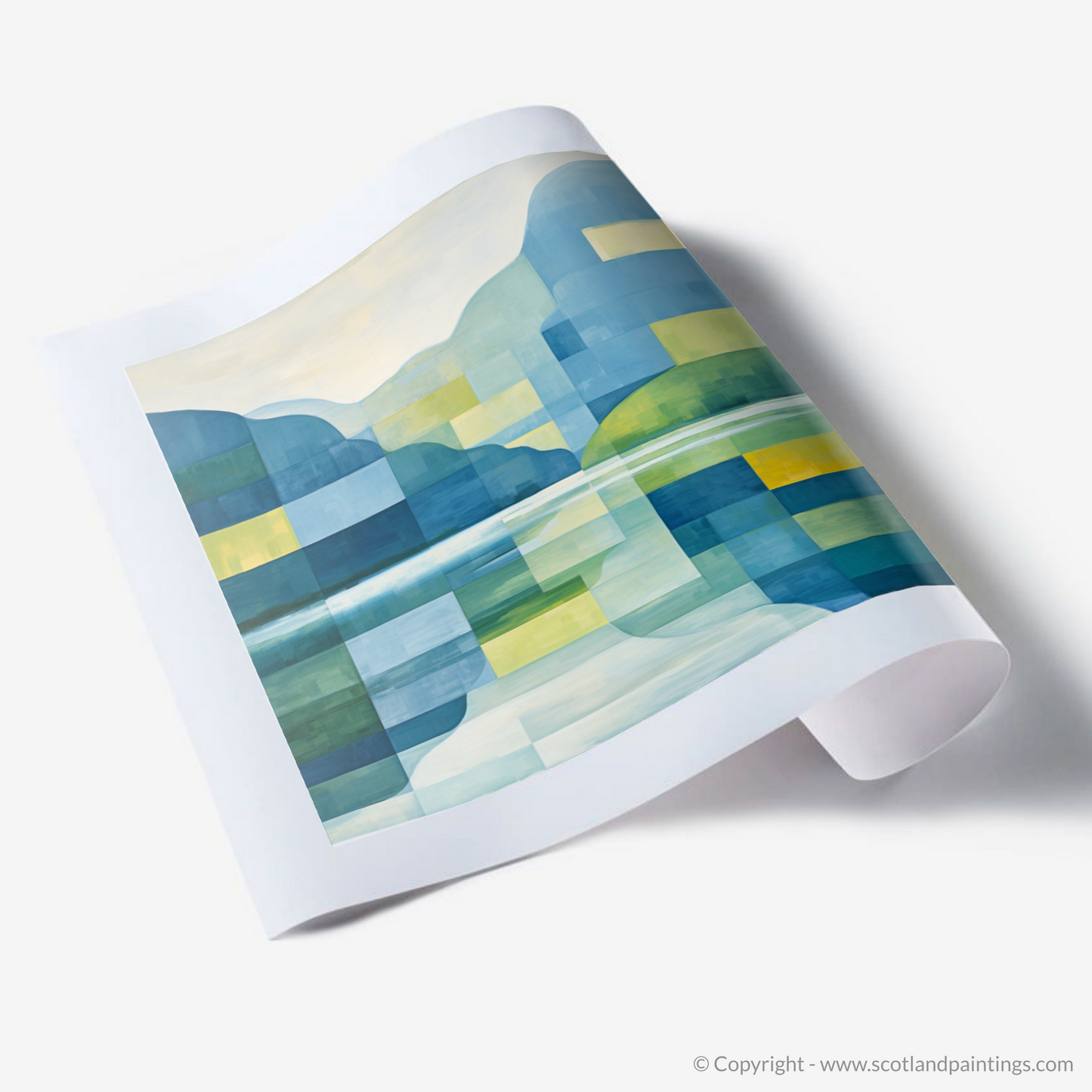 Immerse yourself in the ethereal tranquility of the Scottish Highlands with this abstract print that melds hues reminiscent of the serene Loch Ness during the height of summer. The piece presents an intriguing patchwork of geometric shapes that playfully distort your perspective, inviting the eye to meander through the cool tones representing the water's surface, contrasting against the lush, verdant greens suggestive of the rolling hillsides. Hints of golden yellow intersperse the scene like the gentle break of sunlight through the Scottish mist, providing a warmth to the composition.