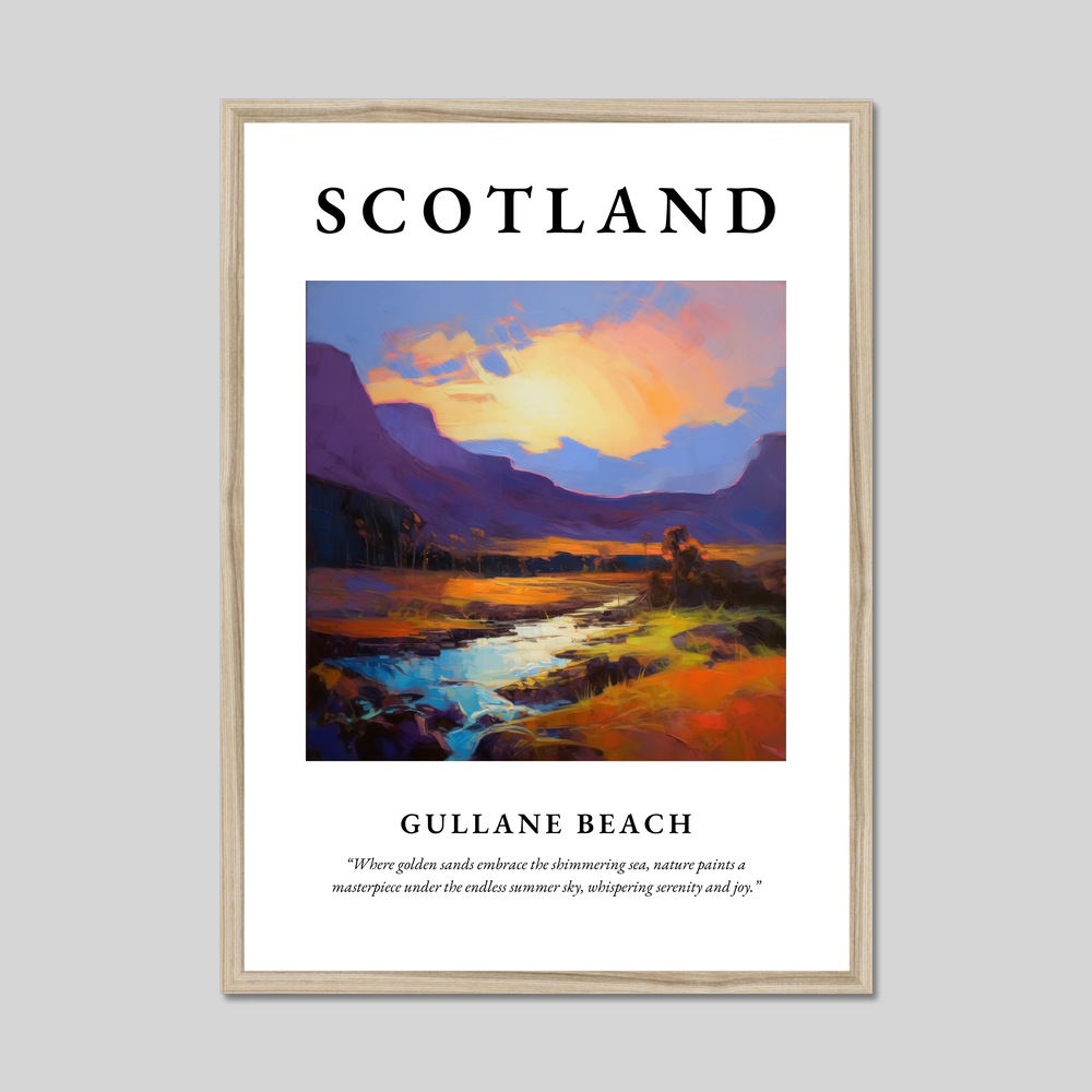 At the top of the print, the commanding title "SCOTLAND" in bold letters sets the stage for the artwork beneath: a mesmerising portrayal of Gullane Beach. Vibrant brushstrokes capture the golden sands melding seamlessly with a shimmering sea under a vast, sun-kissed sky. This painting is a celebration of light and colour, each stroke whispering serenity and joy. The quote that follows further encapsulates this theme, making it an inspiring addition to any space seeking a touch of tranquillity and natural splendour.