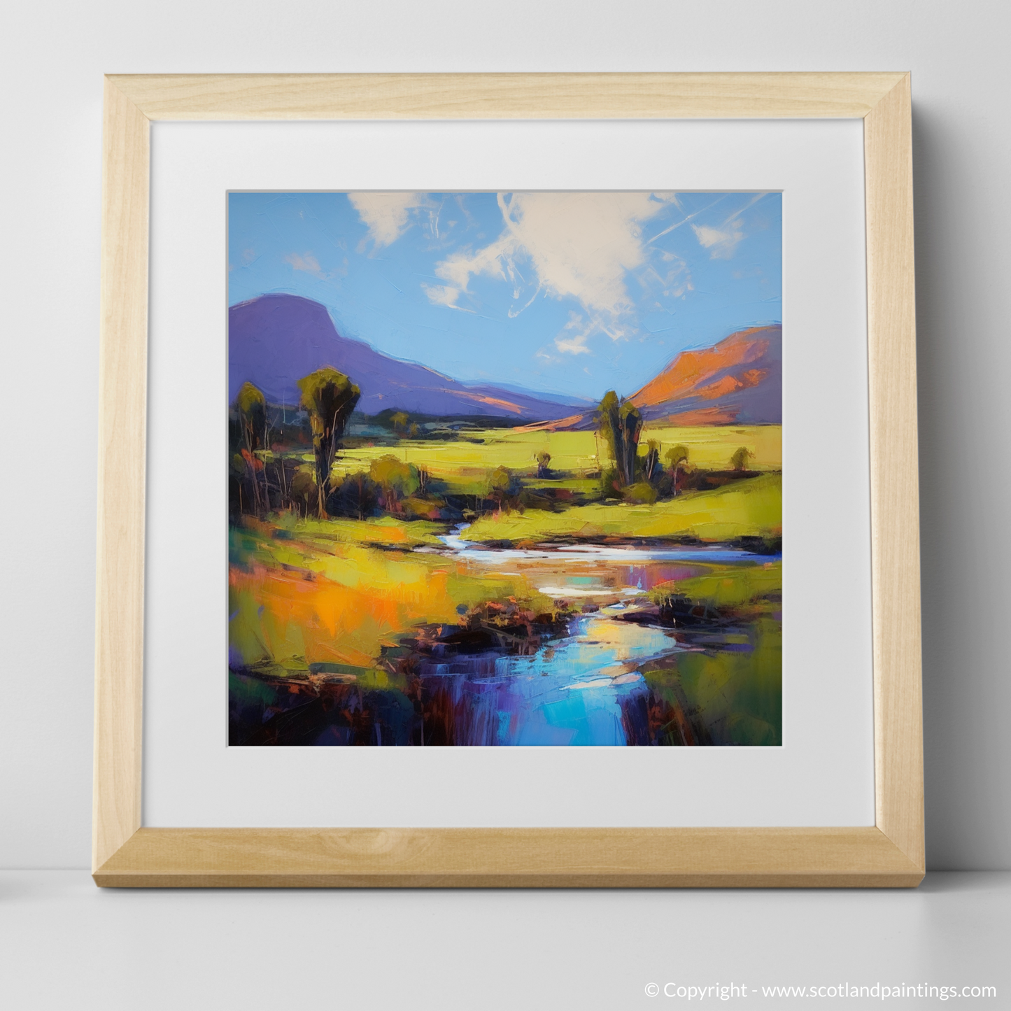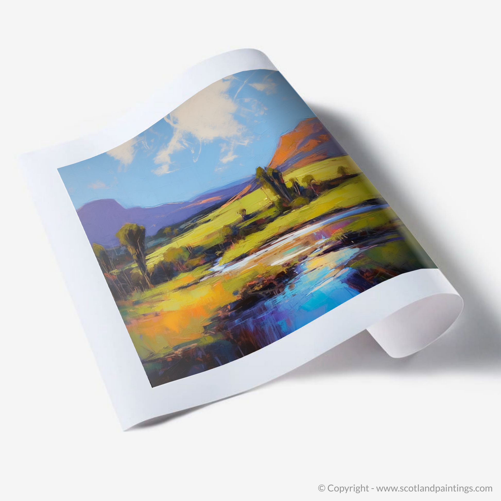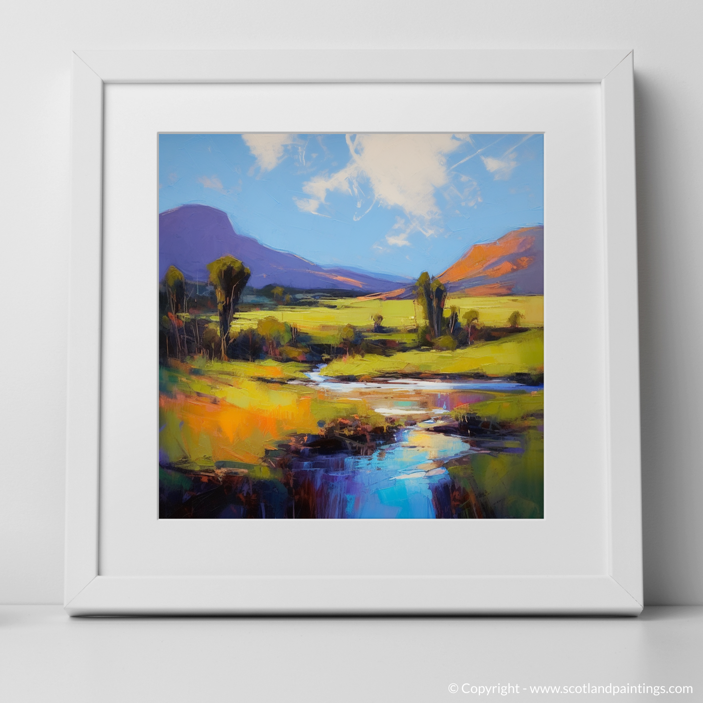 Immerse yourself into a vibrant Scottish landscape with this captivating print, a chromatic homage to the serene beauty of Glen Tilt in Perthshire during the high bloom of summer. With each glance, you find yourself drawn into an expressionistic play of colour and light, where the azure blues of the sky dance with the rich purples of towering hills that stand guard over the verdant valley.