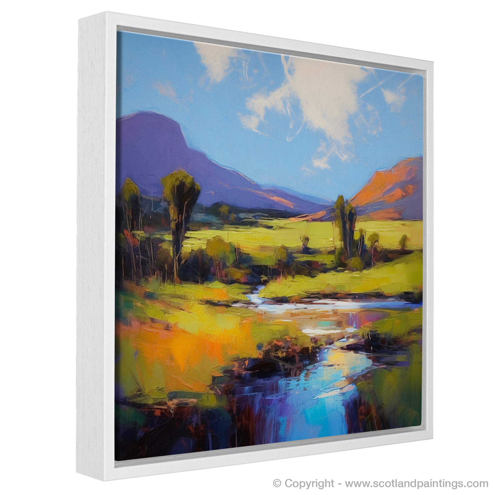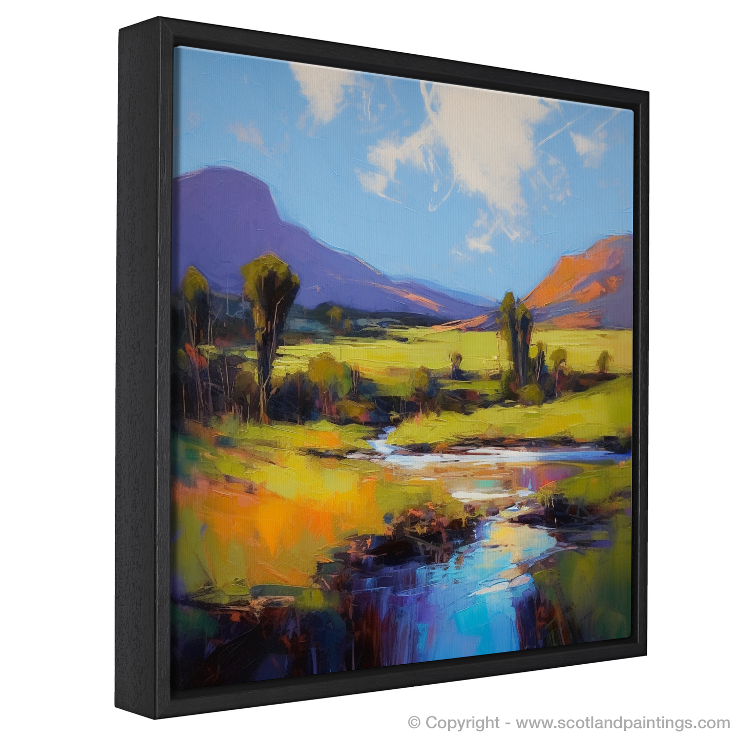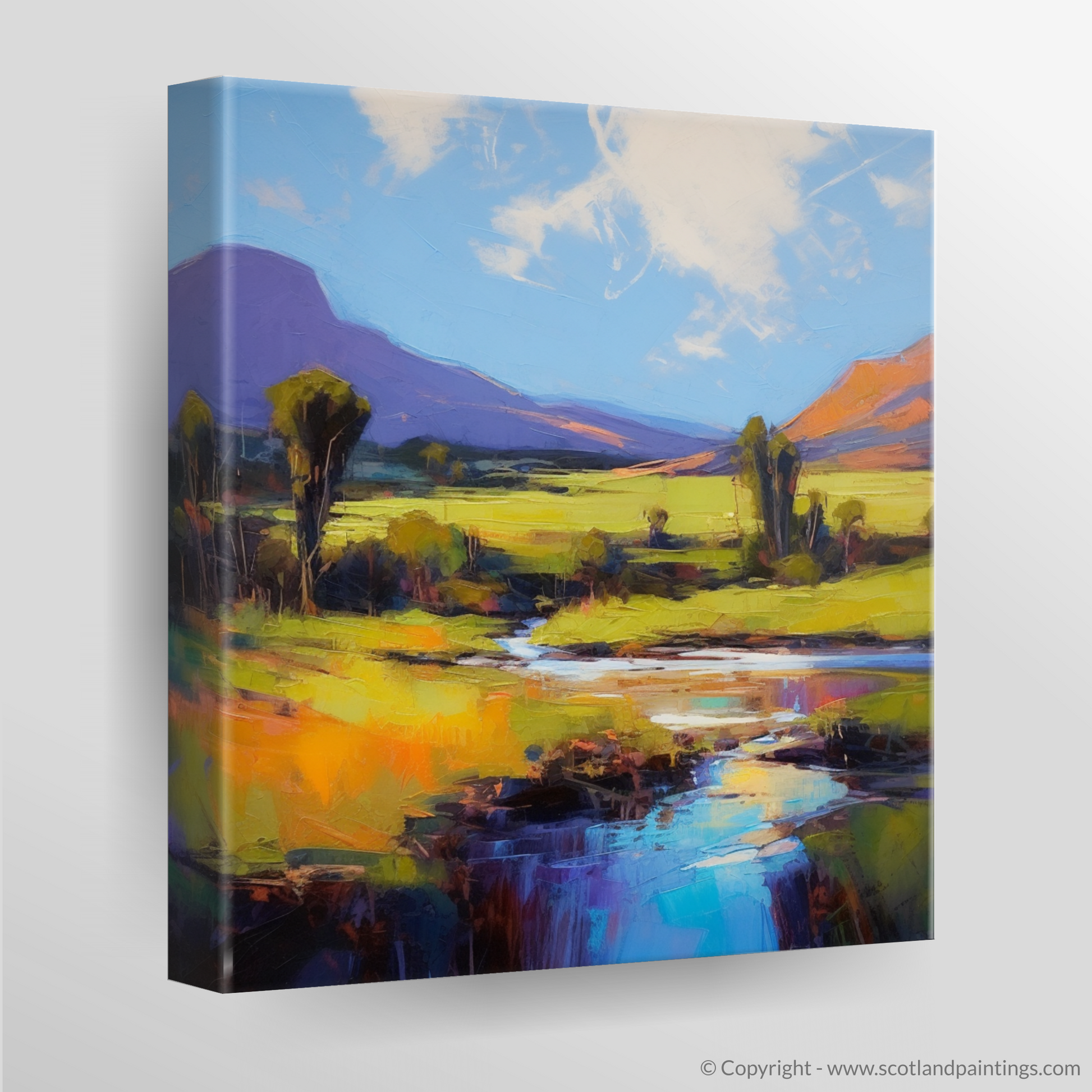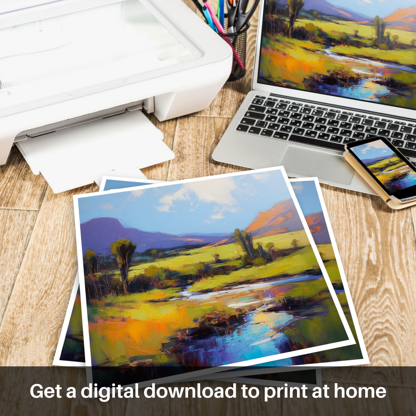 Immerse yourself into a vibrant Scottish landscape with this captivating print, a chromatic homage to the serene beauty of Glen Tilt in Perthshire during the high bloom of summer. With each glance, you find yourself drawn into an expressionistic play of colour and light, where the azure blues of the sky dance with the rich purples of towering hills that stand guard over the verdant valley.