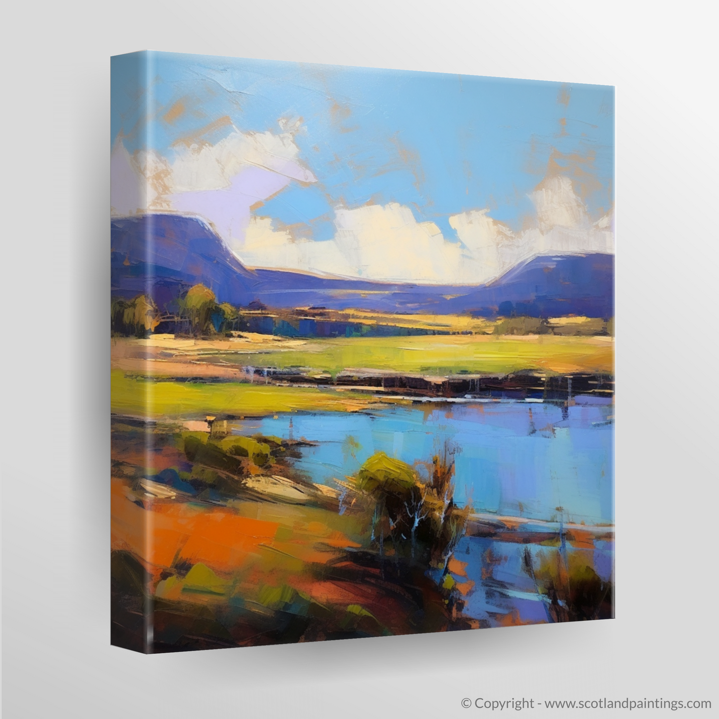 Capture the vibrancy of a Scottish summer with a piece that embodies the dramatic landscape of Loch Doon, Ayrshire, through the emotive strokes of Expressionism. The warm palette of amber, gold, and burnt orange blends seamlessly with the cool sapphire and cerulean hues of the waters, invoking the unique light play of a sun-drenched loch.
