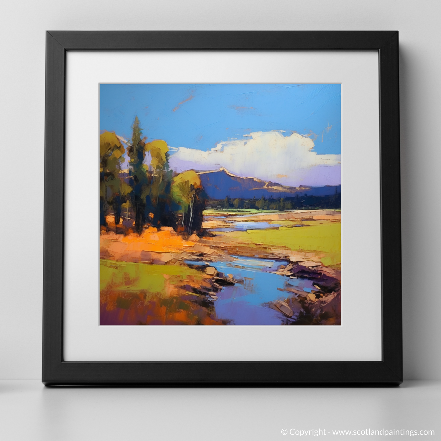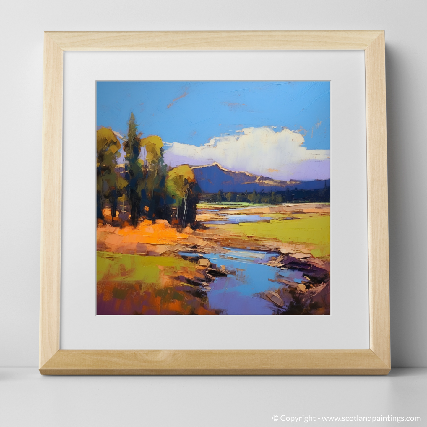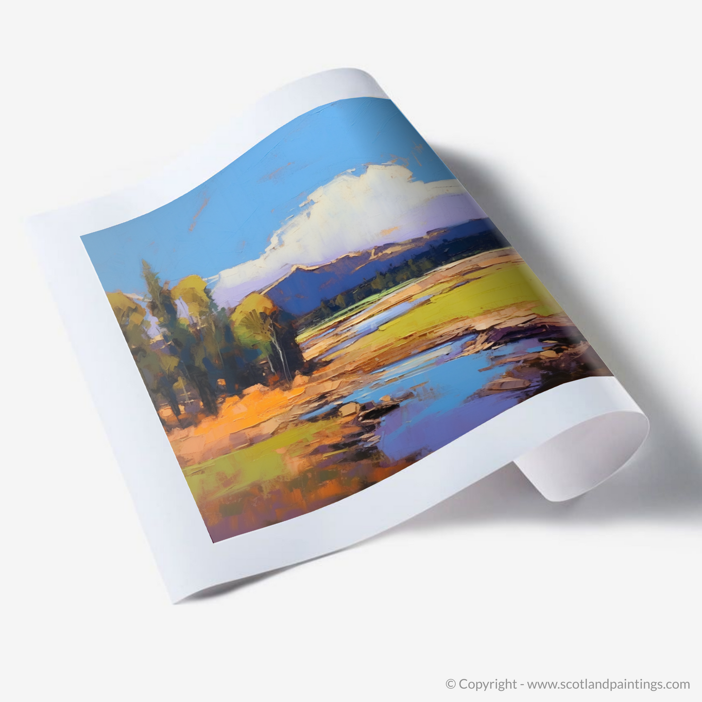 Escape into the vivid hues and vibrant strokes of summer in Aberdeenshire with our evocative print. The artwork captures the essence of Glen Tanar's natural beauty through an Expressionist lens, embracing a palette where blues, purples, and yellows sing in harmony.