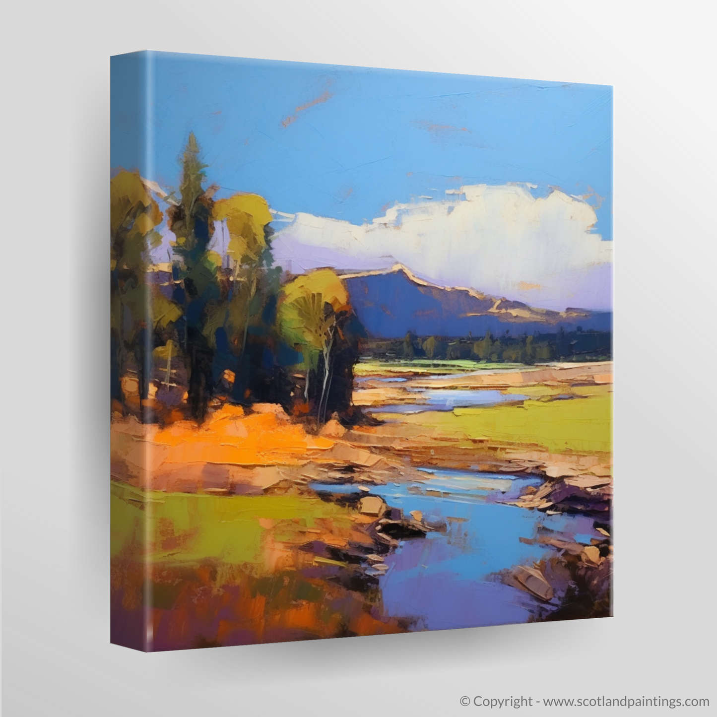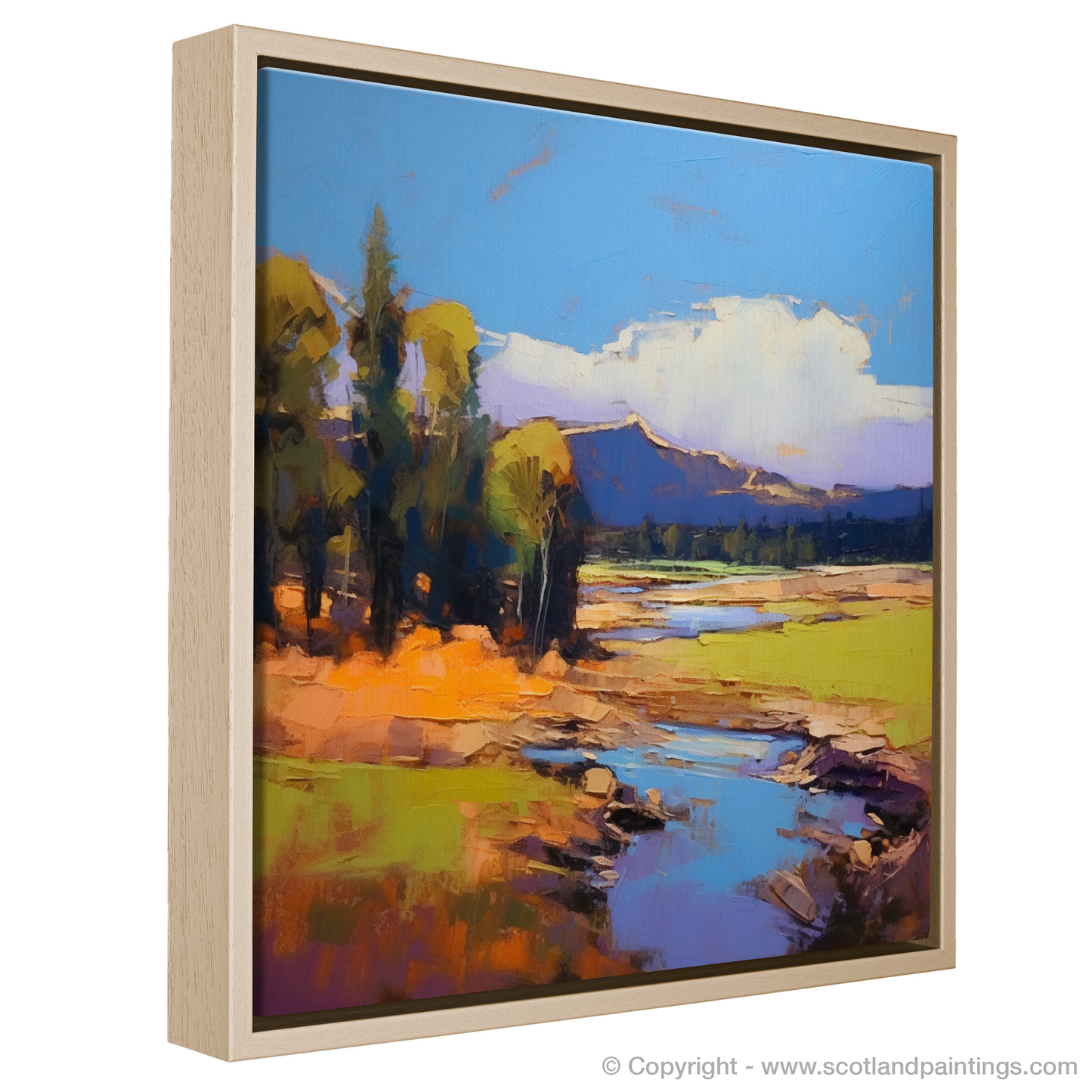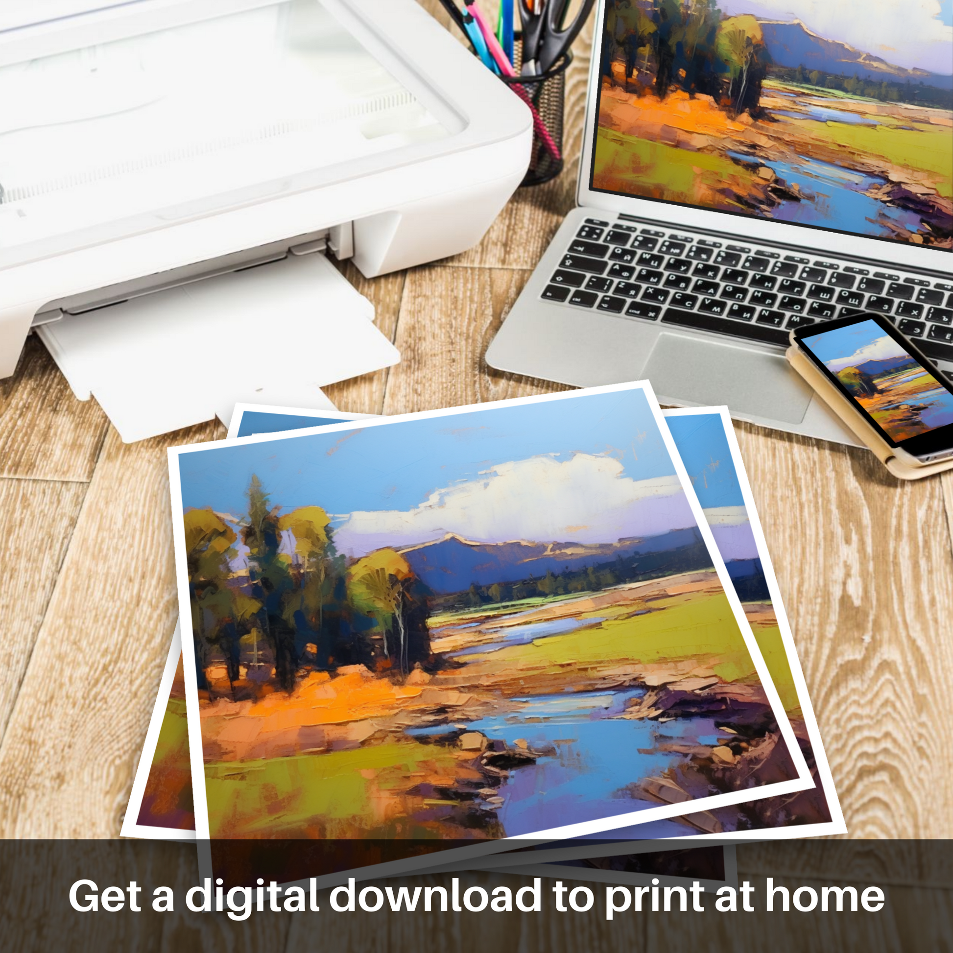 Escape into the vivid hues and vibrant strokes of summer in Aberdeenshire with our evocative print. The artwork captures the essence of Glen Tanar's natural beauty through an Expressionist lens, embracing a palette where blues, purples, and yellows sing in harmony.