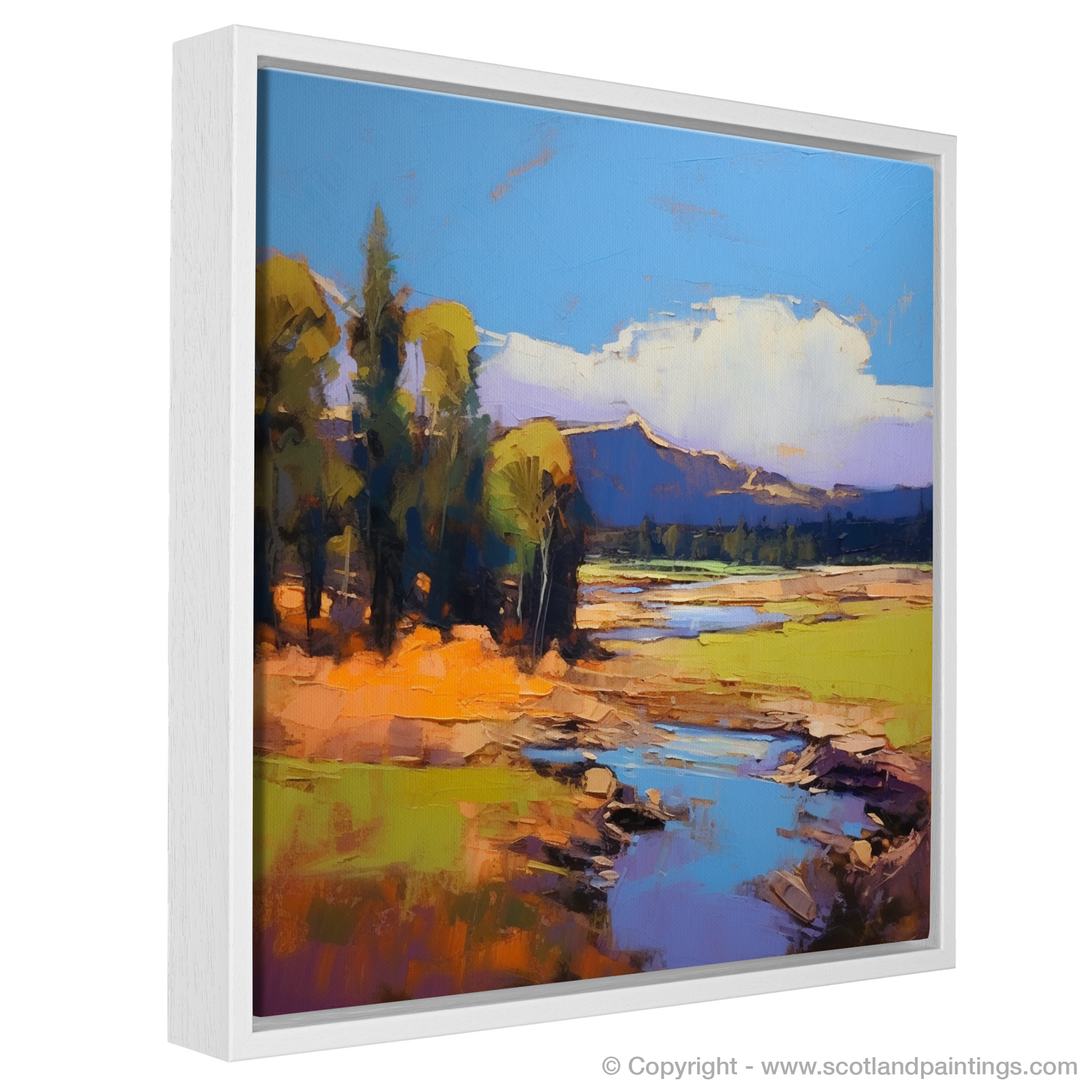 A tranquil river, reflective as a mirror, winds lazily through the composition, bordered by gestural daubs of blue and white that mimic the interplay of water and light. The waterway draws the eye to the distance, where a horizon of rolling mountains, rendered in muted purples and blues, suggests the grandeur of the Scottish Highlands.