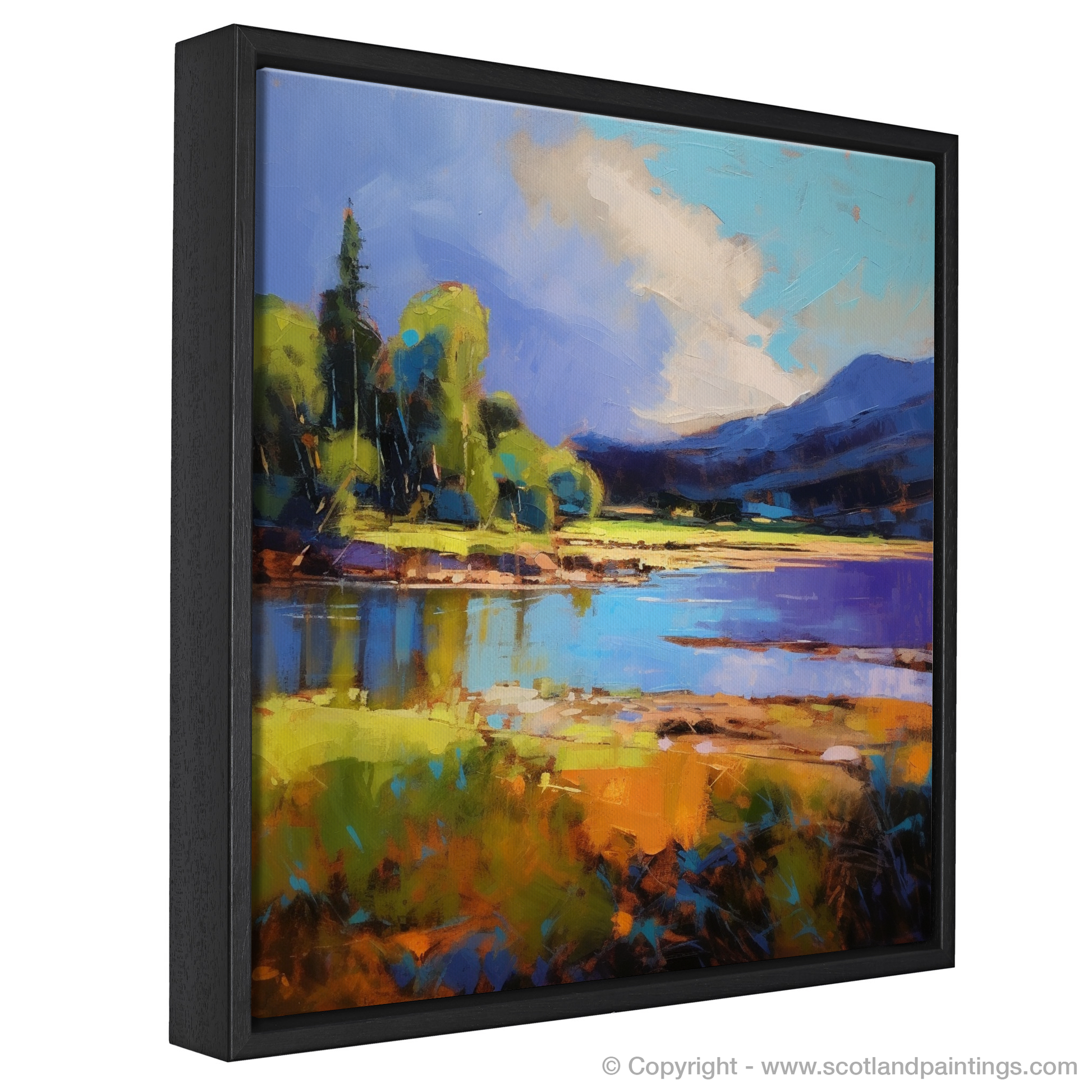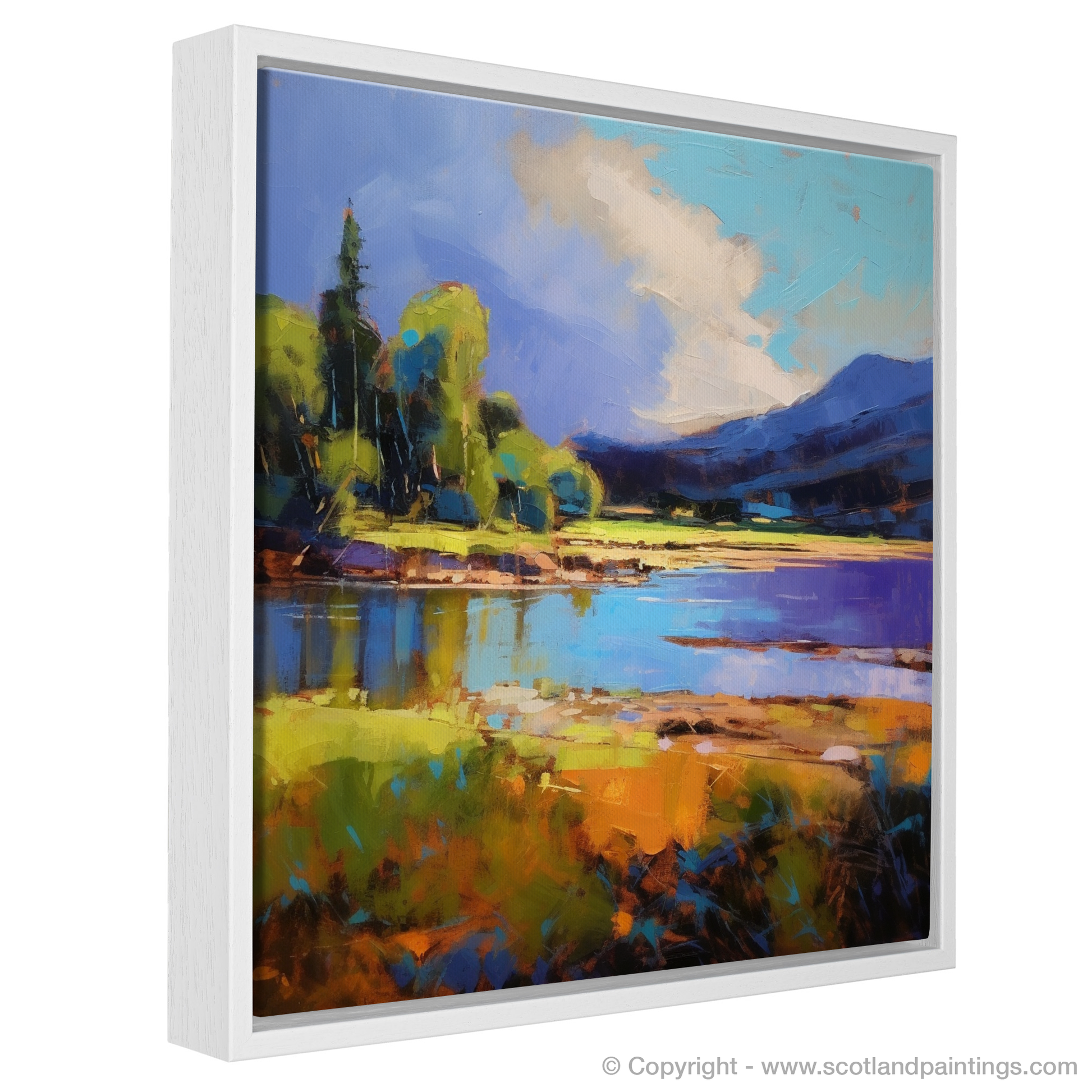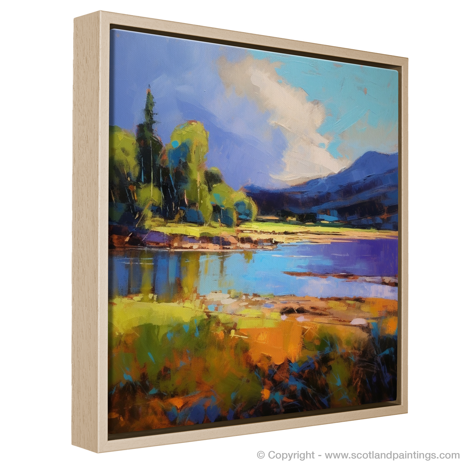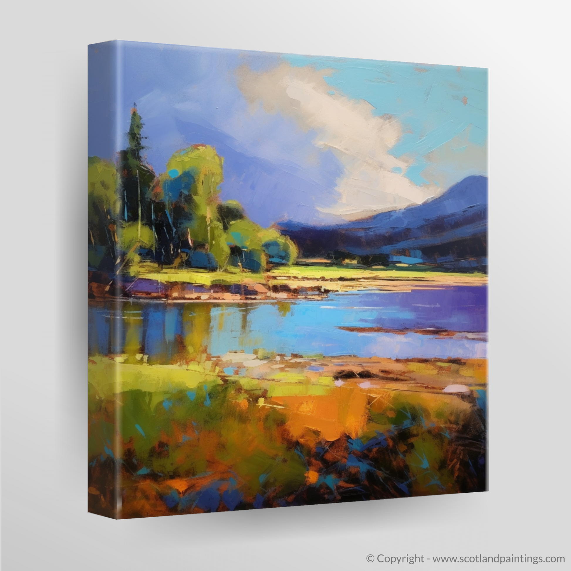The canvas is alive with the interplay of light and colour, as the impressionistic representation of the loch mirrors the azure sky above. Splashes of golden yellows and warm oranges reflect the summer sun's glow on the water's surface, contrasting with the deep blues and cool purples that suggest depth and the gentle flow of the water.