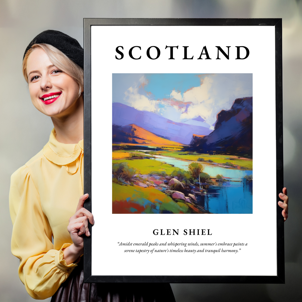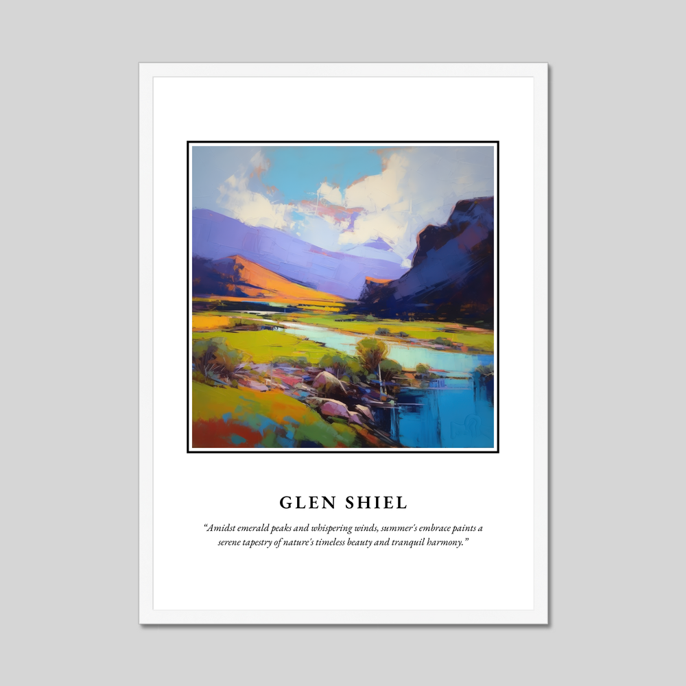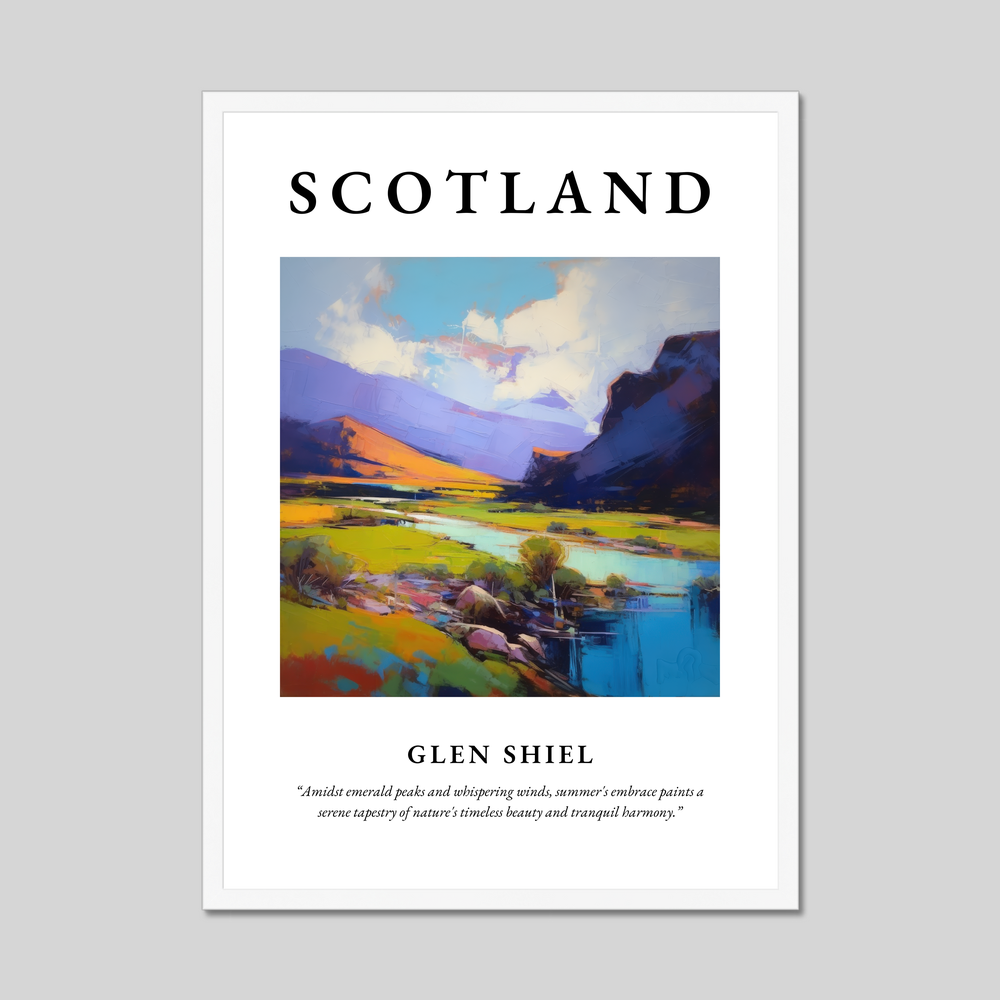 At the top, the bold lettering of "SCOTLAND" draws you in, immediately setting the tone for this dynamic portrayal. The painting of Glen Shiel below radiates with vivid hues—emerald greens, deep purples, and cerulean blues—depicting an idyllic summer day where each peak and valley seems to whisper its story. Completing the composition, the quote, “Amidst emerald peaks and whispering winds, summer's embrace paints a serene tapestry of nature's timeless beauty and tranquil harmony,” evokes a sense of peace and connection to the land that anyone who loves Scotland or its art will find captivating.