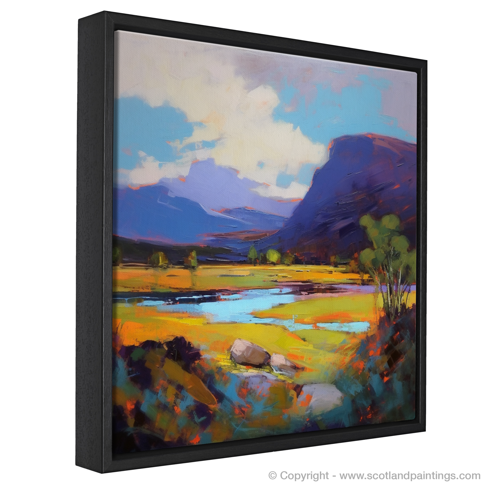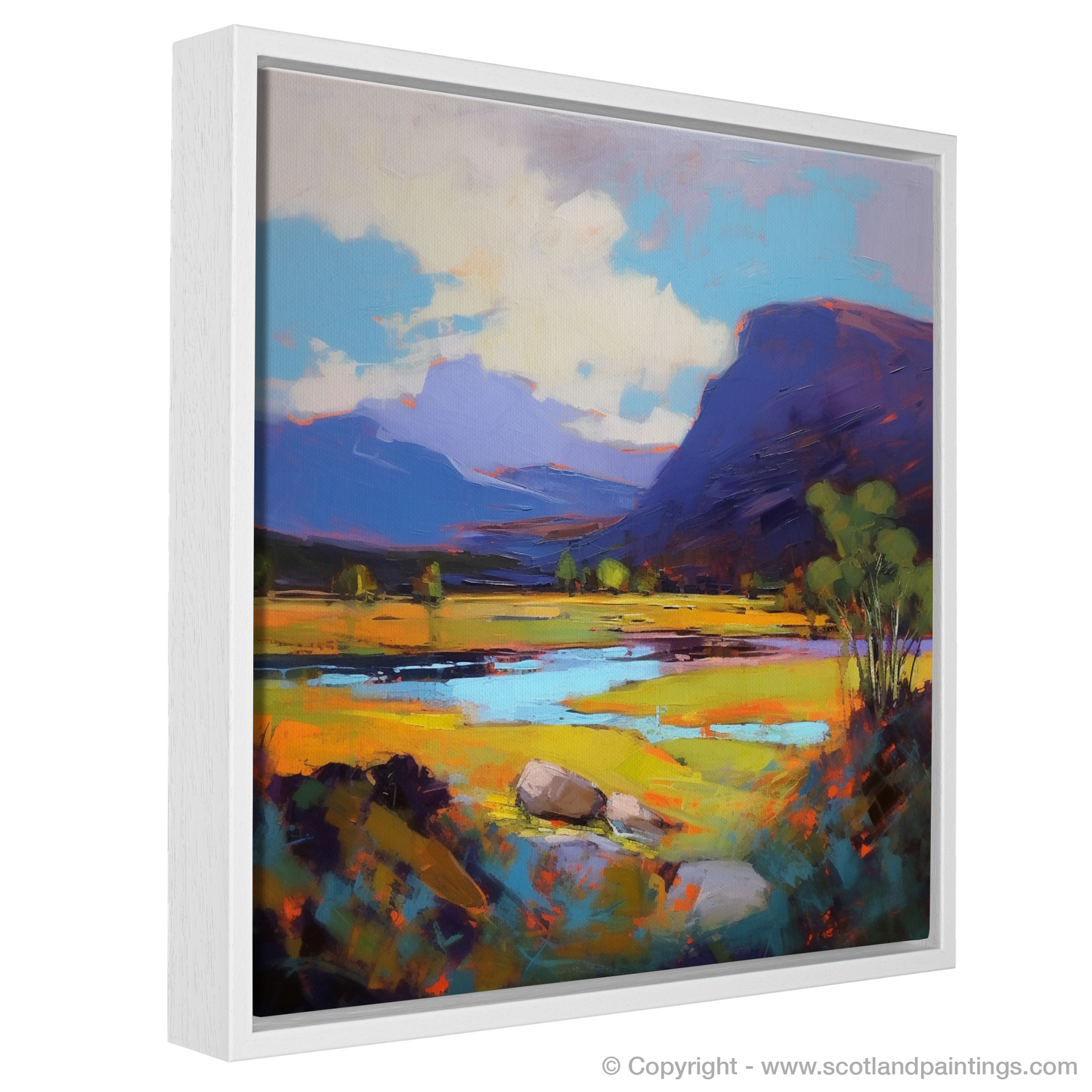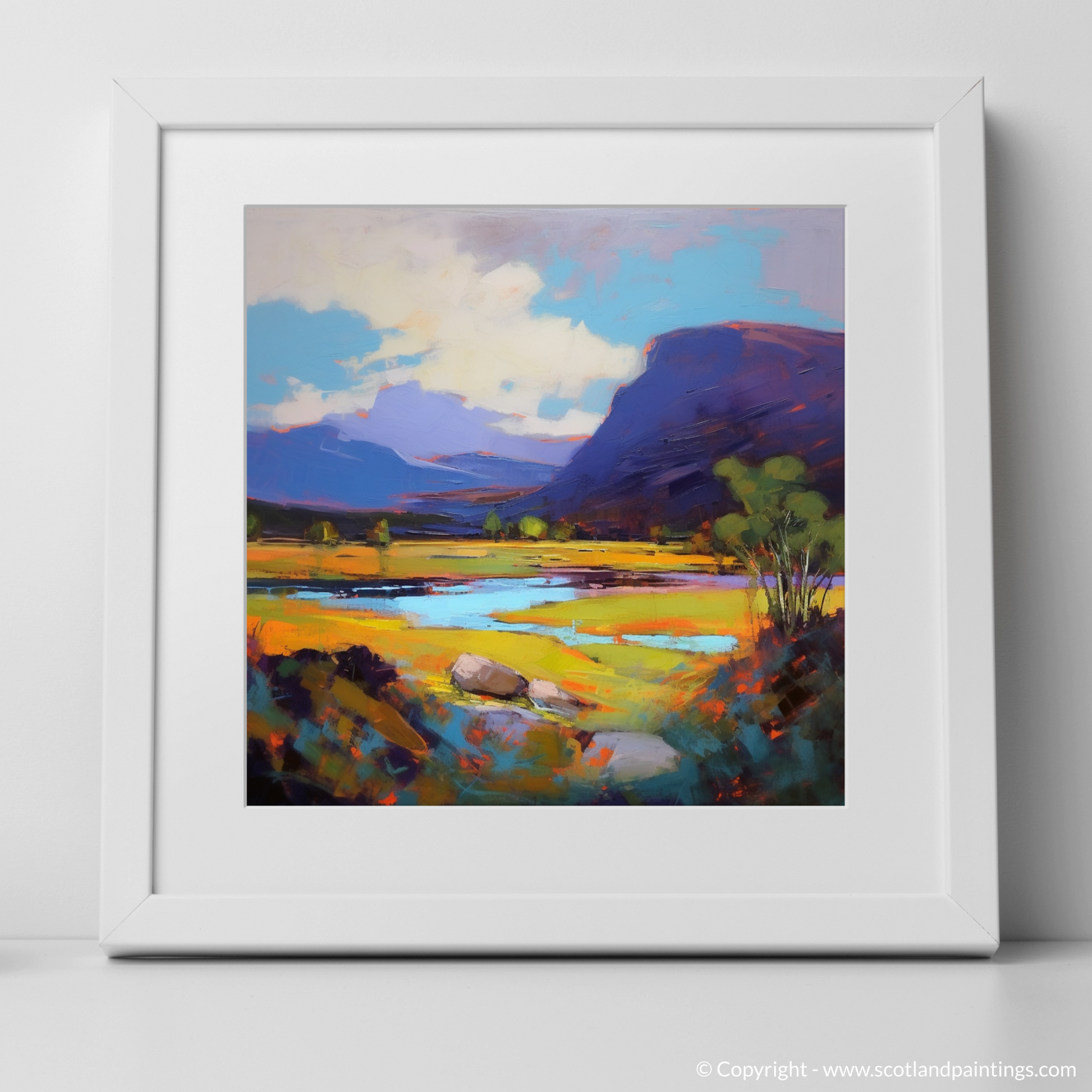 Capturing the effervescent glow of the Scottish Highlands at the height of summer, this expressive print evokes the untamed beauty of Glen Shiel with bold, impasto brushstrokes and an electrifying palette. The scene is ablaze with the warmth of the season, where sun-dappled fields meet the cool serenity of the river, creating an inviting path of light through the wild landscape.