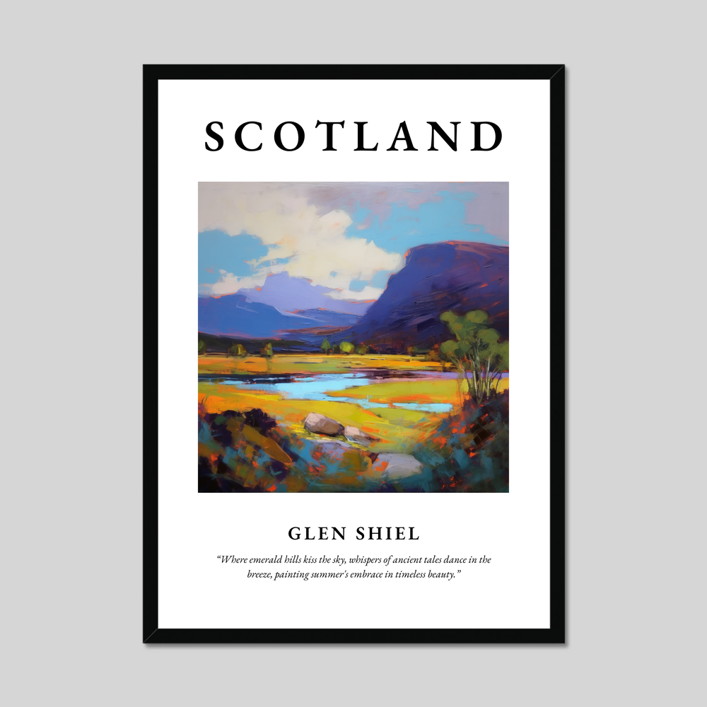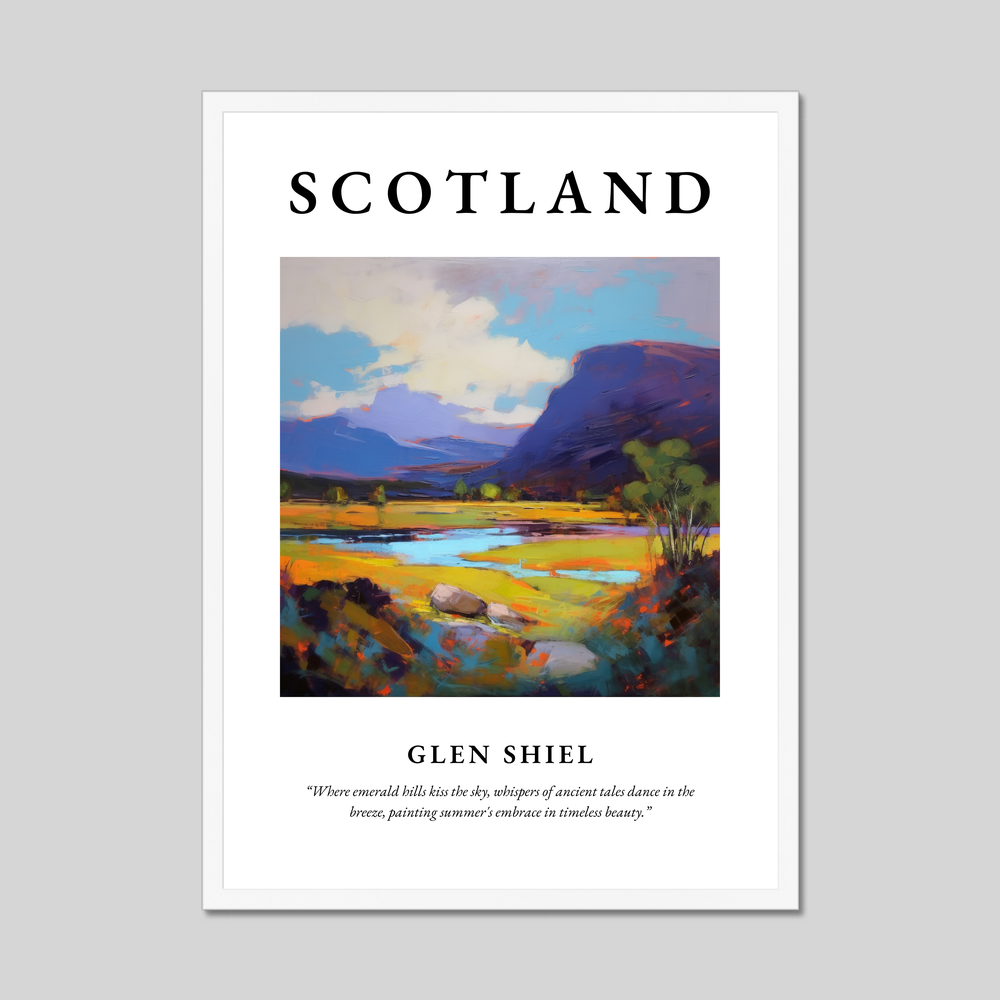 Nestled in the heart of the Highlands, Glen Shiel is a place where history and nature intertwine, offering breathtaking views and a rich tapestry of heritage. Known for its dramatic landscapes and storied past, it is a location that inspires awe and contemplation. This poster captures the enduring spirit of this majestic glen, encapsulating its vibrant fields and towering peaks that echo tales from ages past.