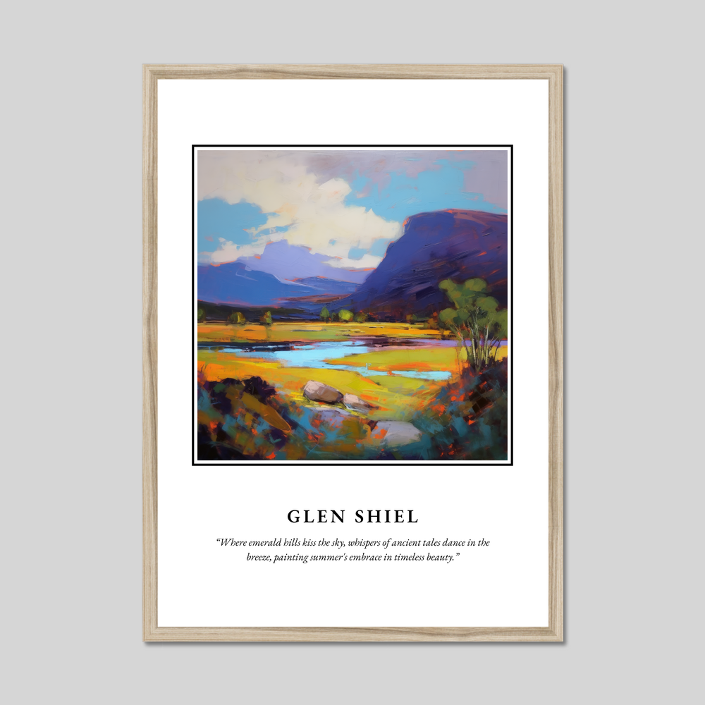 In this striking expressionist piece from our "Scotland in Summer" collection, the word “SCOTLAND” boldly crowns the top, while underneath lies a vibrant depiction of Glen Shiel’s dramatic landscape. The colours dance across the canvas, capturing the essence of a summer’s day where emerald hills gracefully meet a sky painted in dynamic hues. Beneath the painting, the poignant words, “Where emerald hills kiss the sky, whispers of ancient tales dance in the breeze, painting summer's embrace in timeless beauty,” further evoke the magic and mystery of this natural wonder.