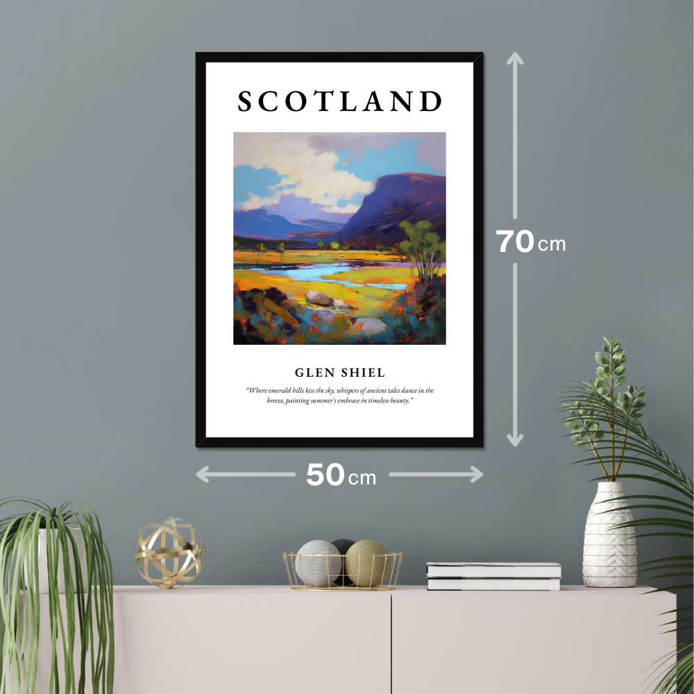 Immerse yourself in the captivating allure of the Scottish Highlands with our exquisite framed poster print, a perfect testament to the timeless beauty of Glen Shiel. At 50cm x 70cm, this poster is designed to make a bold statement in any room, providing expansive coverage of your wall space without breaking the bank.
