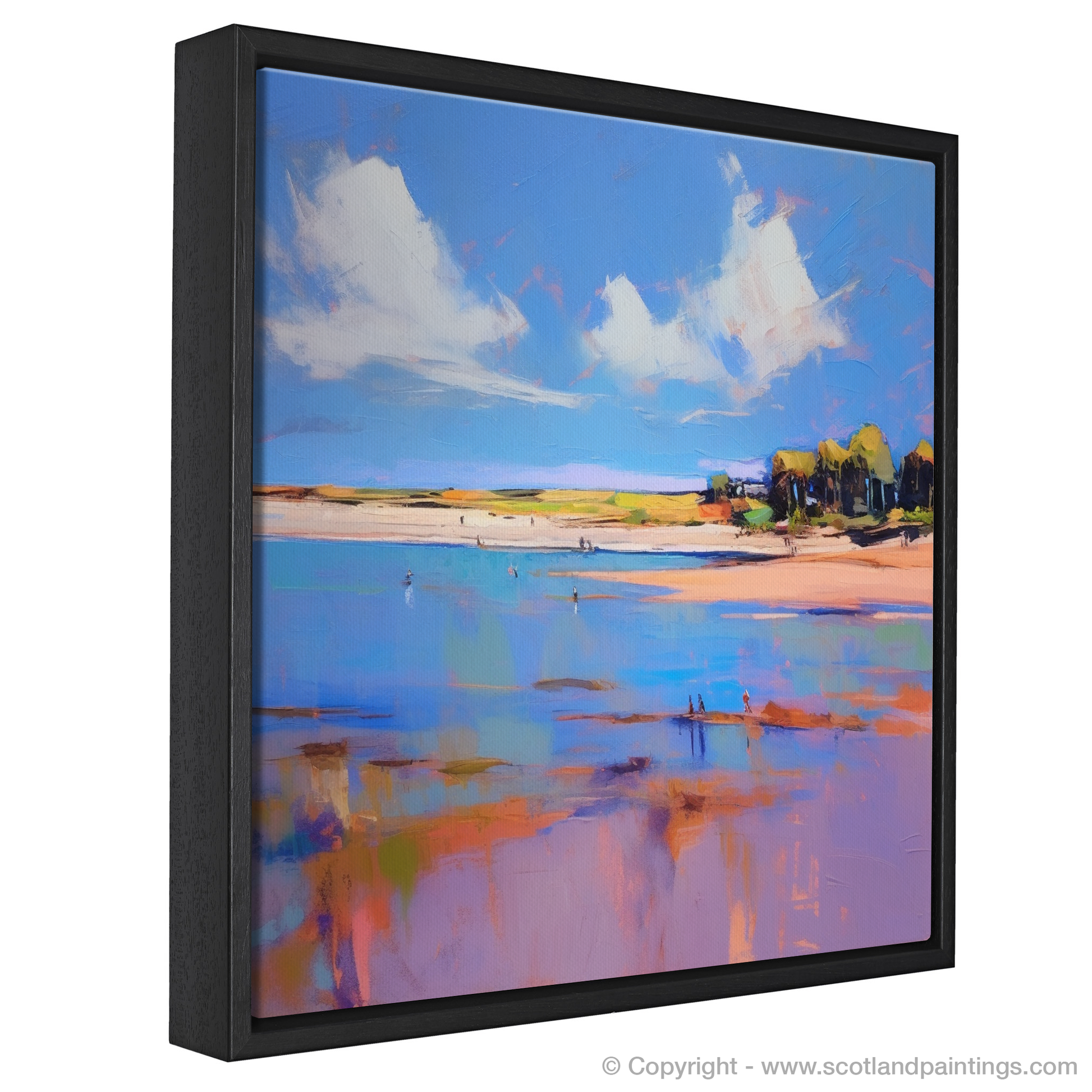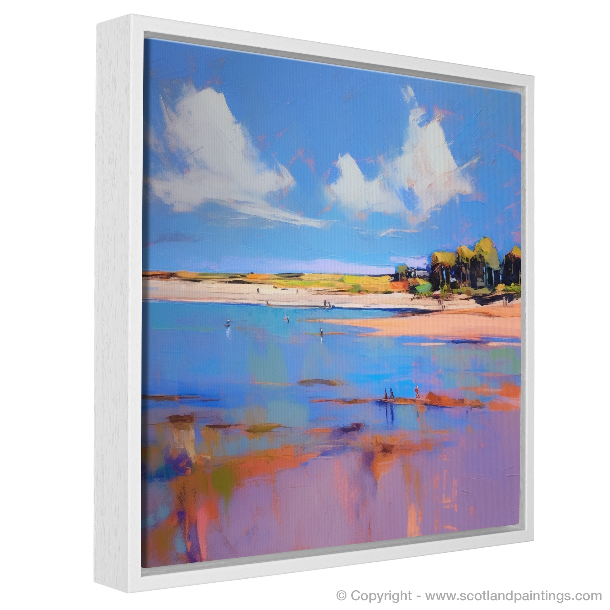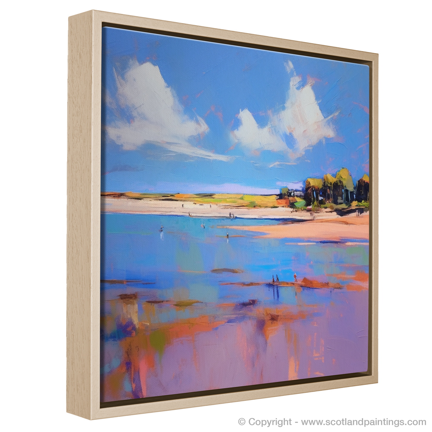 Capturing the vibrant essence of summer on the Scottish coast, this expressive piece brings West Sands, St Andrews to life with exuberant colour and dynamic brush strokes. At first glance, the scene invites you into a world where the blue of the sky meets the azure tones of the sea in a perfect symphony, while blushing shades of sand warm the canvas, reflecting the gentle kiss of the summer sun.