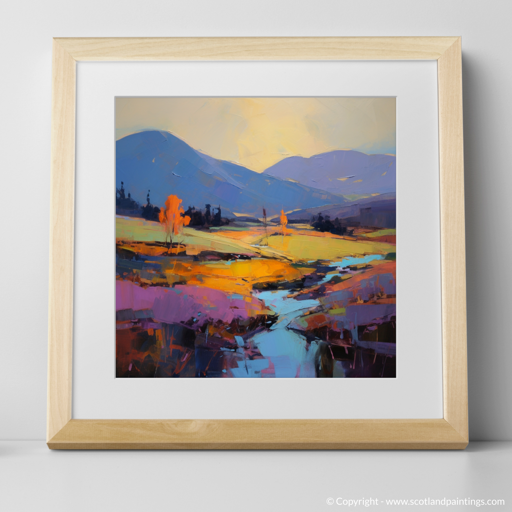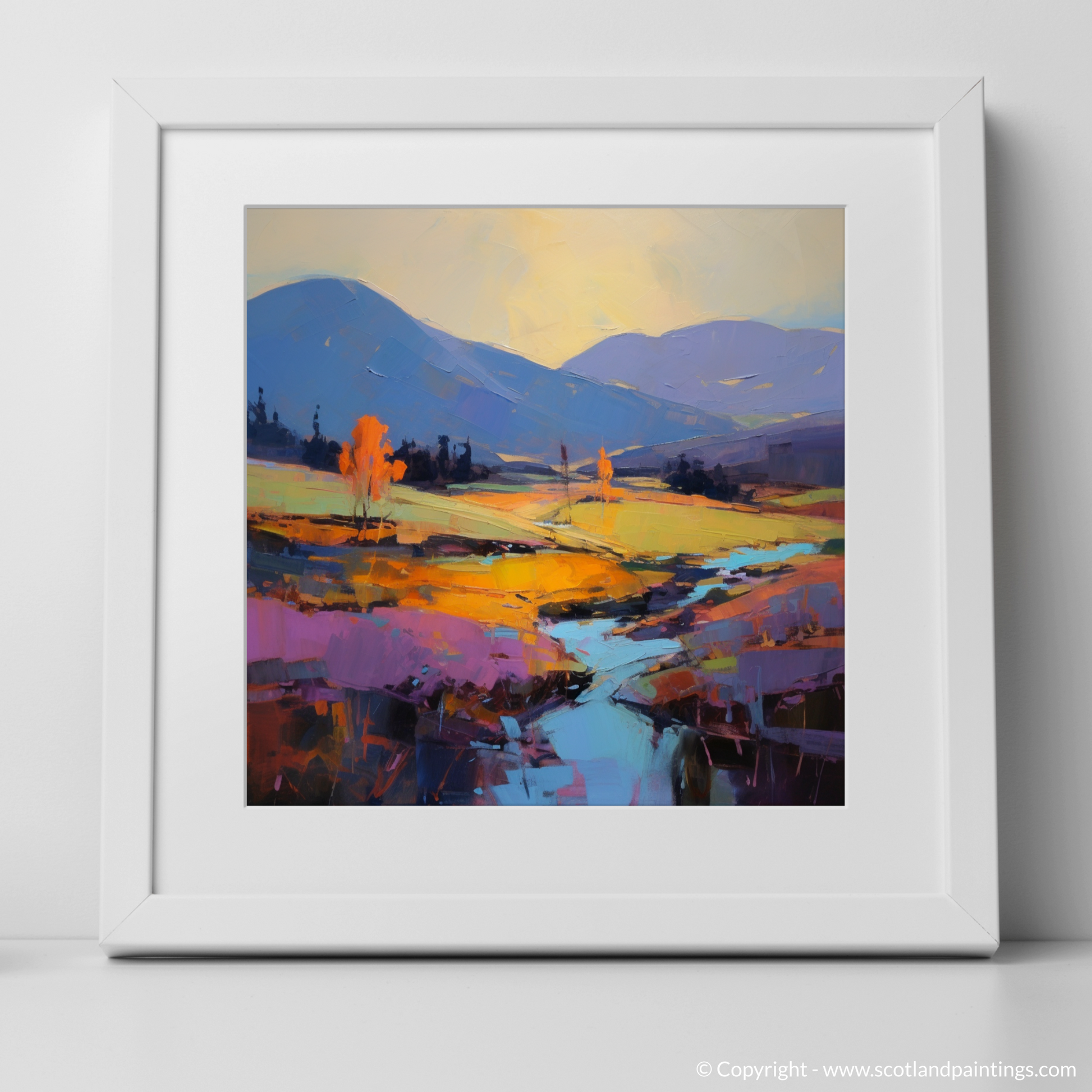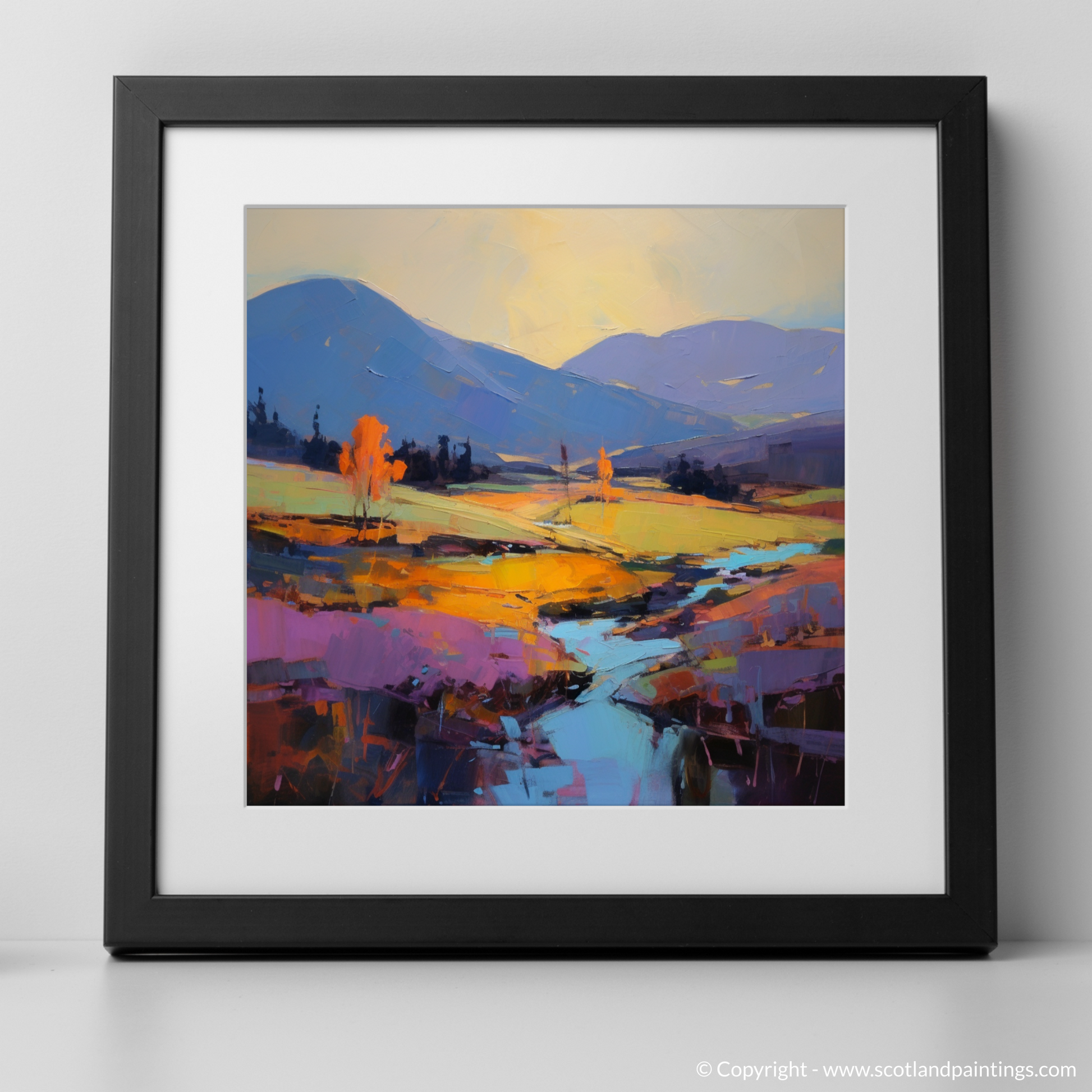 Contrasting the sweeping serenity of the highland terrain, bright oranges and yellows ignite the canvas, their intensity reminiscent of the last fiery rays of sunlight touching upon clusters of bog myrtle scattered across the fields. A ribbon of tranquil blue, the winding waterway cuts through the verdant valleys, reflecting the dynamic sky above and grounding the composition with a sense of fluidity.