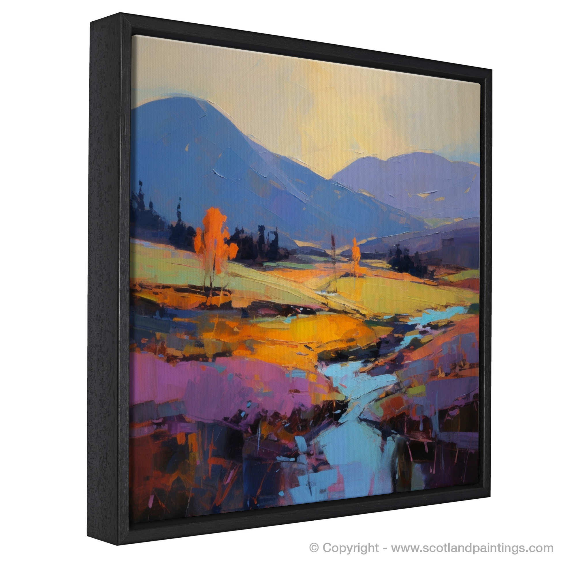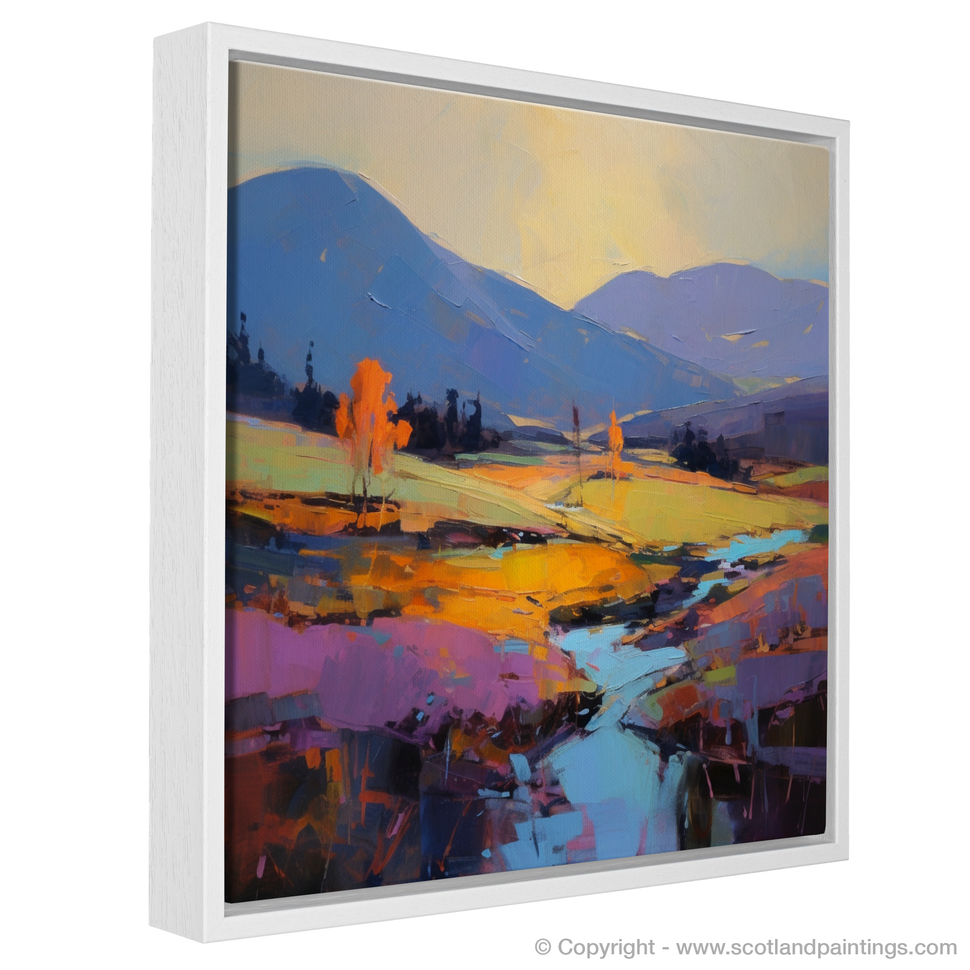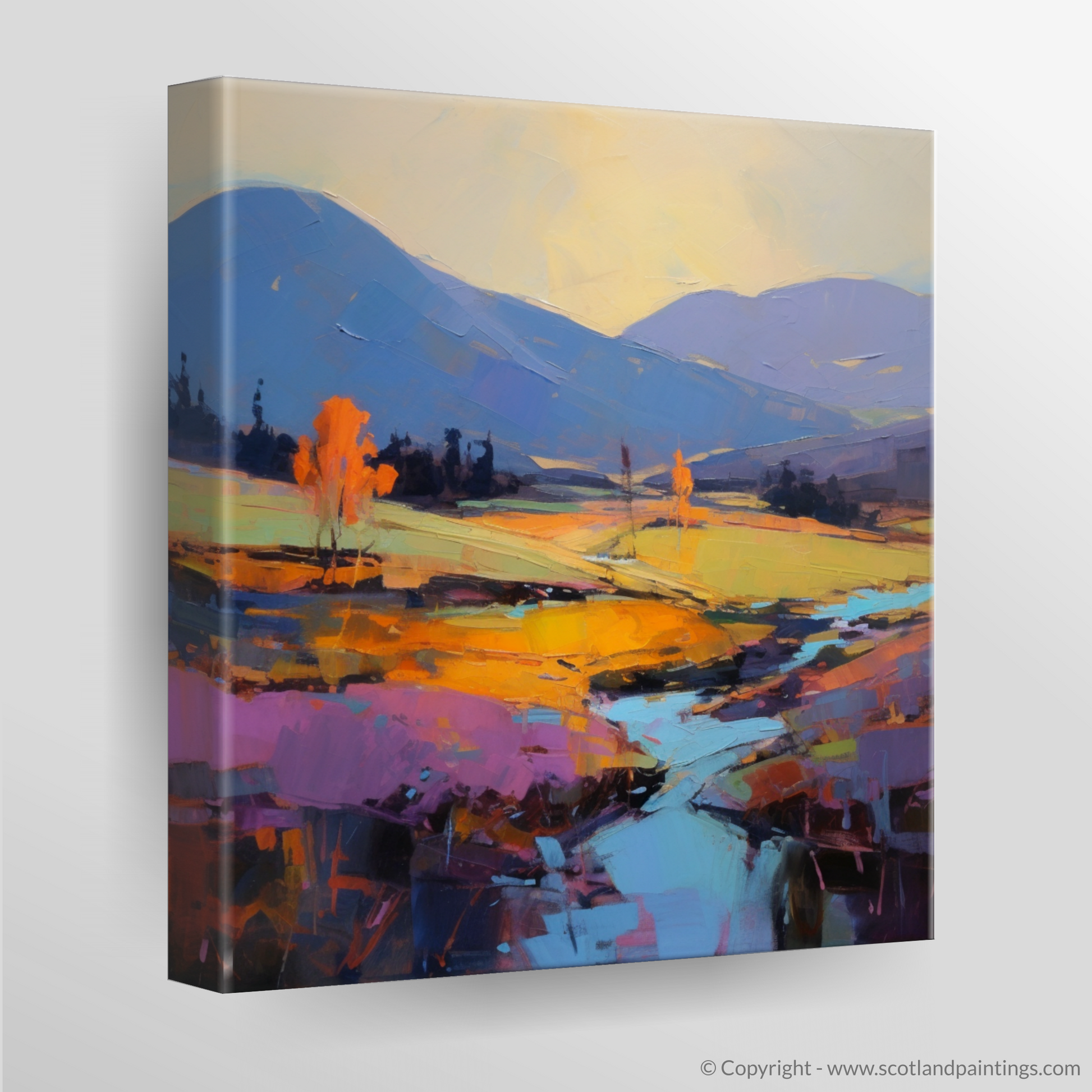 Contrasting the sweeping serenity of the highland terrain, bright oranges and yellows ignite the canvas, their intensity reminiscent of the last fiery rays of sunlight touching upon clusters of bog myrtle scattered across the fields. A ribbon of tranquil blue, the winding waterway cuts through the verdant valleys, reflecting the dynamic sky above and grounding the composition with a sense of fluidity.