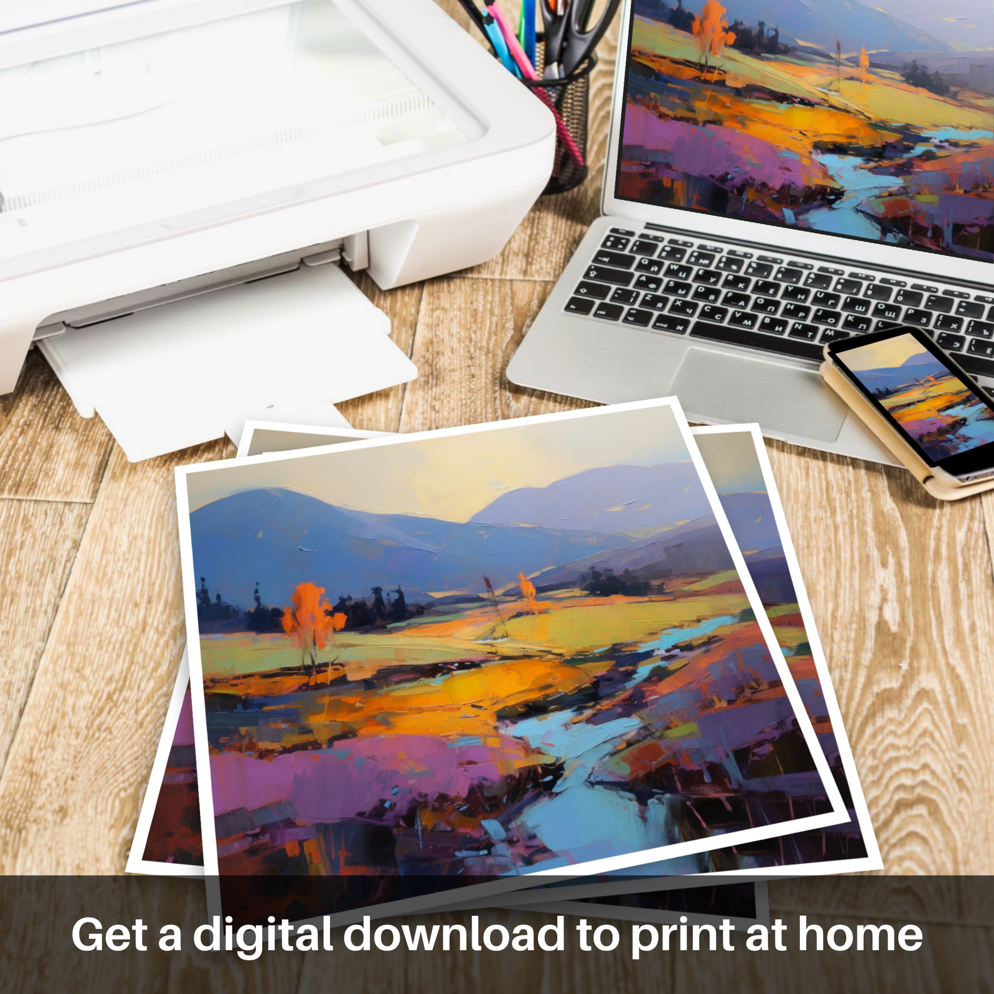 Immerse yourself in the vibrancy of the Scottish Highlands with this evocative print, capturing the essence of Glencoe bathed in the amber glow of the golden hour. Bold brushstrokes and an array of vivid hues weave together to form a patchwork of colour reflecting the untamed beauty of the landscape. Deep purples and blues meld into the undulating silhouette of mist-shrouded mountains, presenting a backdrop that is both dramatic and soothing.