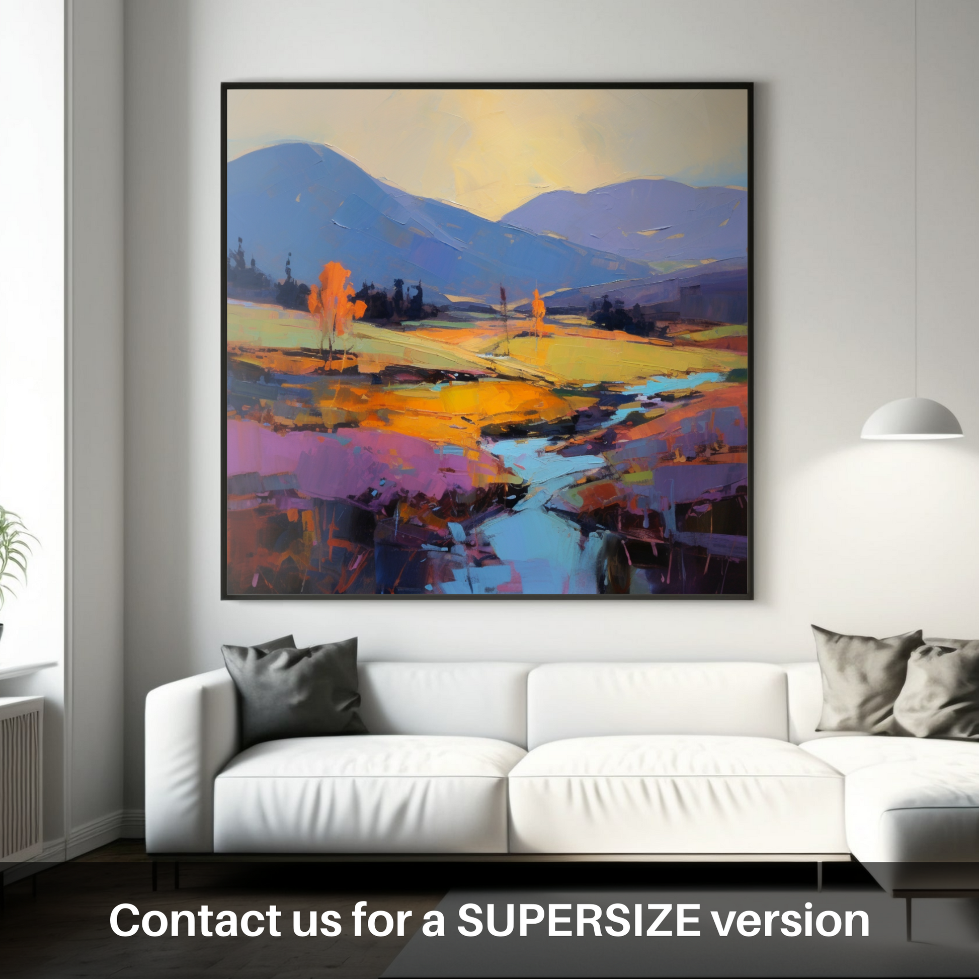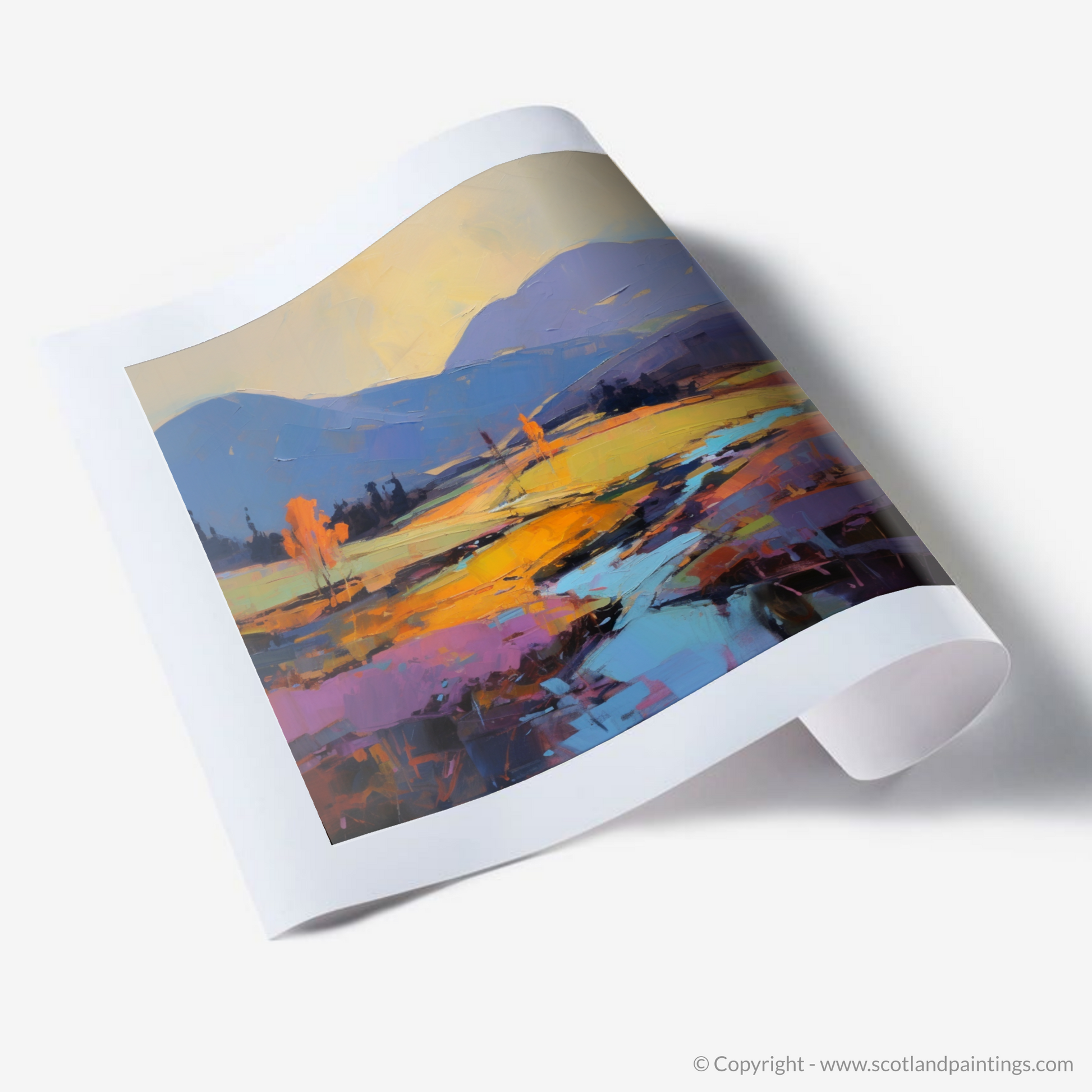 The print, a testament to the expressive power of colour, invites the onlooker to experience a moment of natural splendour frozen in time. Every element, from the lithe tree silhouettes standing tall against the sky's canvas, to the textured daubs that suggest heather-clad hills, is rendered to transport you to this moment of serene grandeur.