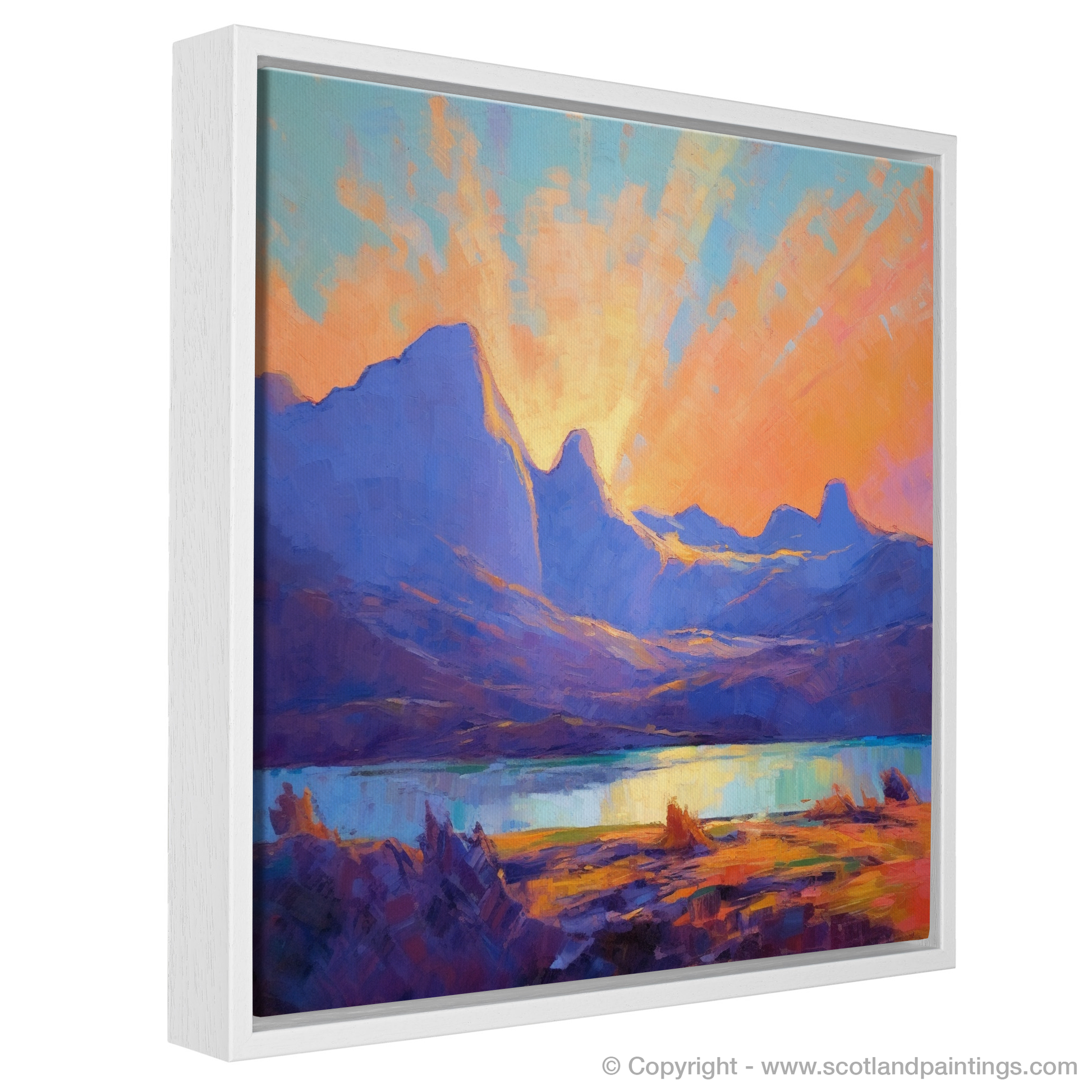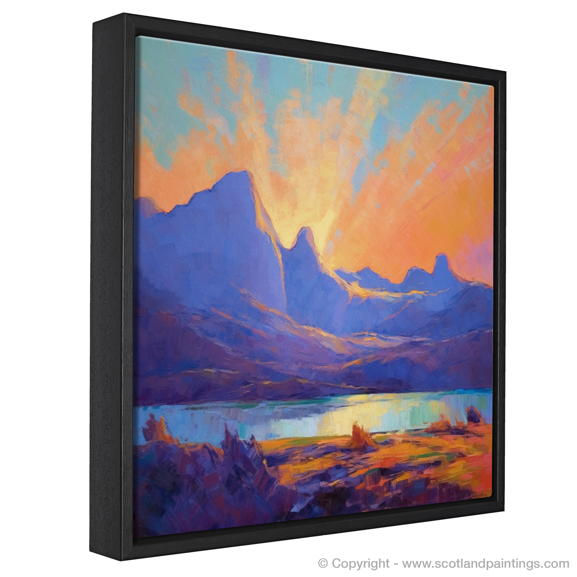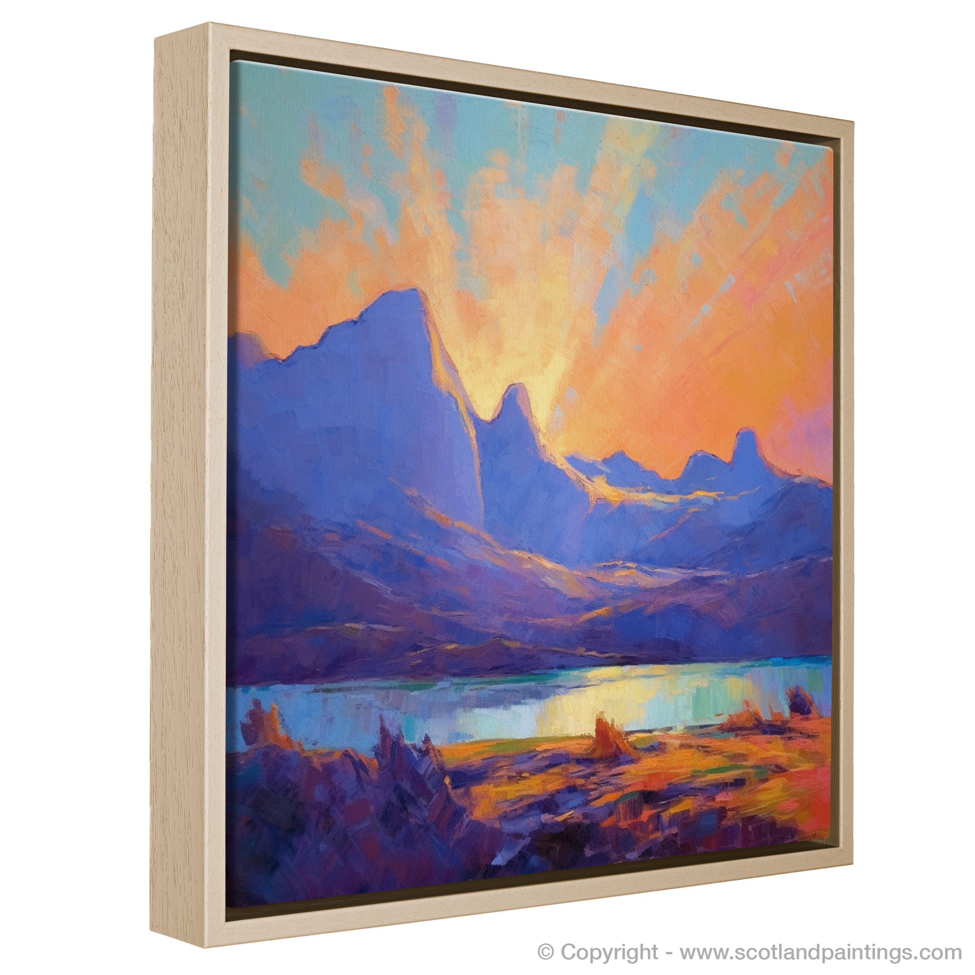 Immerse yourself in the vivid hues and dreamlike tranquillity of Glencoe, captured in this evocative impressionist-inspired print. The artwork masterfully interprets the majestic silhouetted peaks of one of Scotland's most dramatic landscapes, enveloping onlookers in an atmosphere of captivating natural beauty.