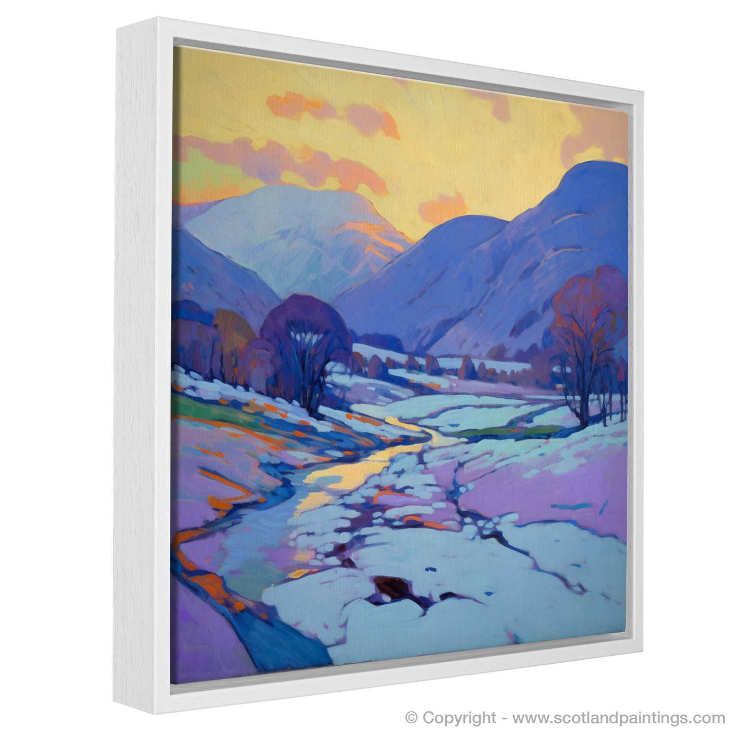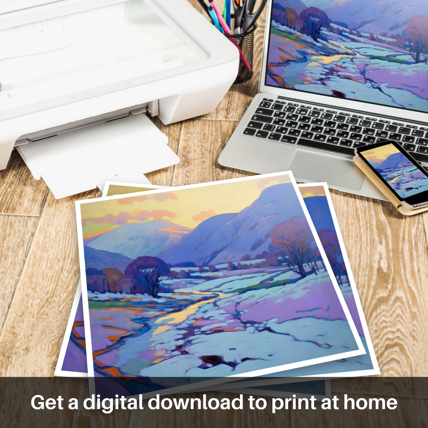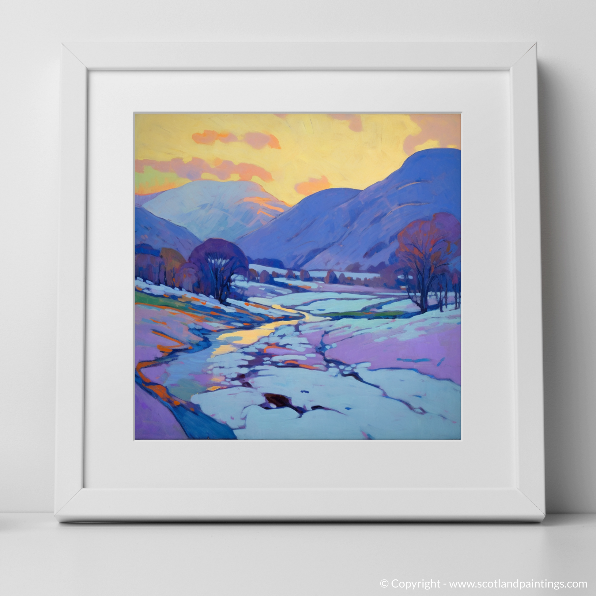 As the twilight embraces Glencoe, the landscape is transformed into an enchanting blend of cool and warm tones in our latest offering. This exquisite print captures the essence of a snow-covered glen at dusk, where the dance between sunset and shadow creates a symphony of colours. Rolling hills drape in the softest purples and blues, embodying the chill of the Scottish winter, while the evening sky casts a spell of muted yellows and pinks above, bringing an ethereal glow to the serene setting.