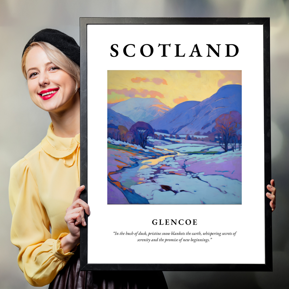 Prominently displayed at the top, “SCOTLAND” is emblazoned in big, bold letters, immediately evoking the storied allure of this breathtaking land. Below, the heart of the piece unfolds with a mesmerising Impressionist painting depicting Glencoe. The scene captures the valley as dusk settles, a moment where pristine snow gently carpets the landscape. The pastel hues dance across the canvas, with soft pinks and purples blending into the blue-hued mountains, evoking a serene hush and the air of fresh beginnings.