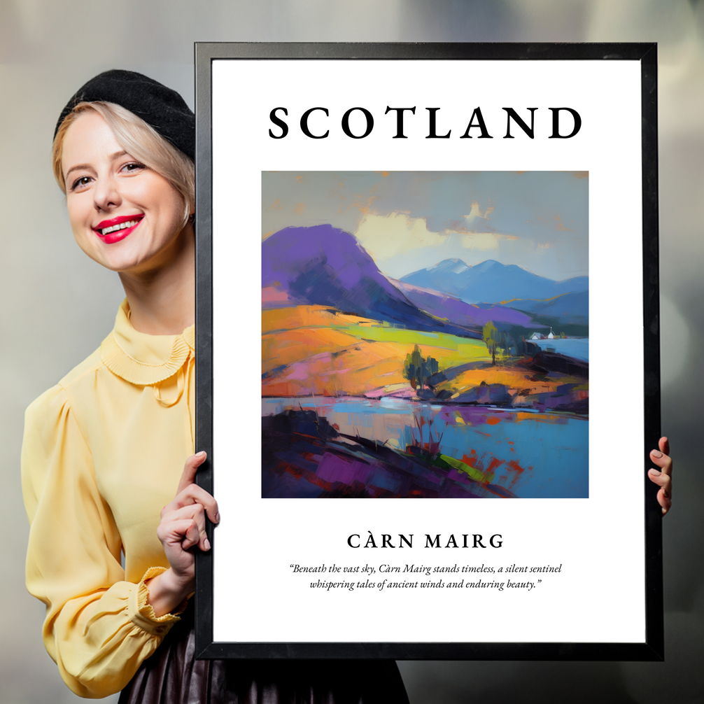 The word "SCOTLAND" boldly anchors the top of the poster, immediately capturing attention and evoking a sense of national pride. Below, a mesmerising painting of Càrn Mairg unfurls in a symphony of expressive brushstrokes and vivid hues, painting a picture not only of the landscape but of the emotions it stirs within those who behold it. Beneath the artwork, a poignant quote reads: “Beneath the vast sky, Càrn Mairg stands timeless, a silent sentinel whispering tales of ancient winds and enduring beauty.”