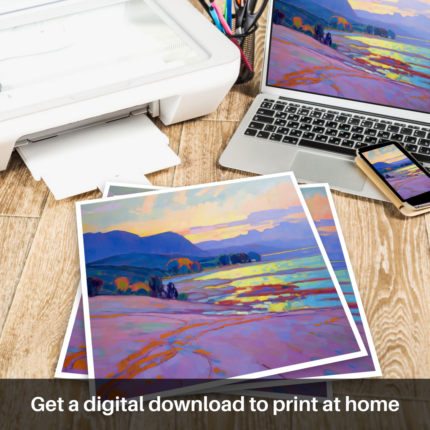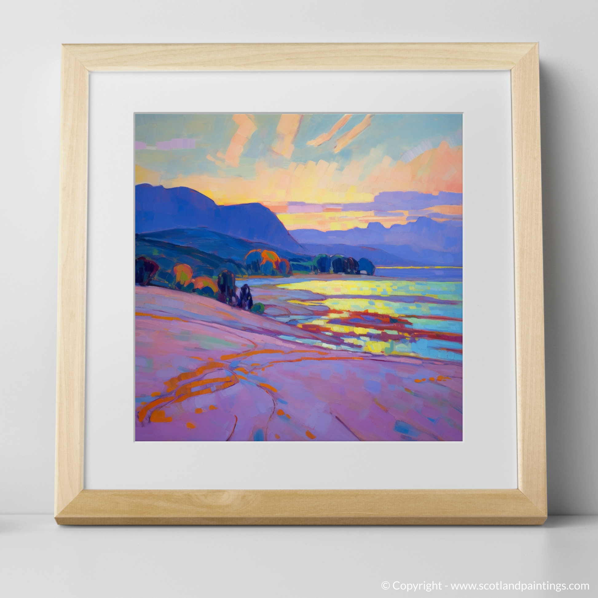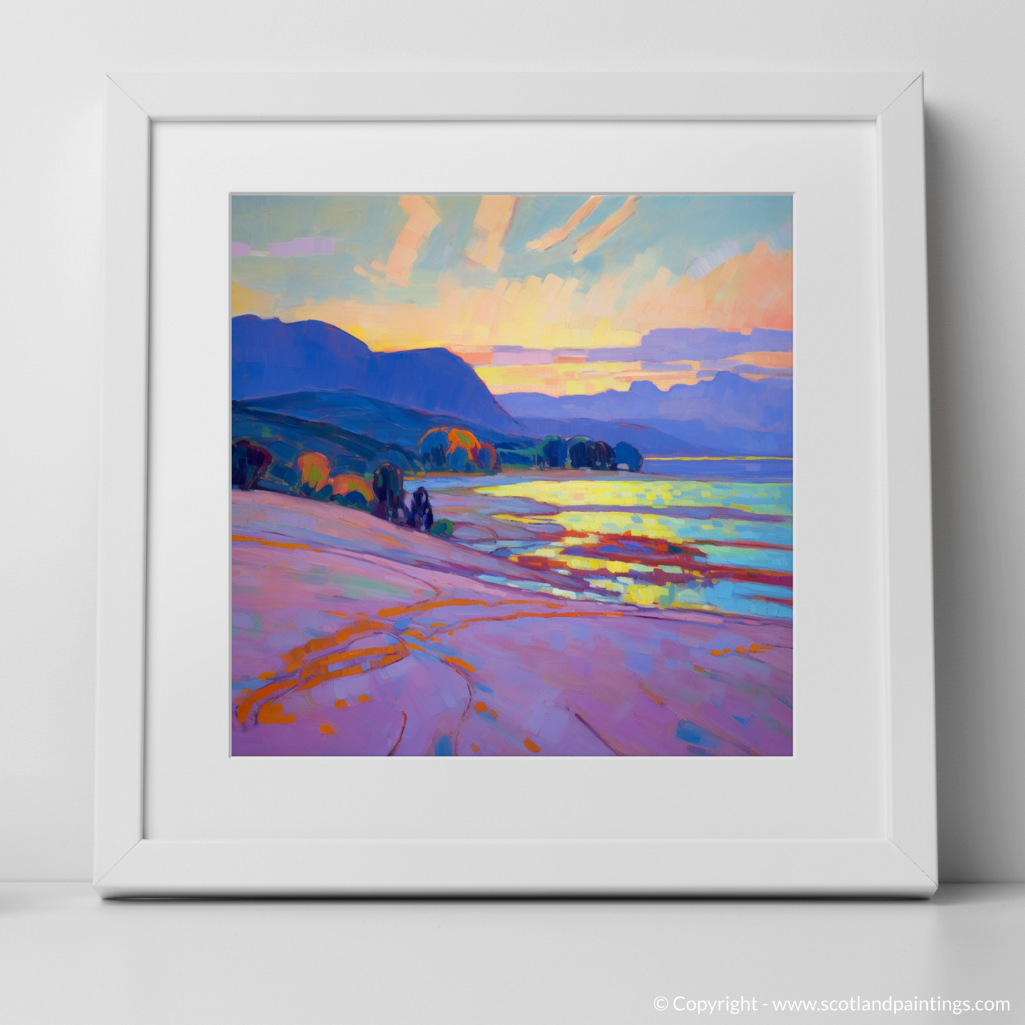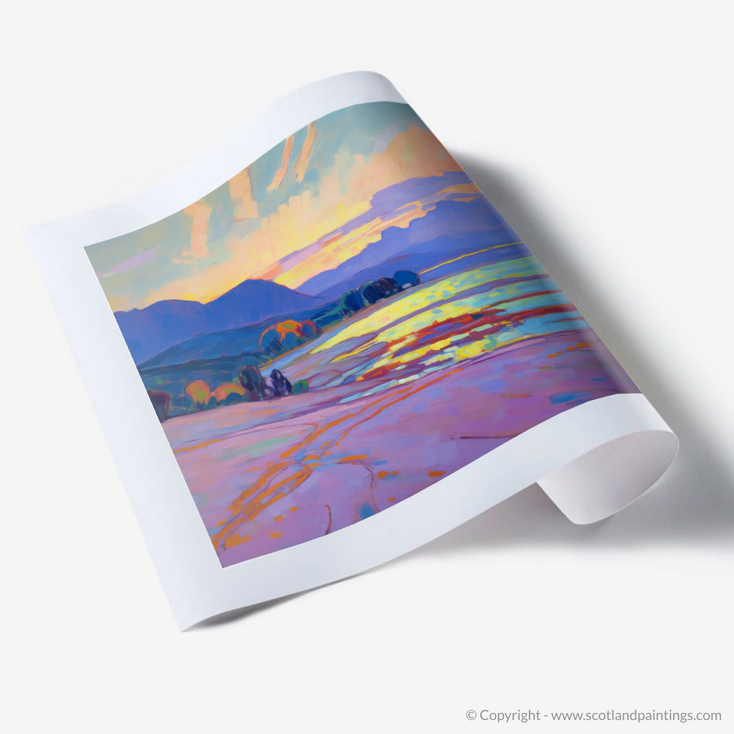 Bathed in the ethereal glow of dusk, the Scottish Cove depicted in this captivating print comes to life in a symphony of colour and light. The sand, almost iridescent under the waning light, stretches towards the horizon, inviting viewers to take a stroll along its tranquil breadth. The beach's unspoiled beauty is rendered in a palette of purples, pinks, and warm oranges, mirroring the last moments of daylight as they dance across the sky in a masterful display.