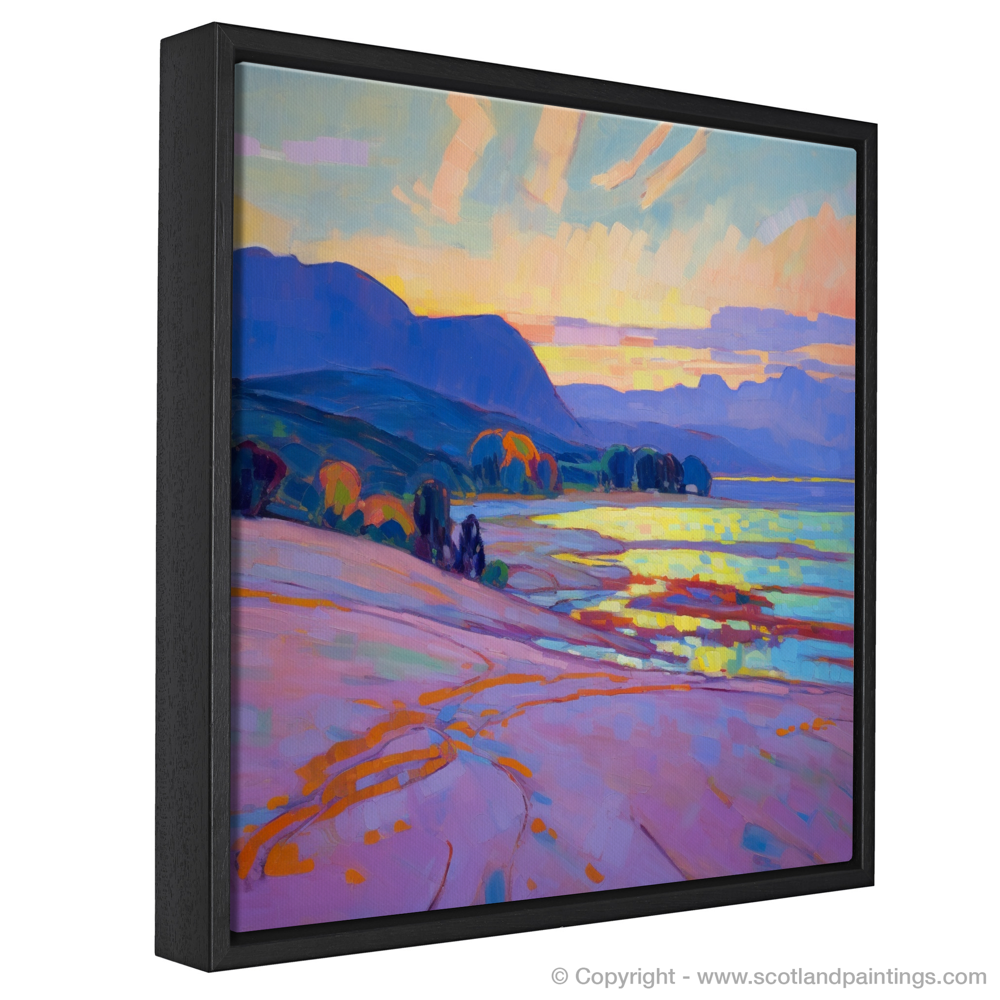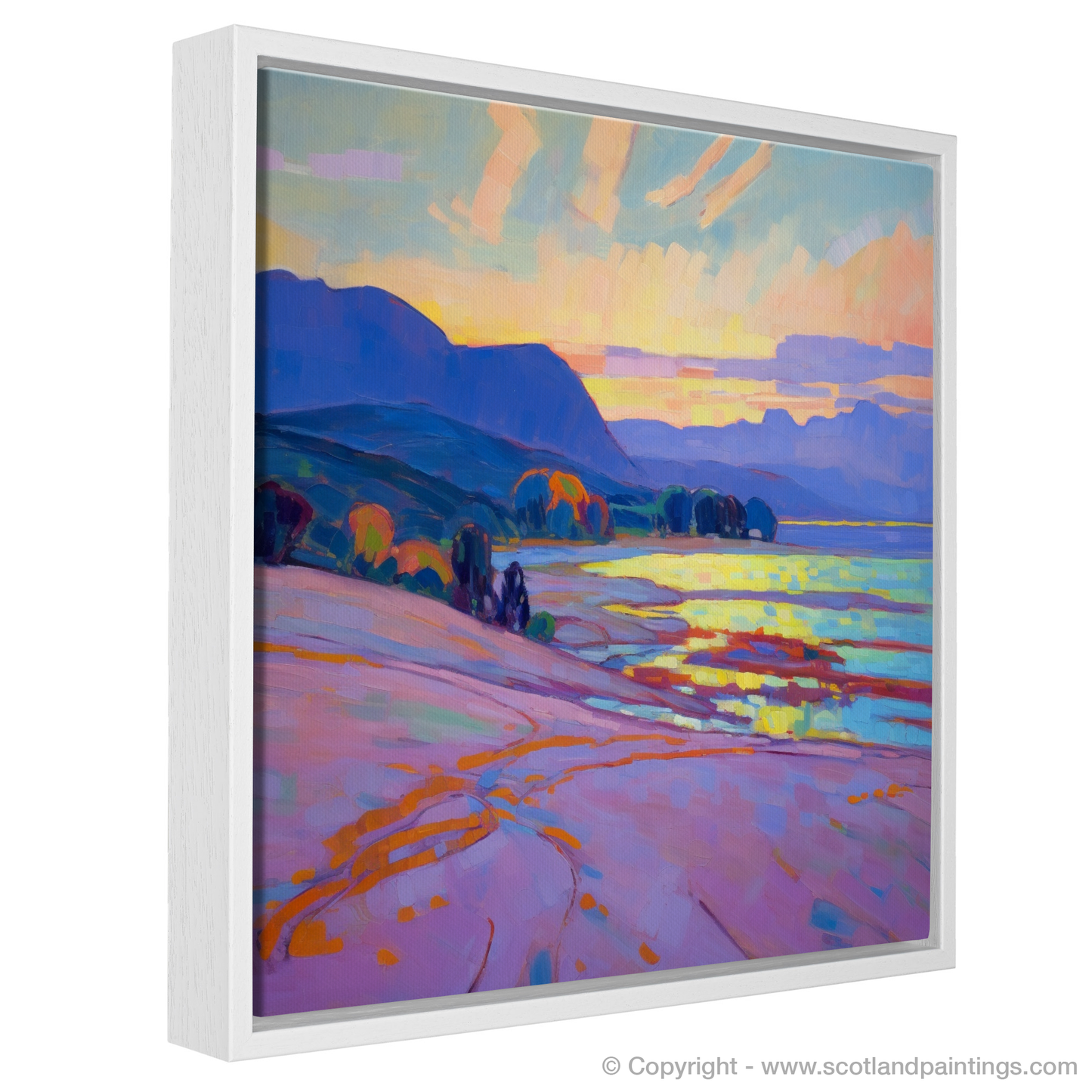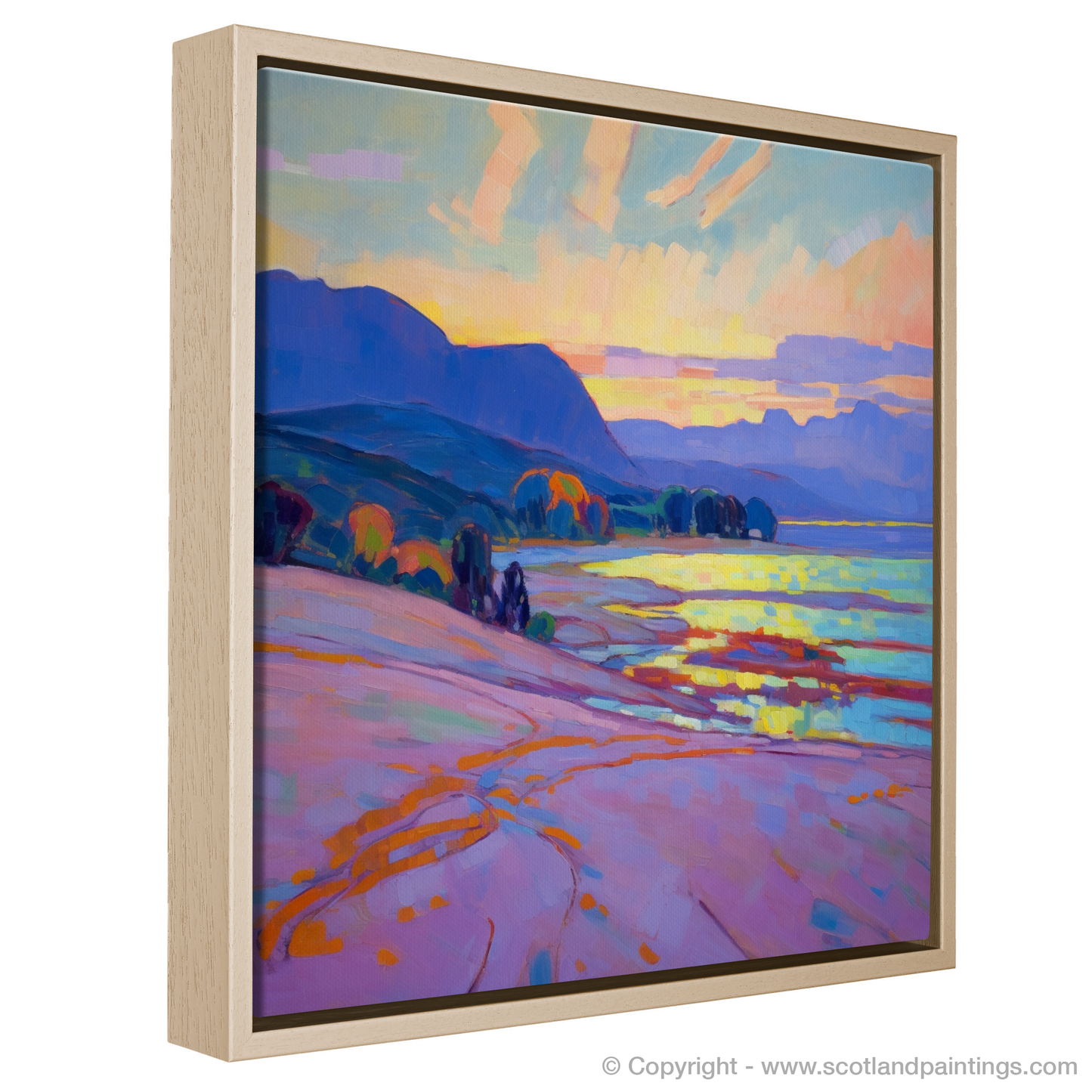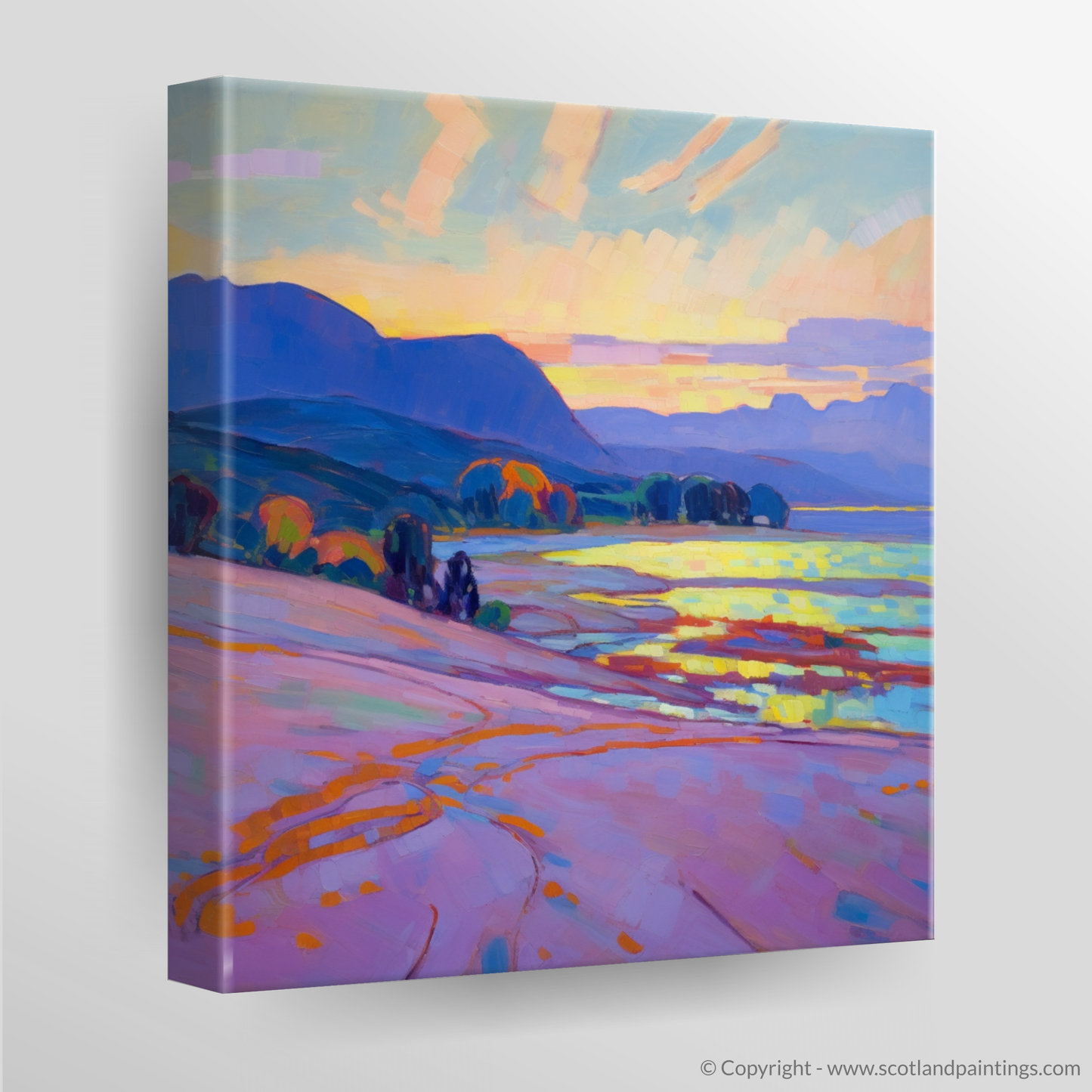 Bathed in the ethereal glow of dusk, the Scottish Cove depicted in this captivating print comes to life in a symphony of colour and light. The sand, almost iridescent under the waning light, stretches towards the horizon, inviting viewers to take a stroll along its tranquil breadth. The beach's unspoiled beauty is rendered in a palette of purples, pinks, and warm oranges, mirroring the last moments of daylight as they dance across the sky in a masterful display.