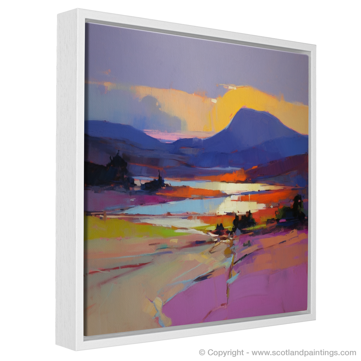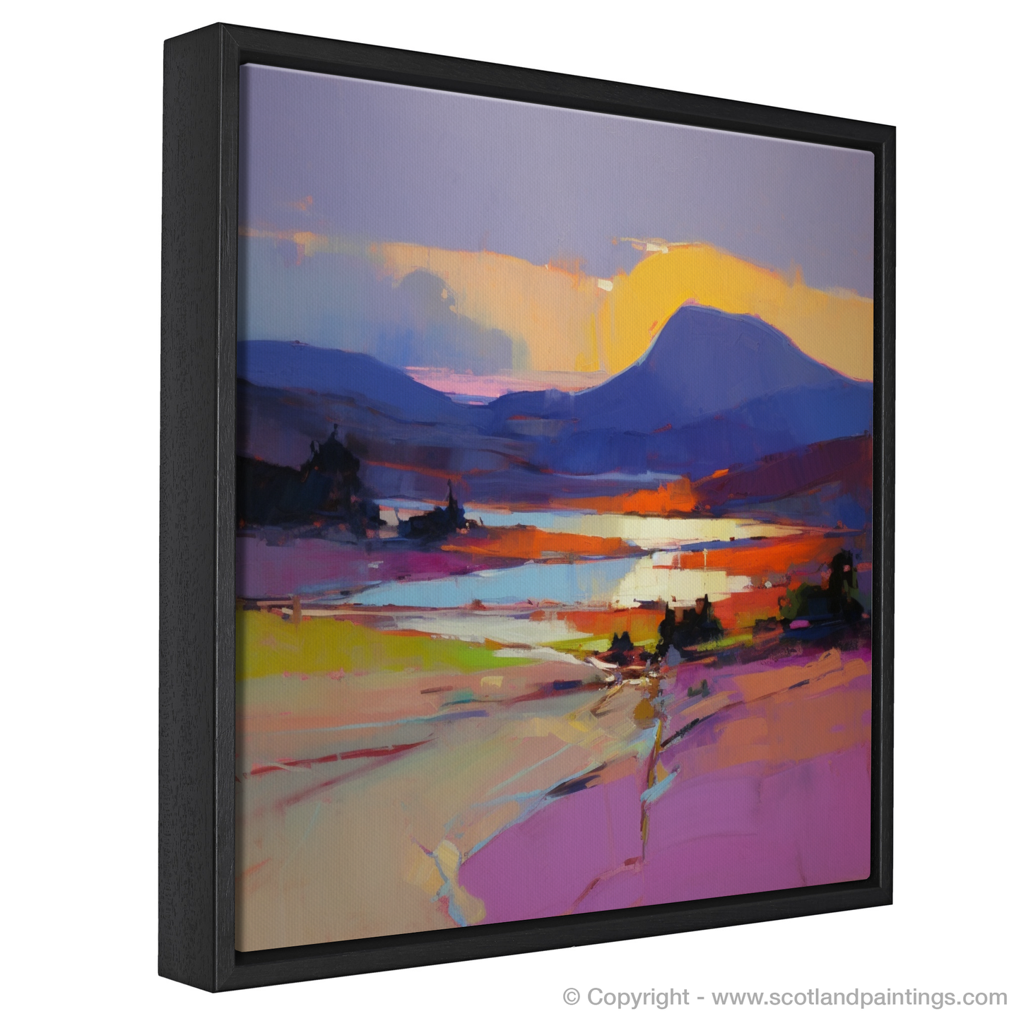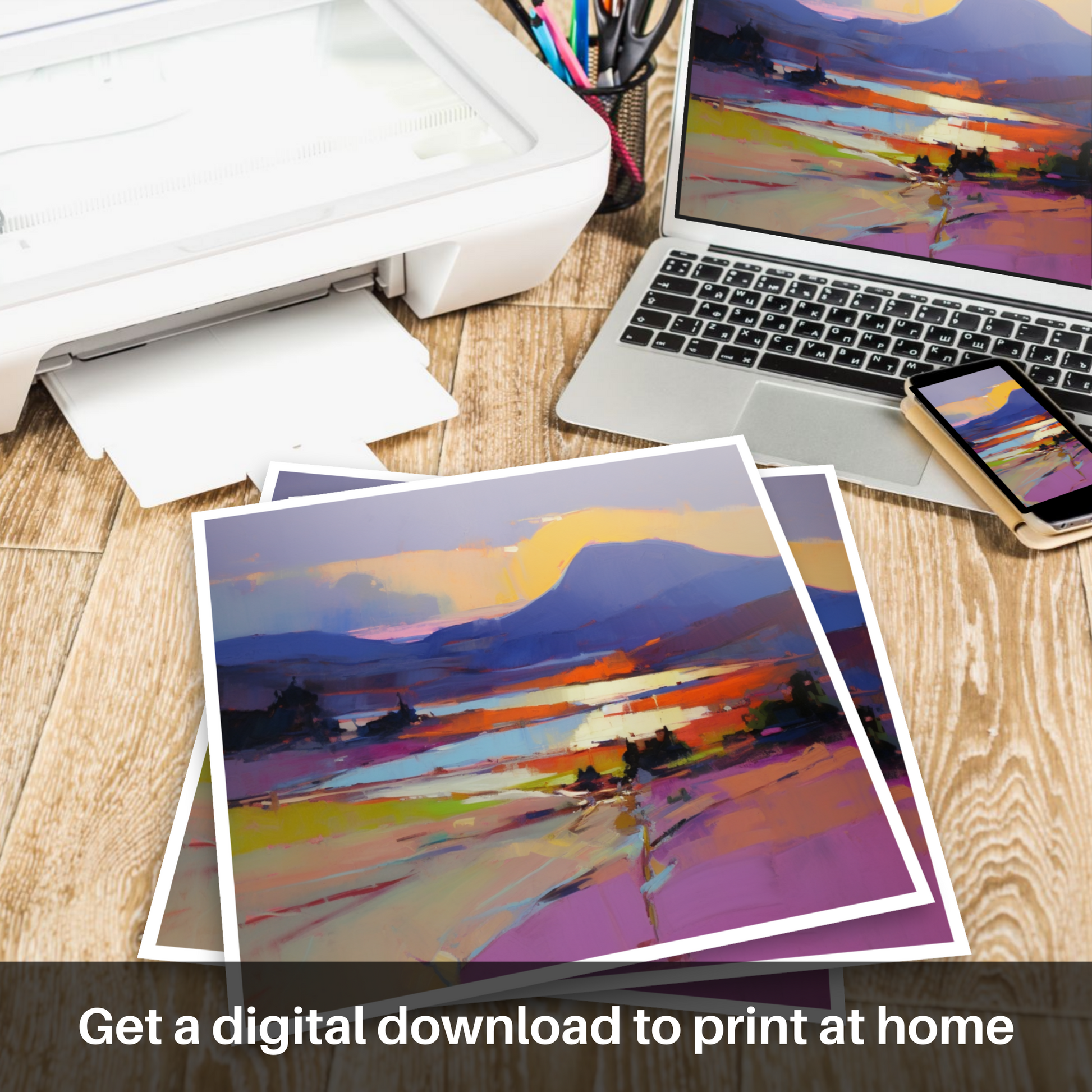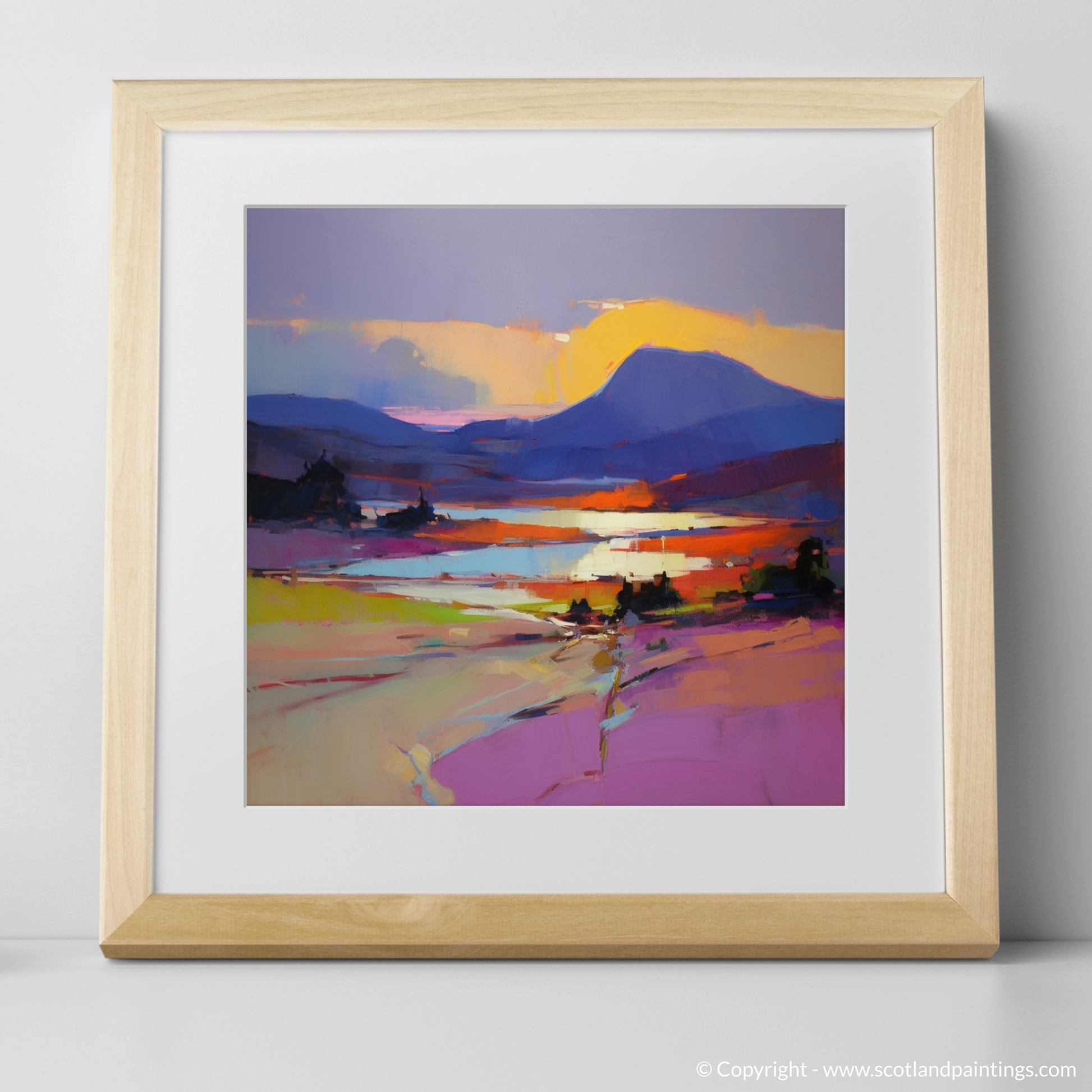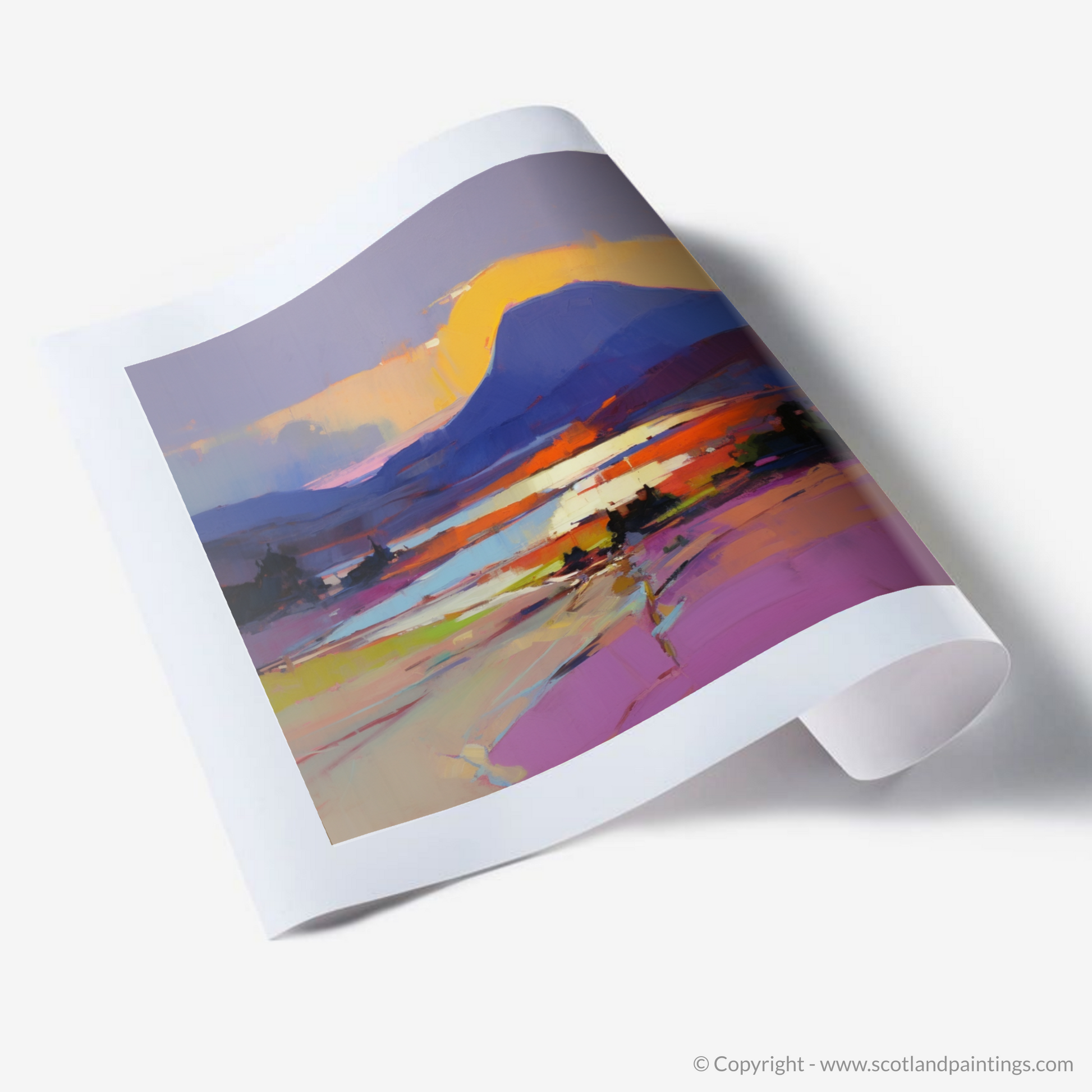 Awash with the fiery palette of a golden hour, this evocative print captures the essence of Kiloran Bay with a fervency that can only be conveyed through swathes of vibrant colour and bold brushwork characteristic of Expressionism. Rolling hills gently descend into the calm expanse of water, reflecting the mesmerising dance of twilight hues—where purples, pinks, and blues of the heathery landscape meet the warm oranges and yellows emanating from the setting sun.