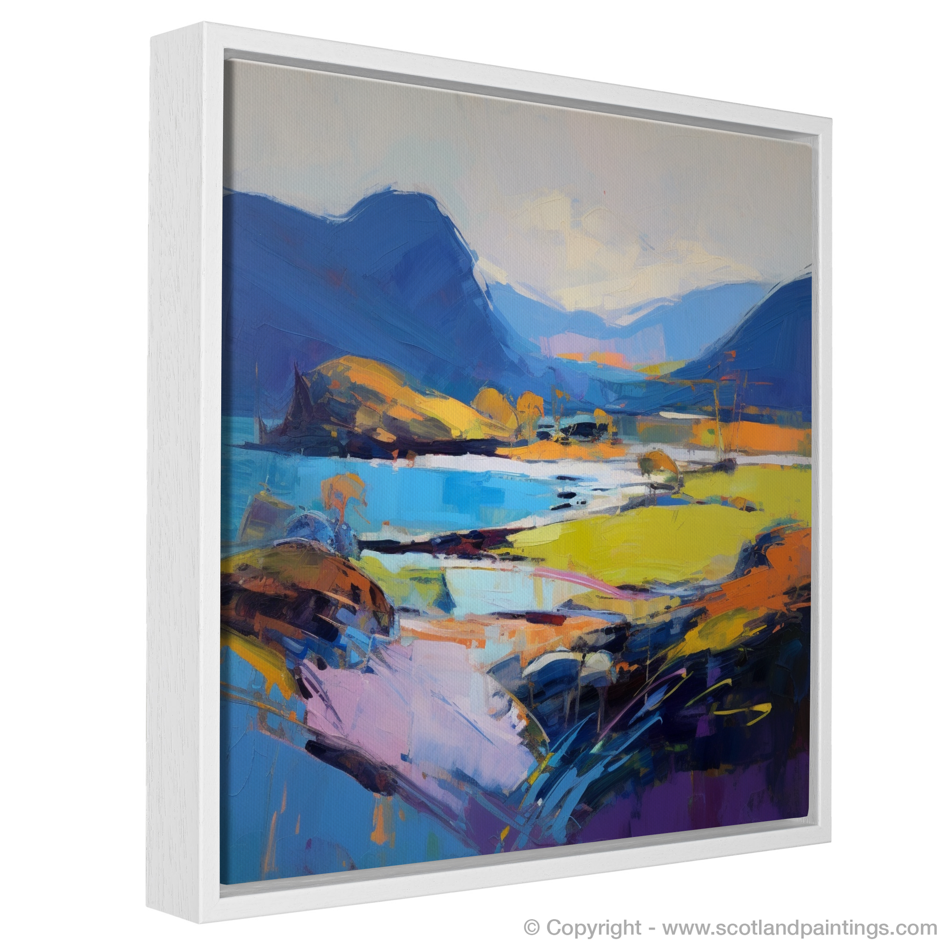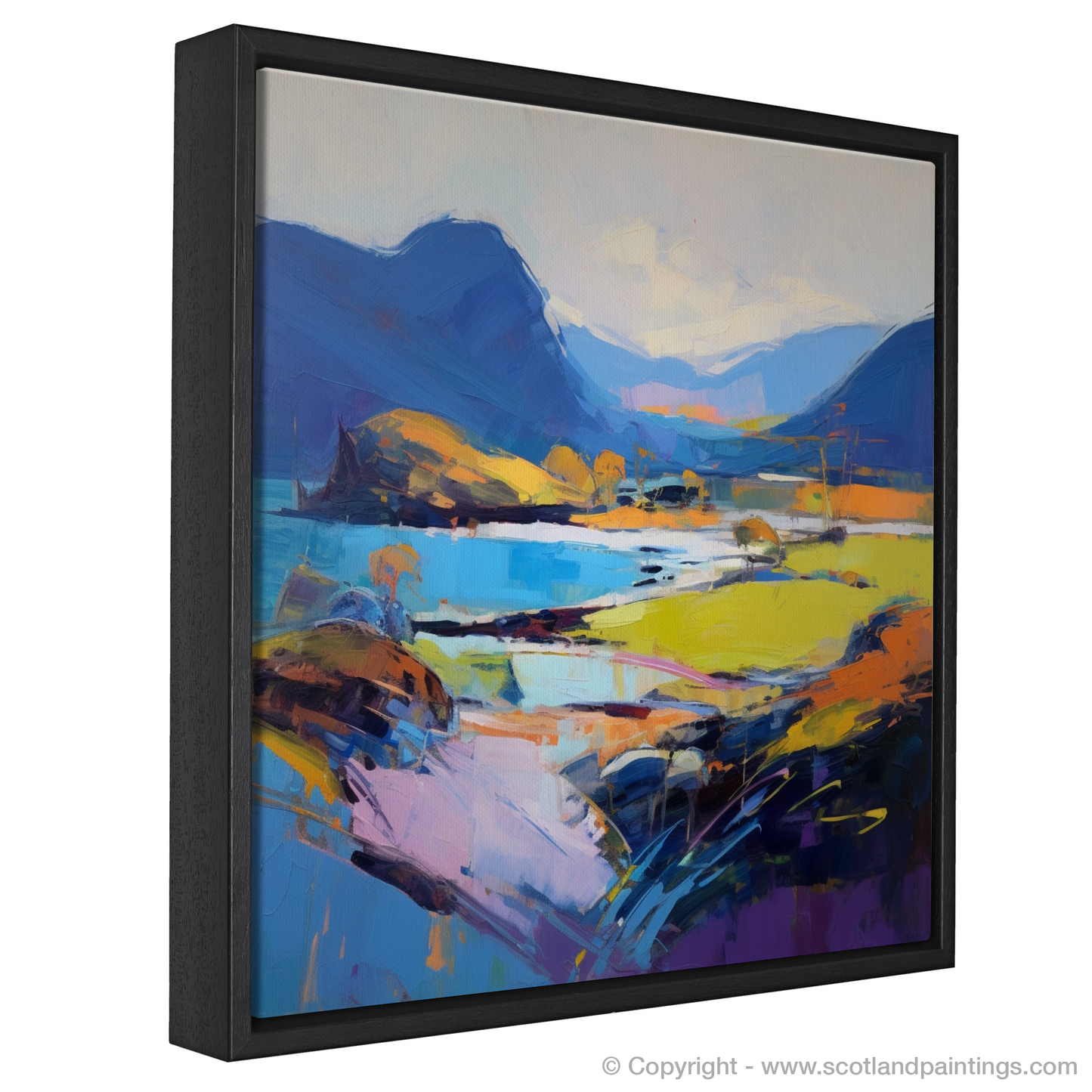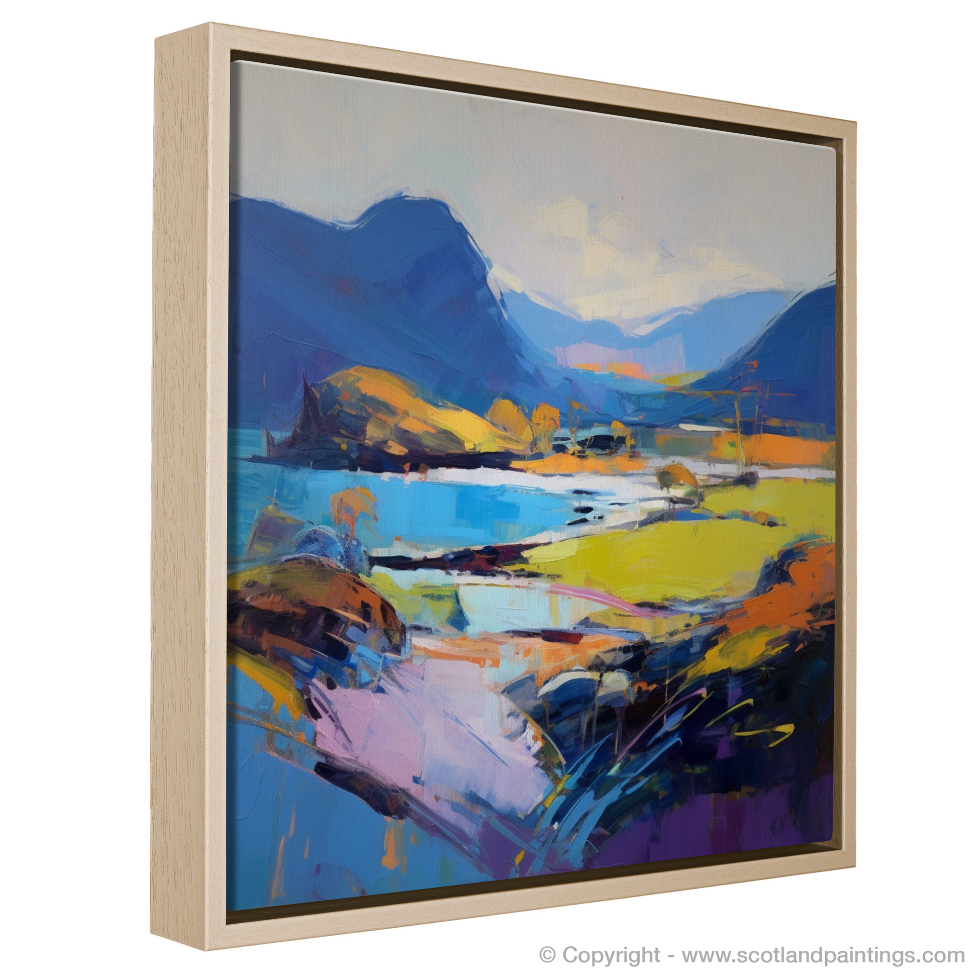 In this expressive rendition, the viewer is met with a symphony of colours that dance across the canvas, reflecting the untamed beauty of the Scottish shores. Hues of cerulean and sapphire blend with the waters, capturing the ever-changing dance of light upon the bay. The shores are rendered in warm ochres and cool purples, suggestive of the wild flora that hugs the coastline, and the fleeting shadows cast by a sun that plays hide and seek with the clouds.