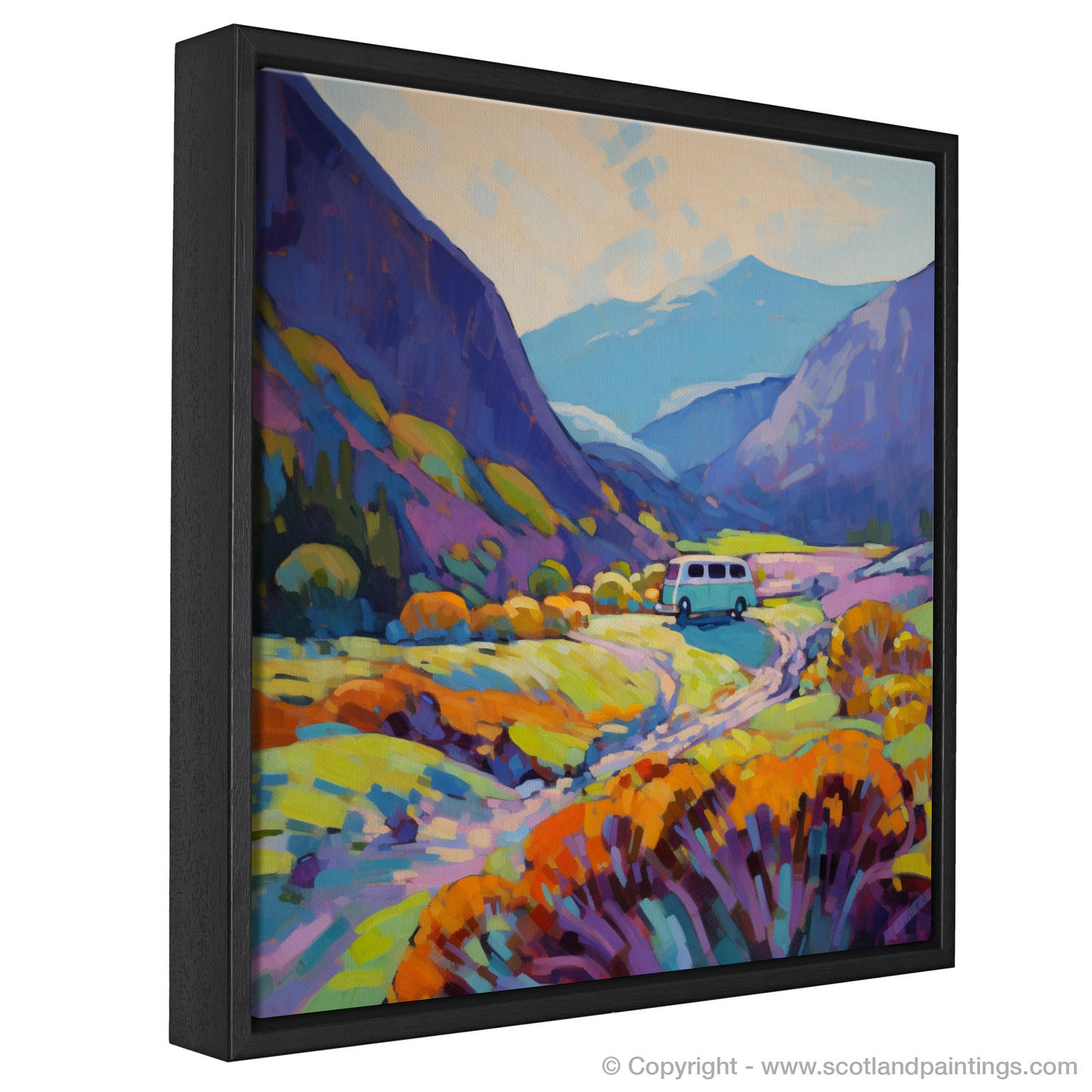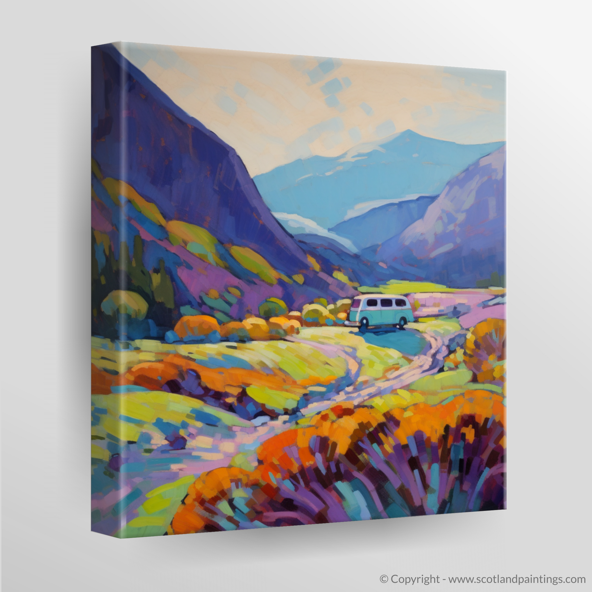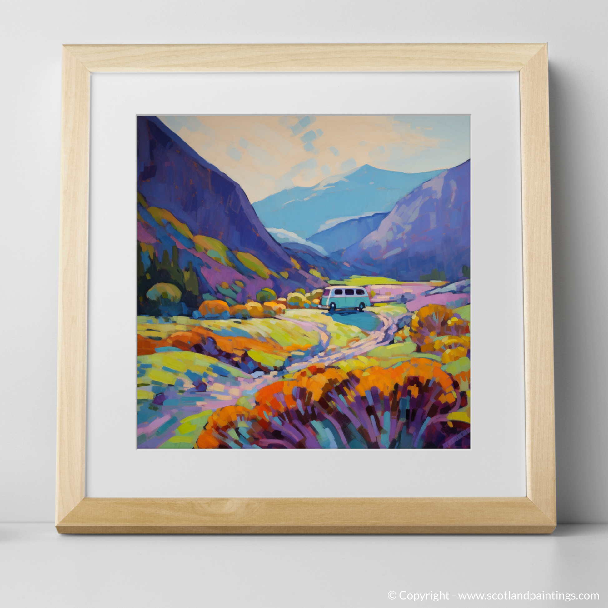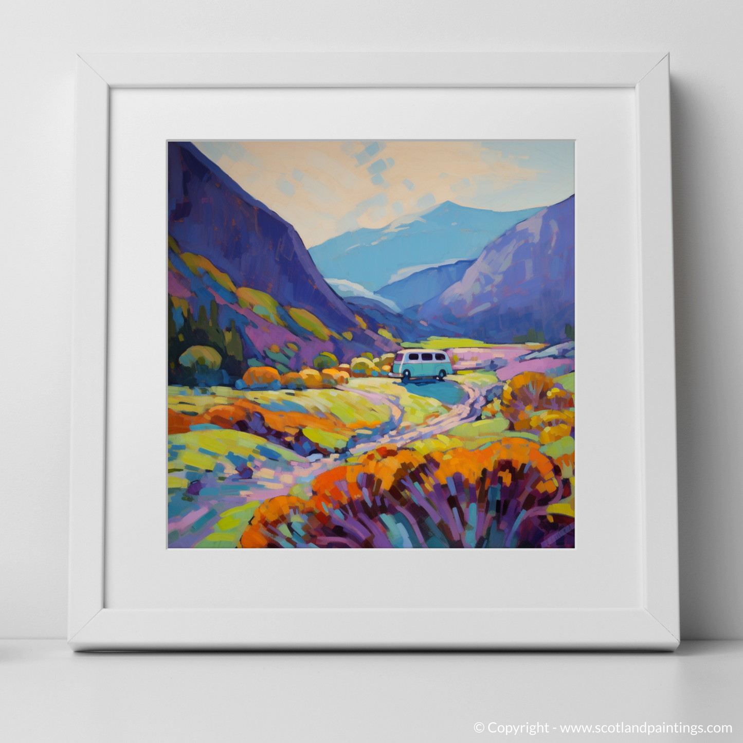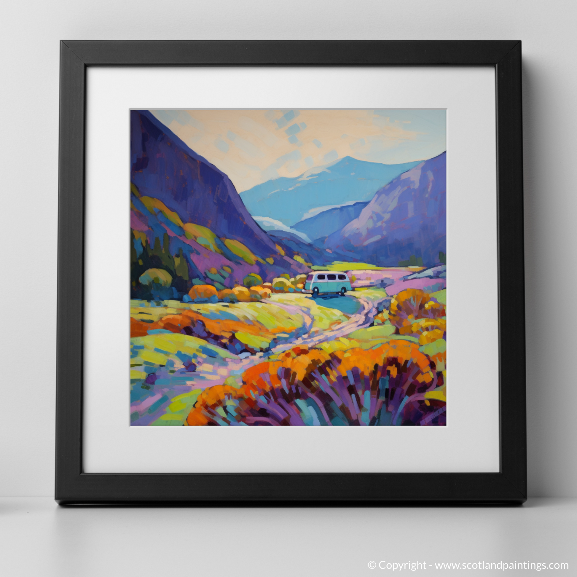 The van is positioned on a meandering path that unravels through the valley, suggesting a journey filled with discovery and serenity. Impressively towering mountains, with cascades of deep purples and blues, cradle the scene, reflecting the grandeur of the Scottish Highlands. Their majestic presence is softened by the Impressionist style, which harmonises raw beauty with a sense of ethereal wonder.