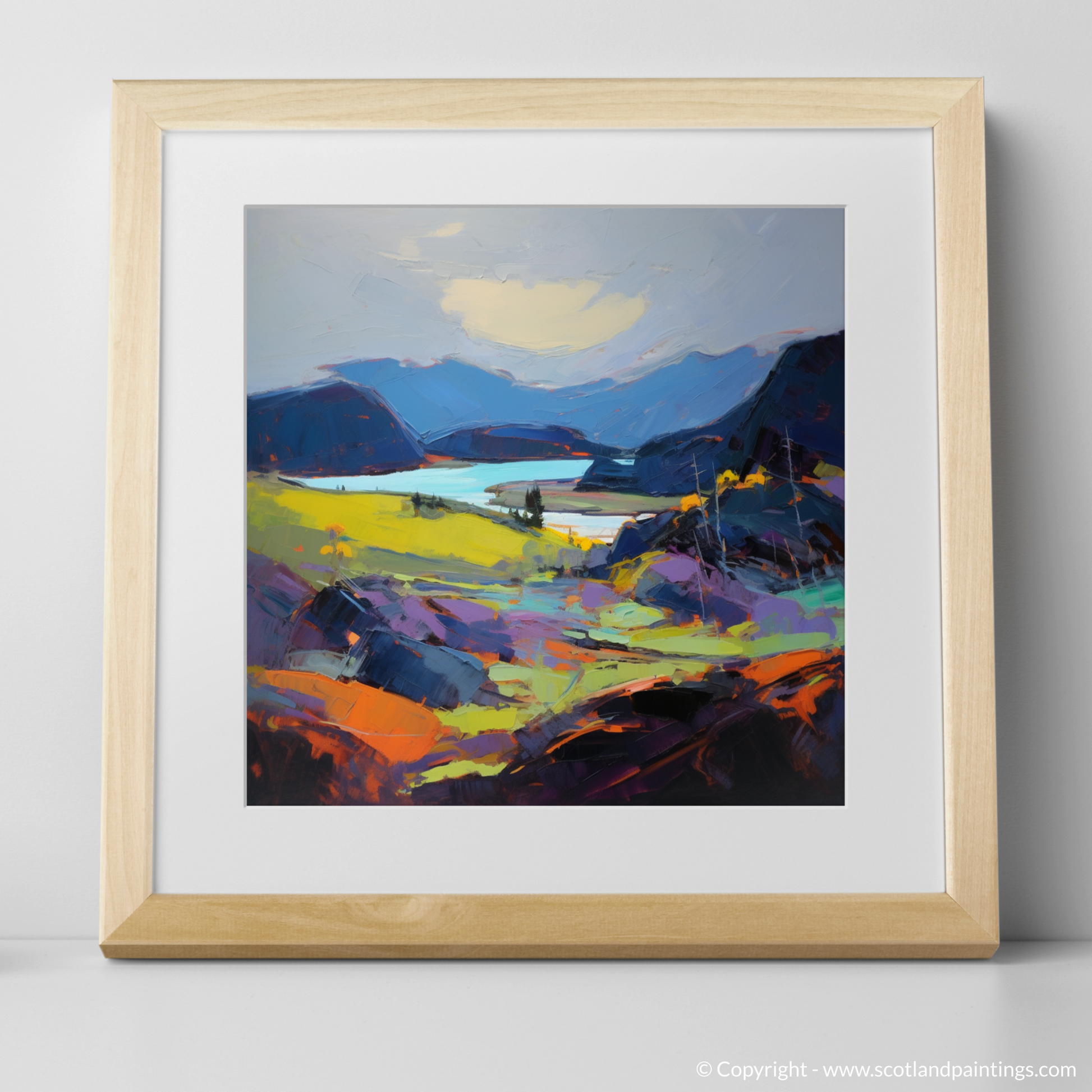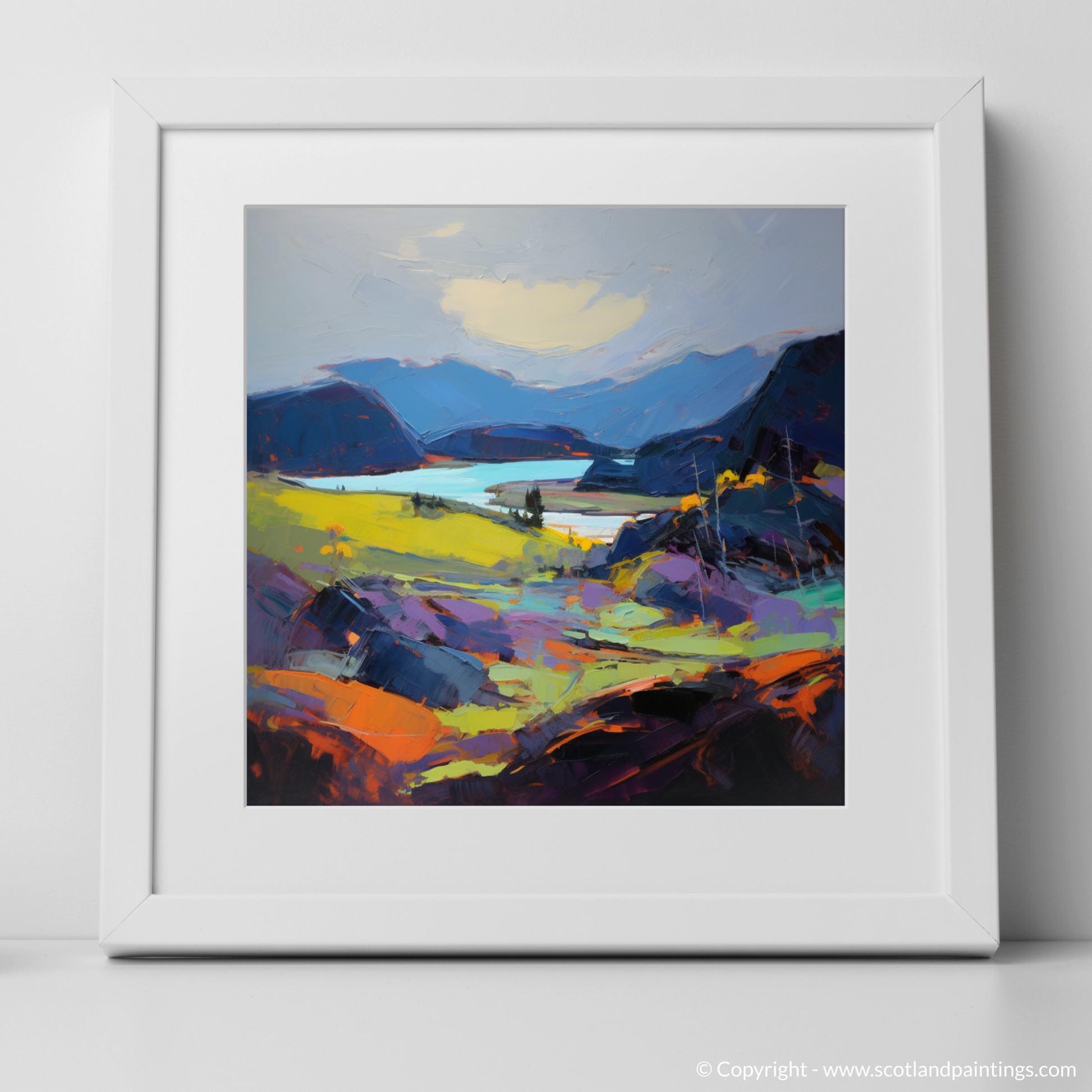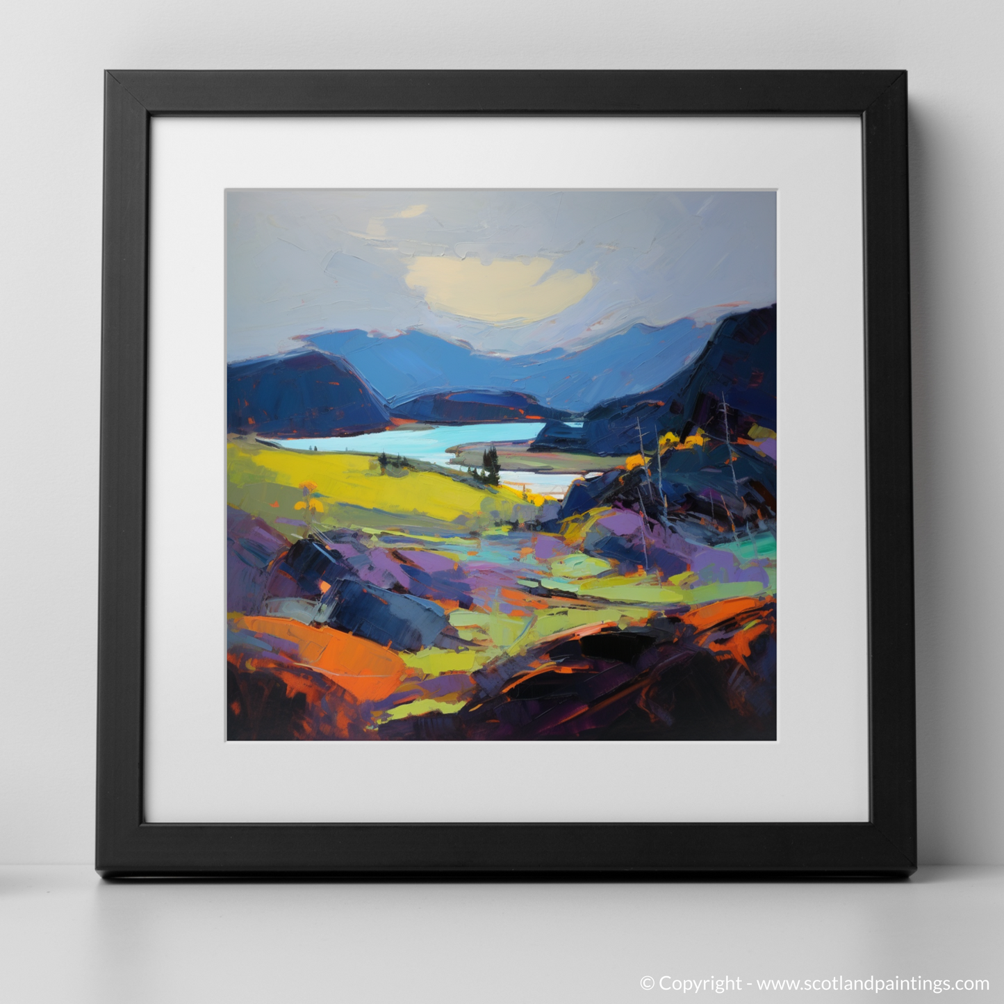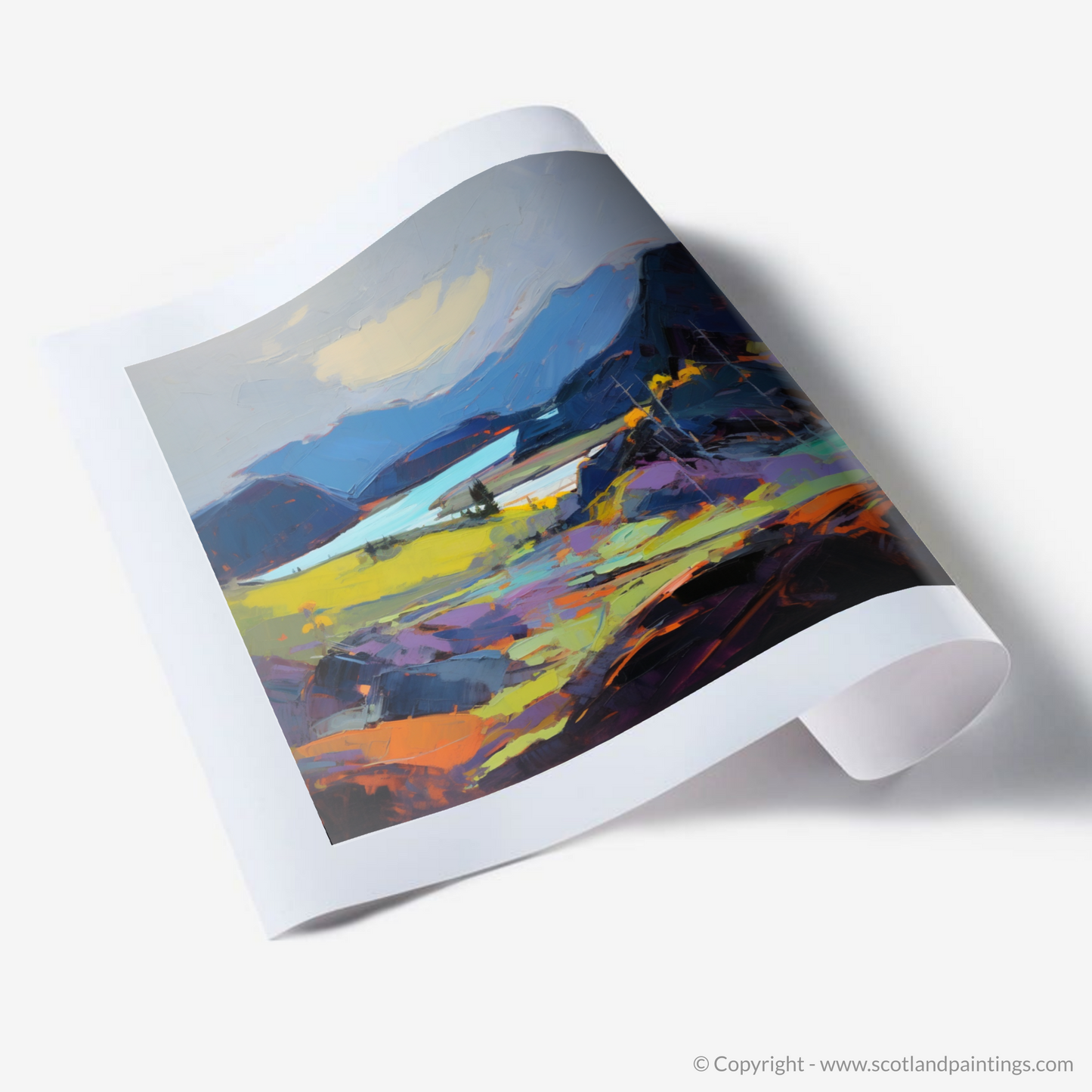 Swept by the moody hues of a storm-imbued sky, this evocative print captures the raw, untamed beauty of Scourie Bay. Bold strokes and striking contrasts define the essence of this Expressionist piece. The vibrant palette of intense oranges, purples, and yellows paints a lively foreground, clashing against the sombre blues and greys that dictate the brooding heavens above and tranquil waters below.