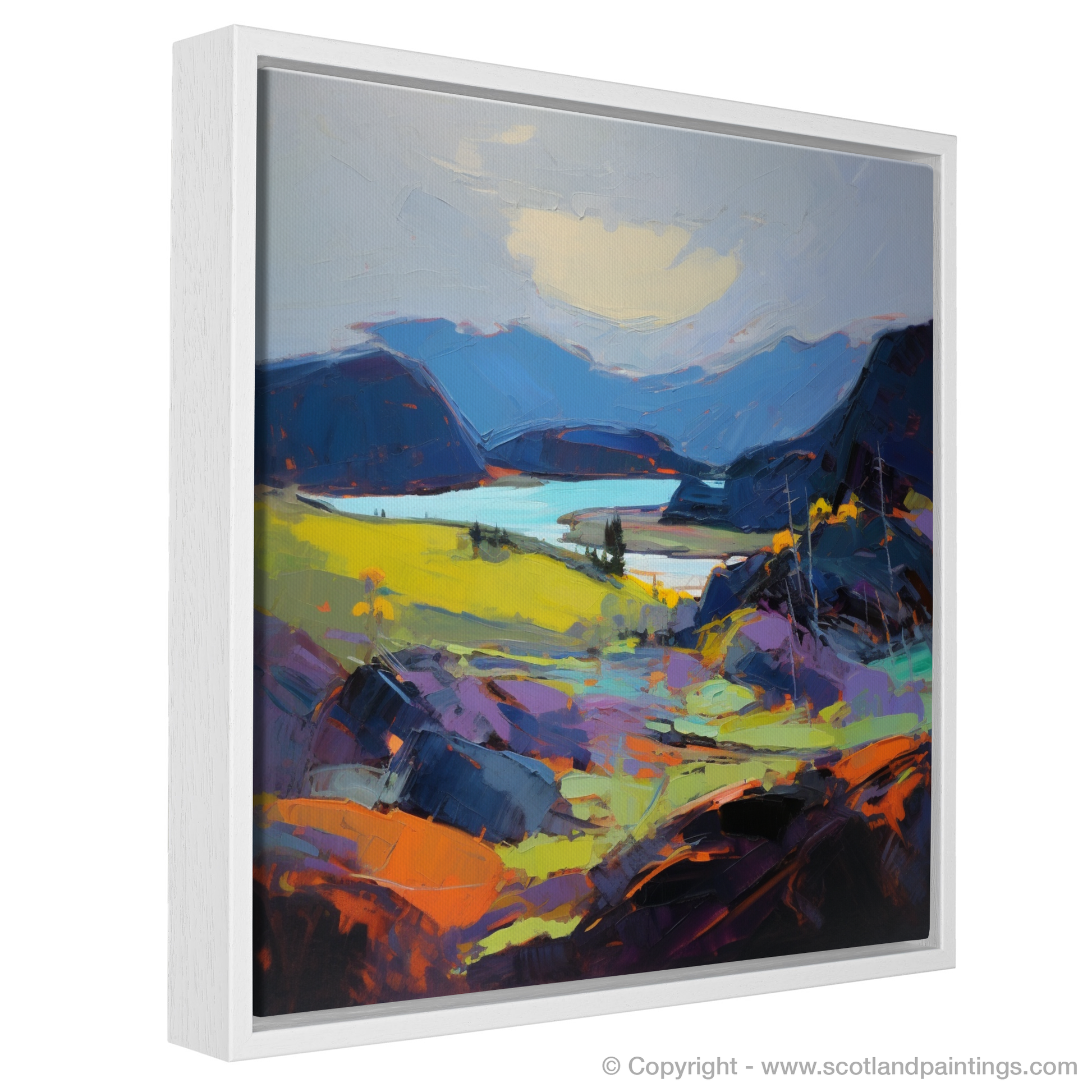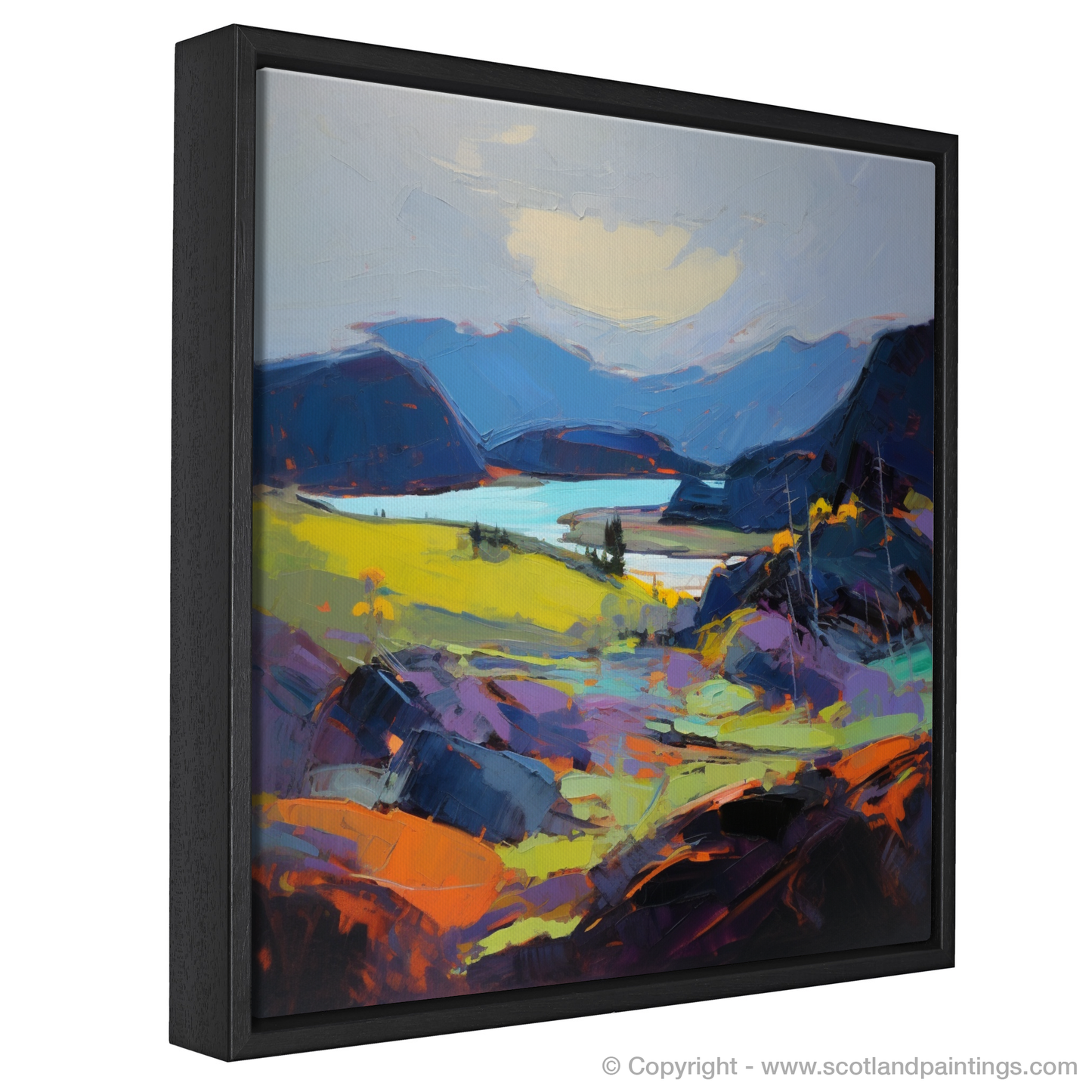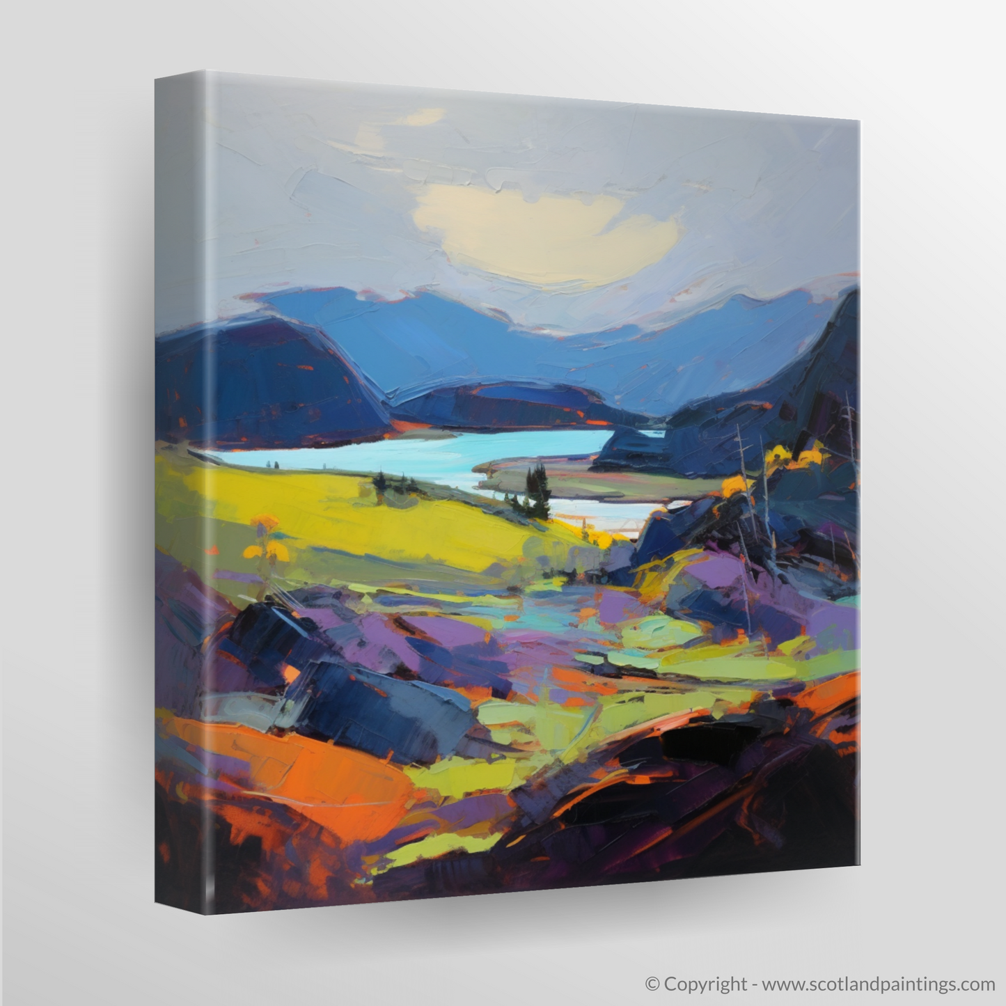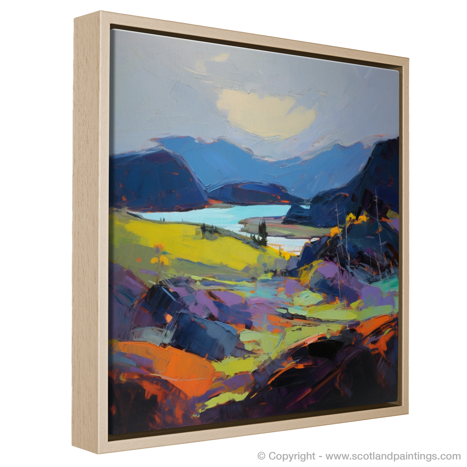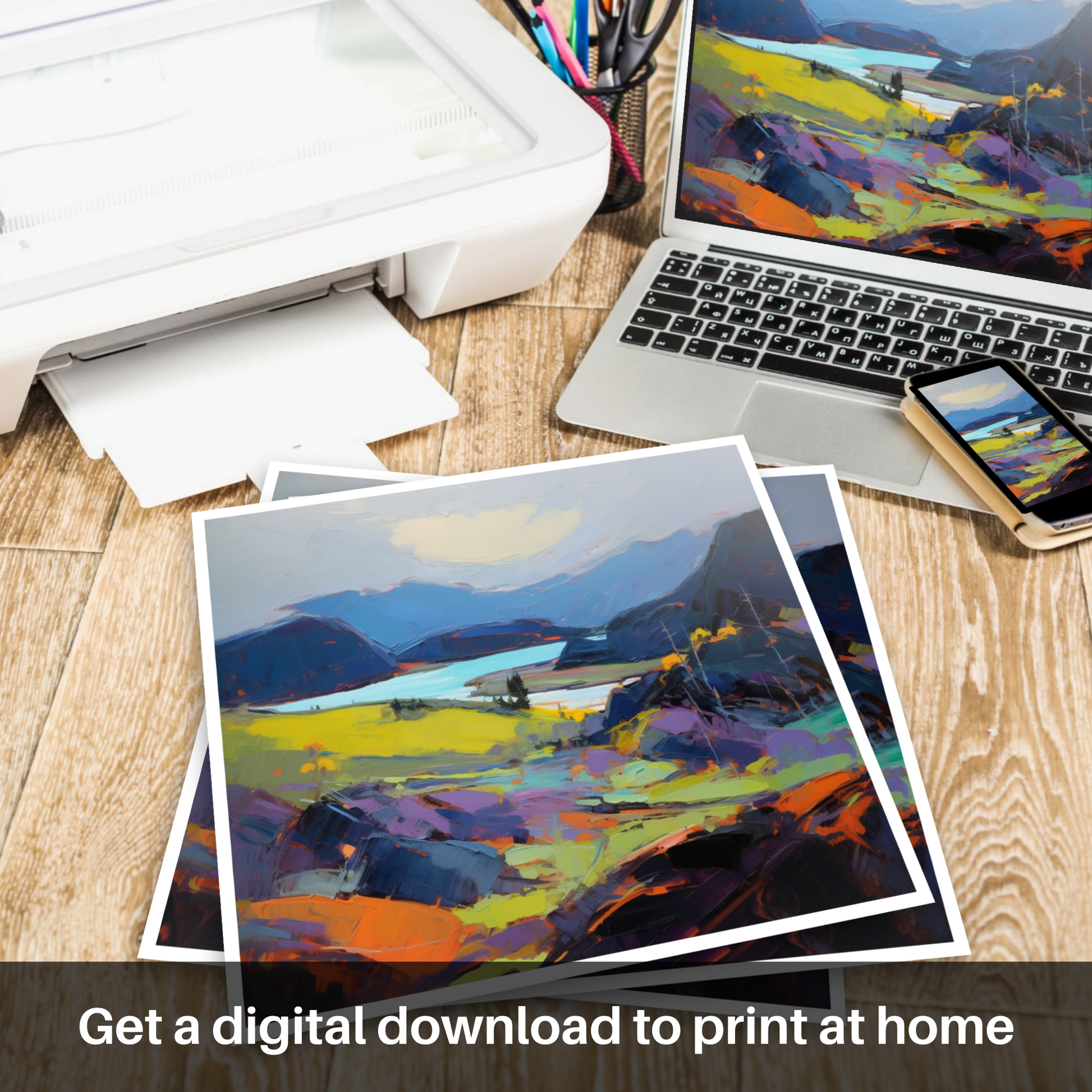 Swept by the moody hues of a storm-imbued sky, this evocative print captures the raw, untamed beauty of Scourie Bay. Bold strokes and striking contrasts define the essence of this Expressionist piece. The vibrant palette of intense oranges, purples, and yellows paints a lively foreground, clashing against the sombre blues and greys that dictate the brooding heavens above and tranquil waters below.