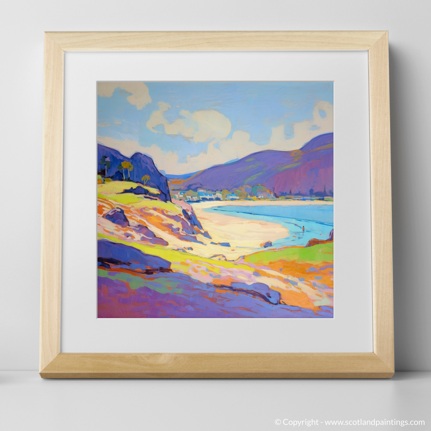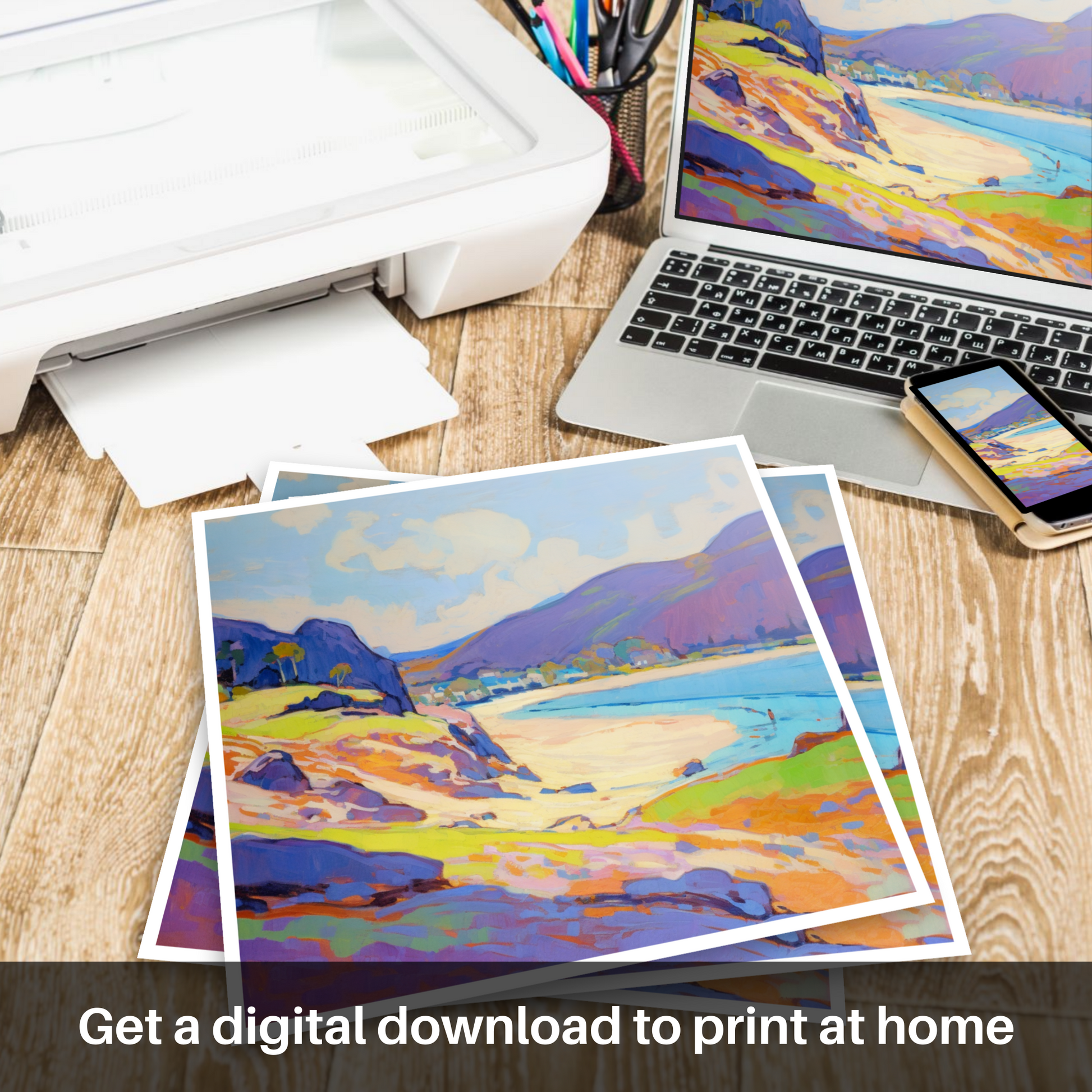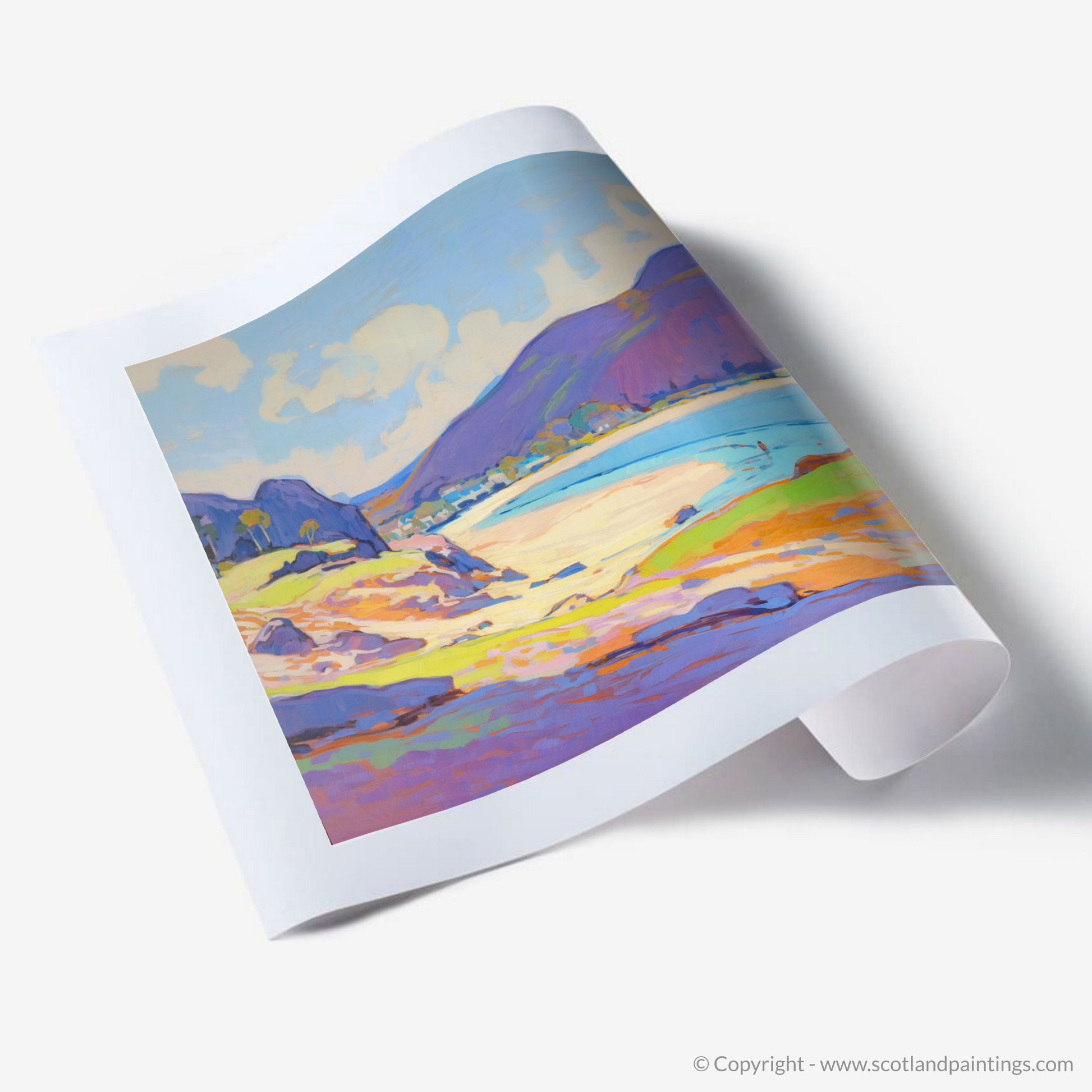 Immerse yourself in the vibrant hues of summer at Achmelvich Beach, Sutherland, as this impressionistic print captures the exquisite beauty of Scotland's treasured coastline. Brushstrokes dance across the canvas, conveying the gentle sway of verdant grass upon wind-swept dunes while the lavender shadows of distant hills whisper tales of quiet majesty.