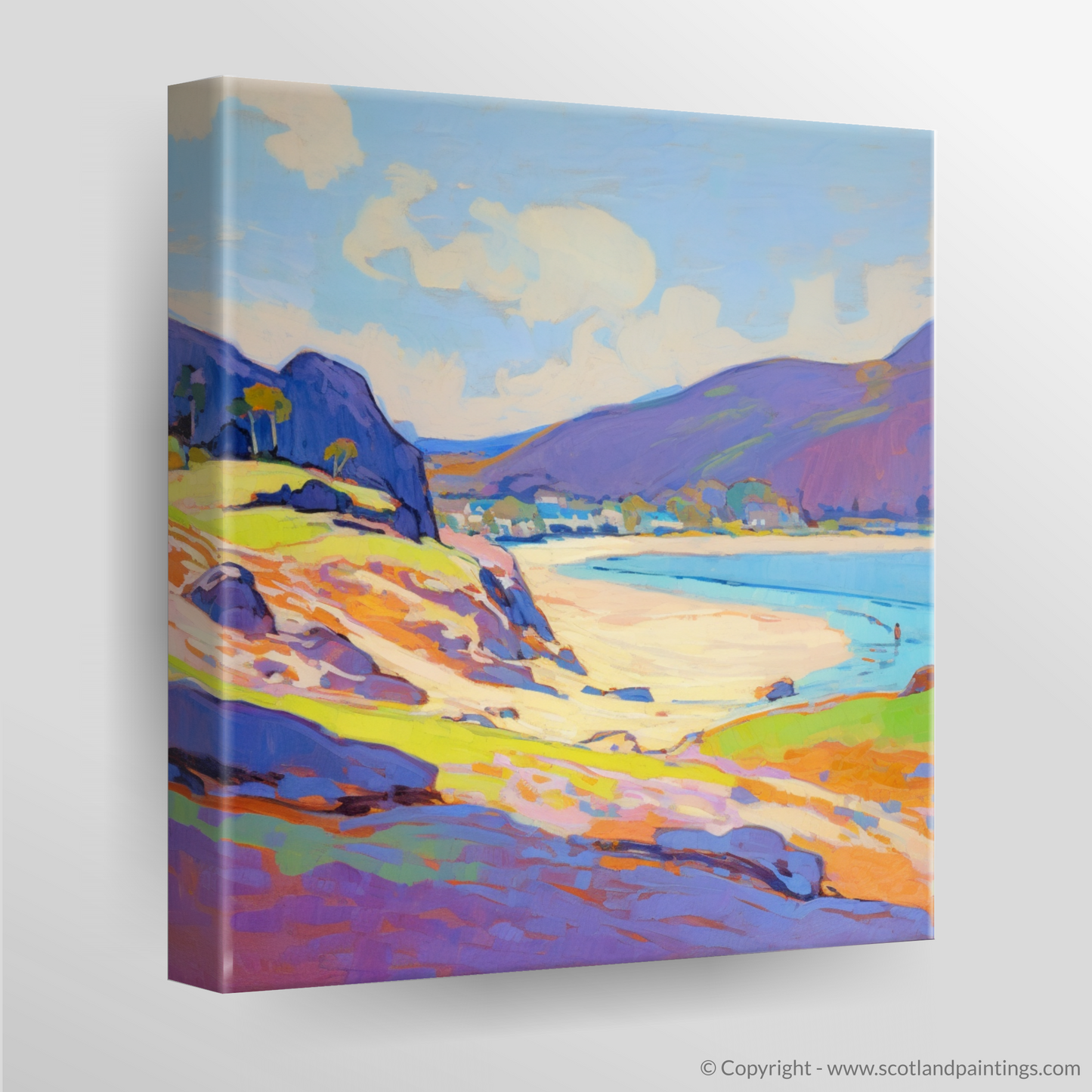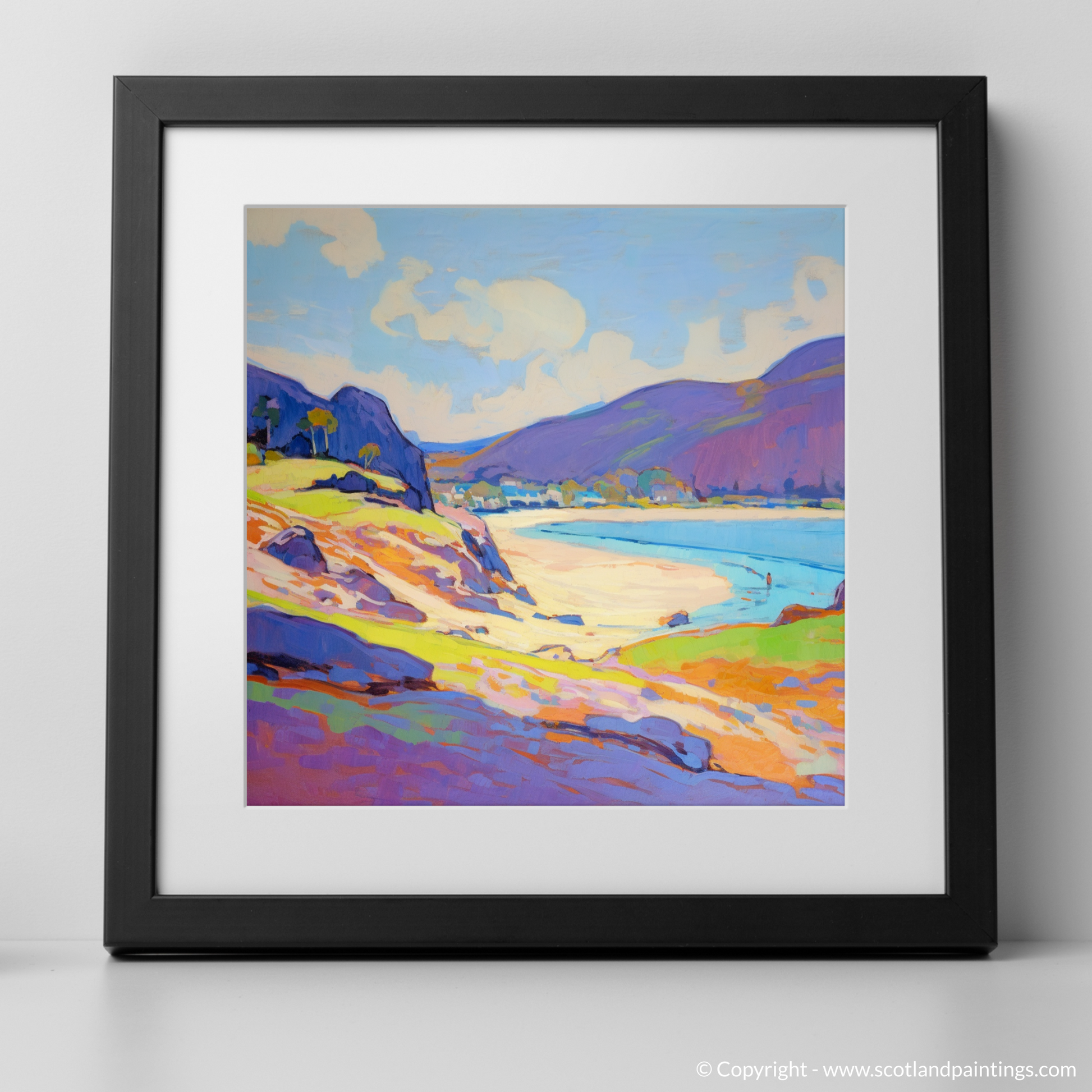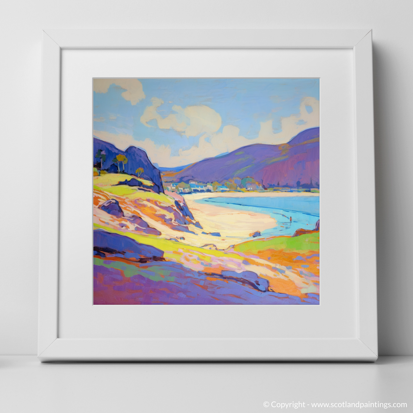 Immerse yourself in the vibrant hues of summer at Achmelvich Beach, Sutherland, as this impressionistic print captures the exquisite beauty of Scotland's treasured coastline. Brushstrokes dance across the canvas, conveying the gentle sway of verdant grass upon wind-swept dunes while the lavender shadows of distant hills whisper tales of quiet majesty.